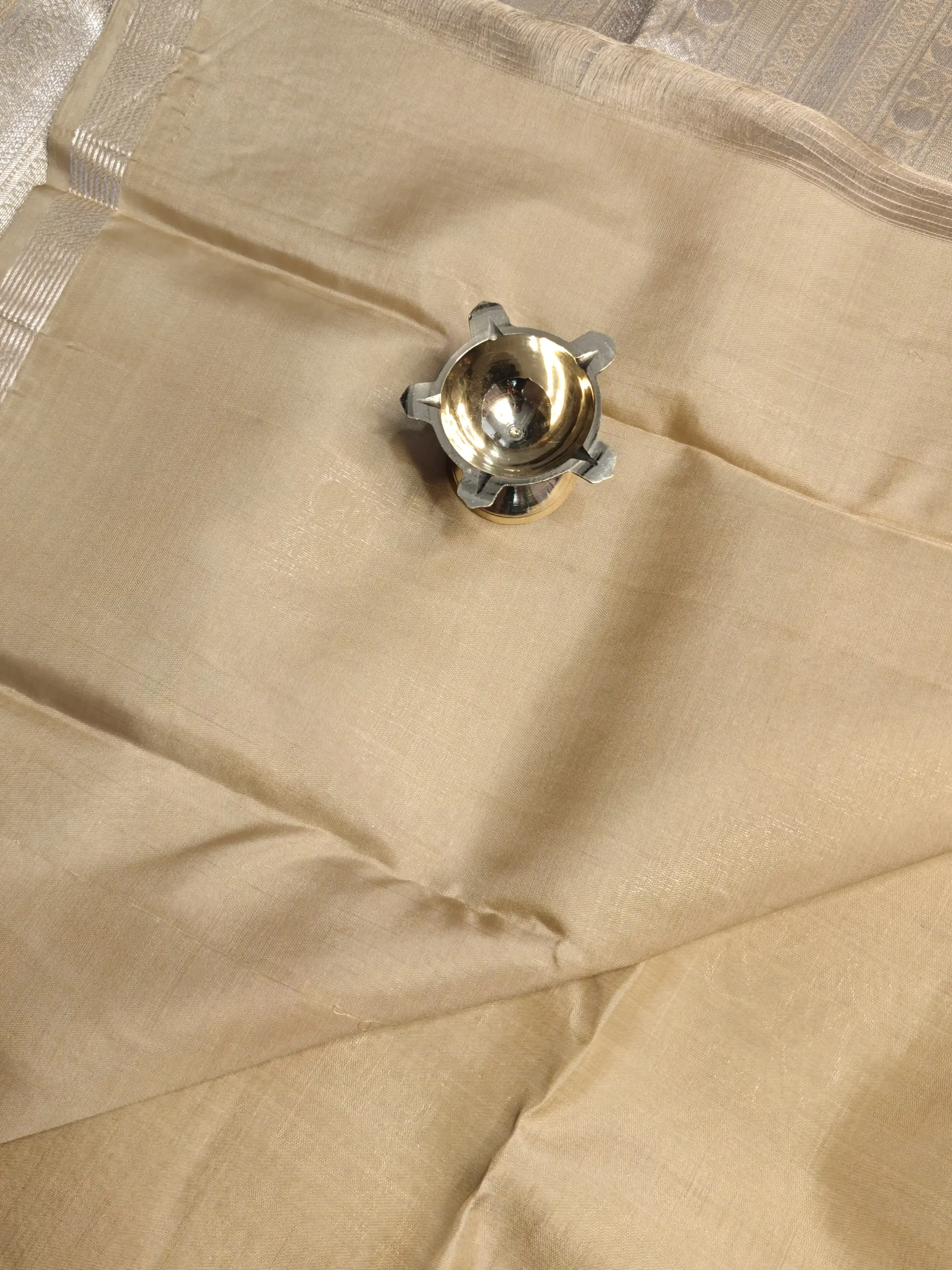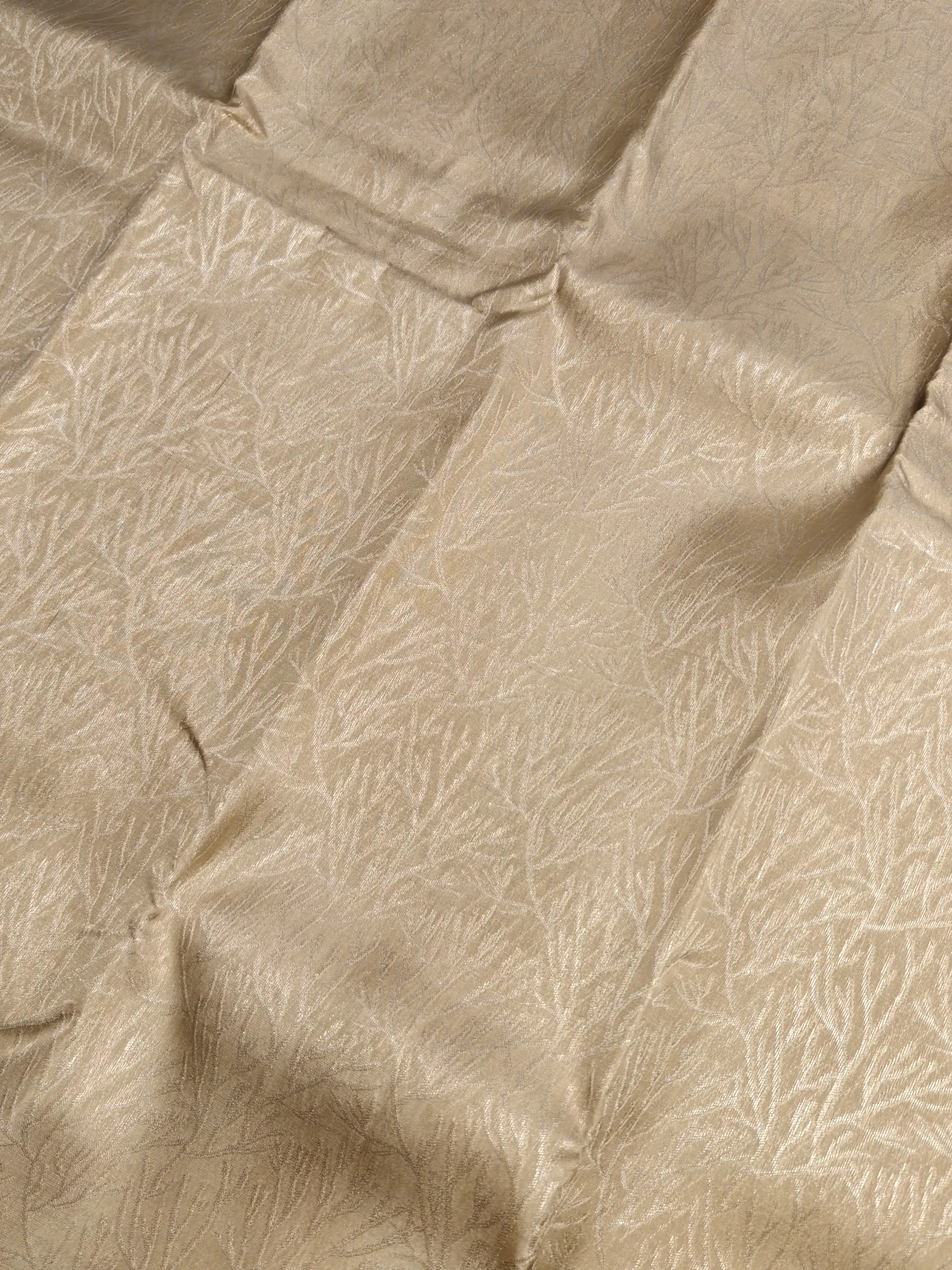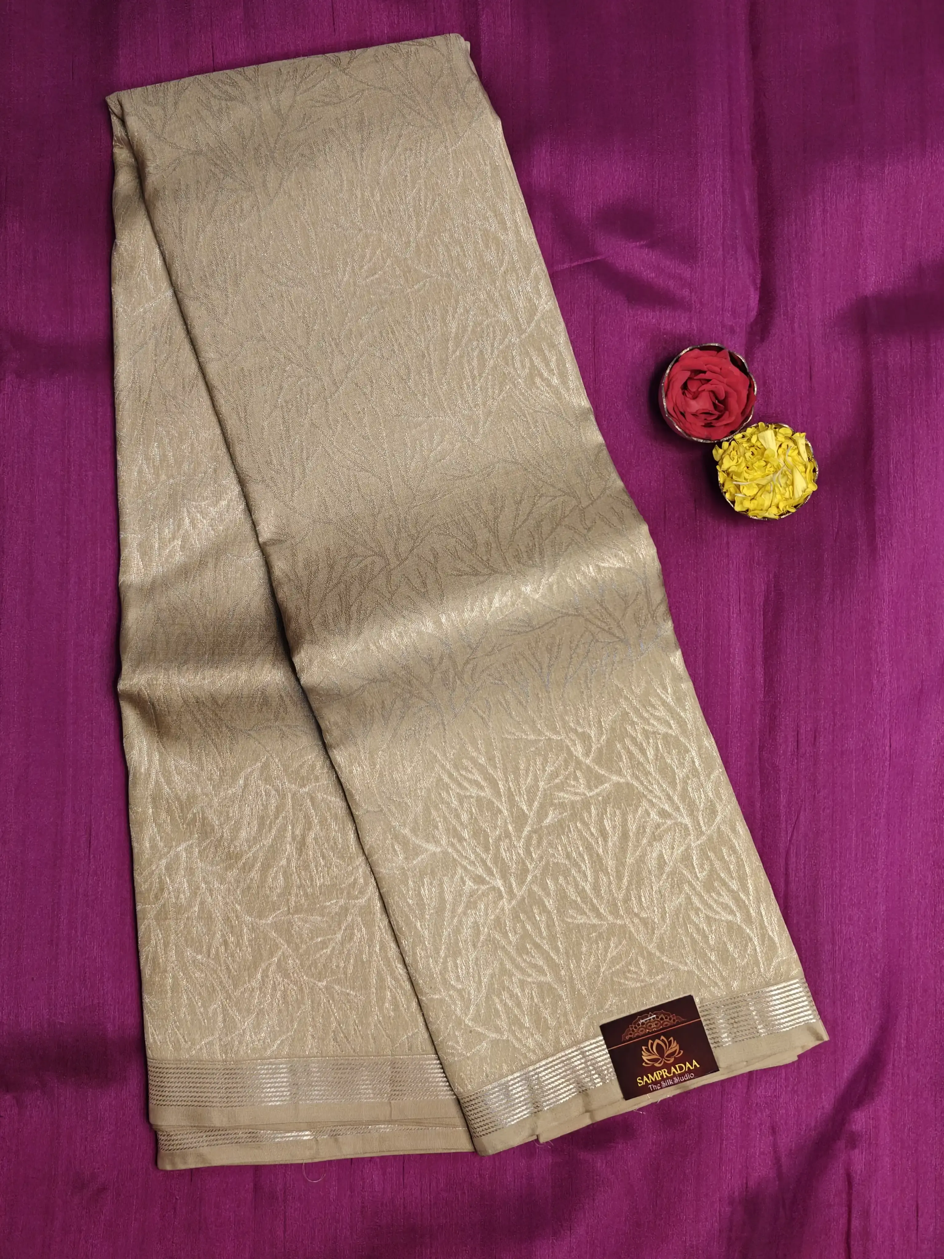 An elegant beige silk saree featuring a subtle self design that enhances its understated beauty. The soft sheen of the silk and the tone-on-tone patterns create a refined, graceful look, making it an ideal choice for weddings, festive gatherings, and sophisticated day occasions.
