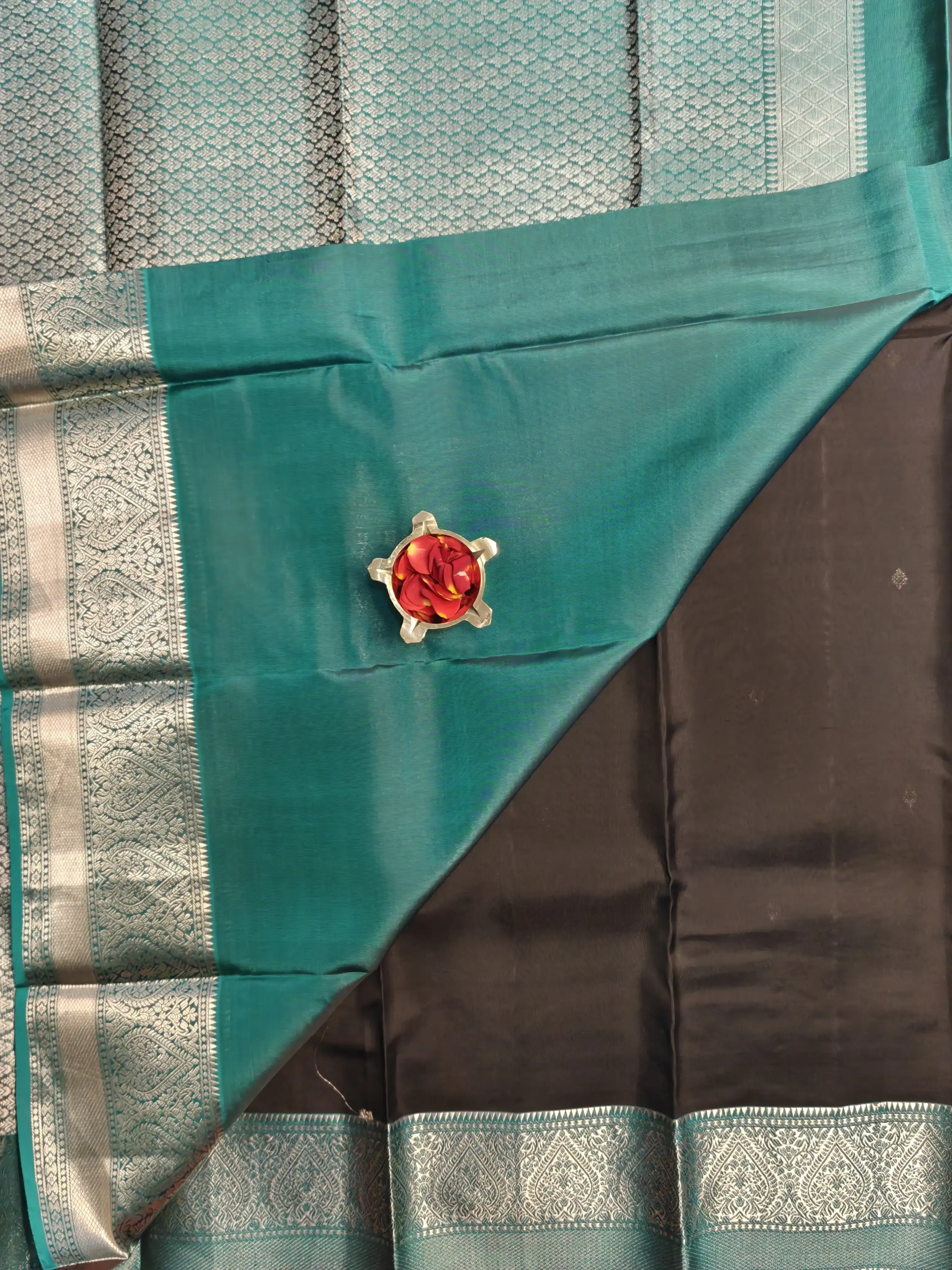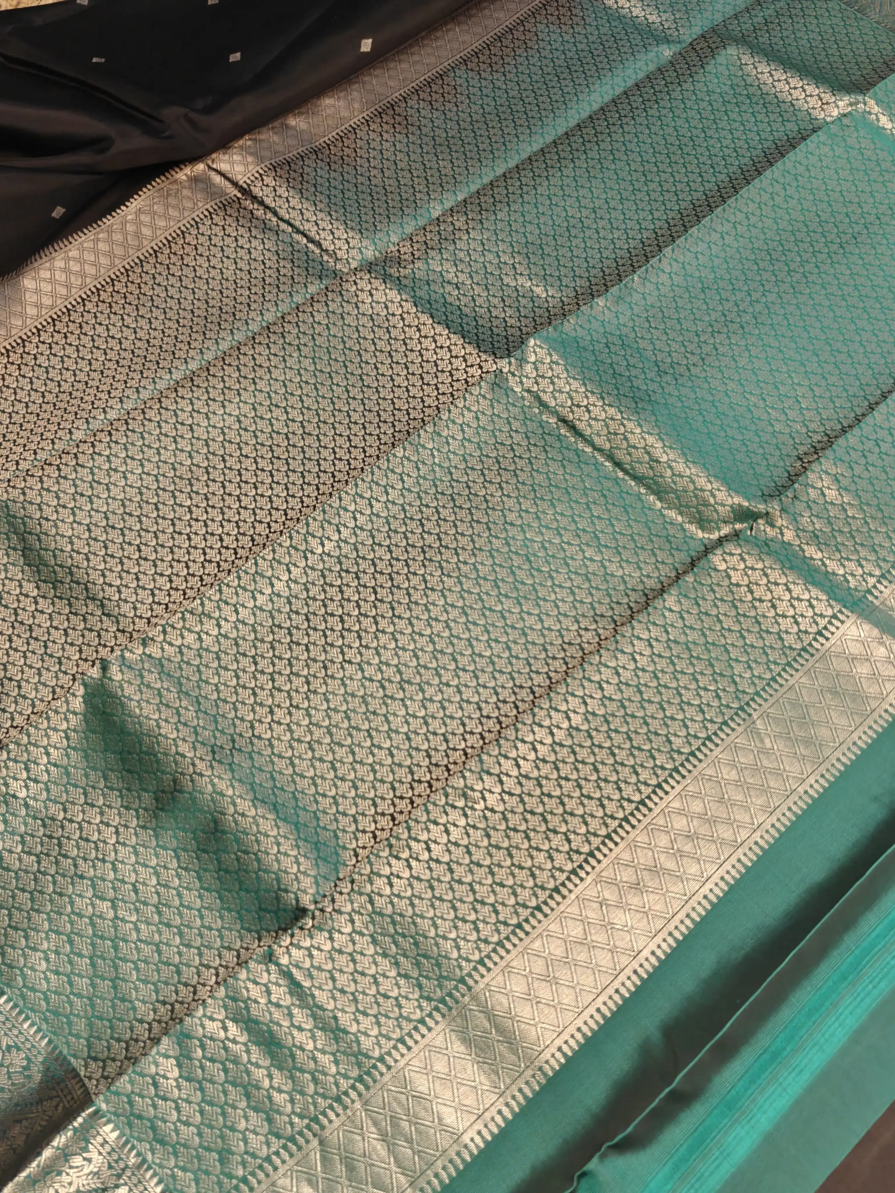 This classic black silk saree is adorned with delicate small silver motifs scattered gracefully across the body, adding a subtle shimmer. The look is beautifully framed by a teal blue border, creating a rich contrast that elevates the saree’s sophistication. Perfect for evening celebrations, festive occasions, and timeless ethnic style, this saree blends boldness with understated elegance 🖤💙✨