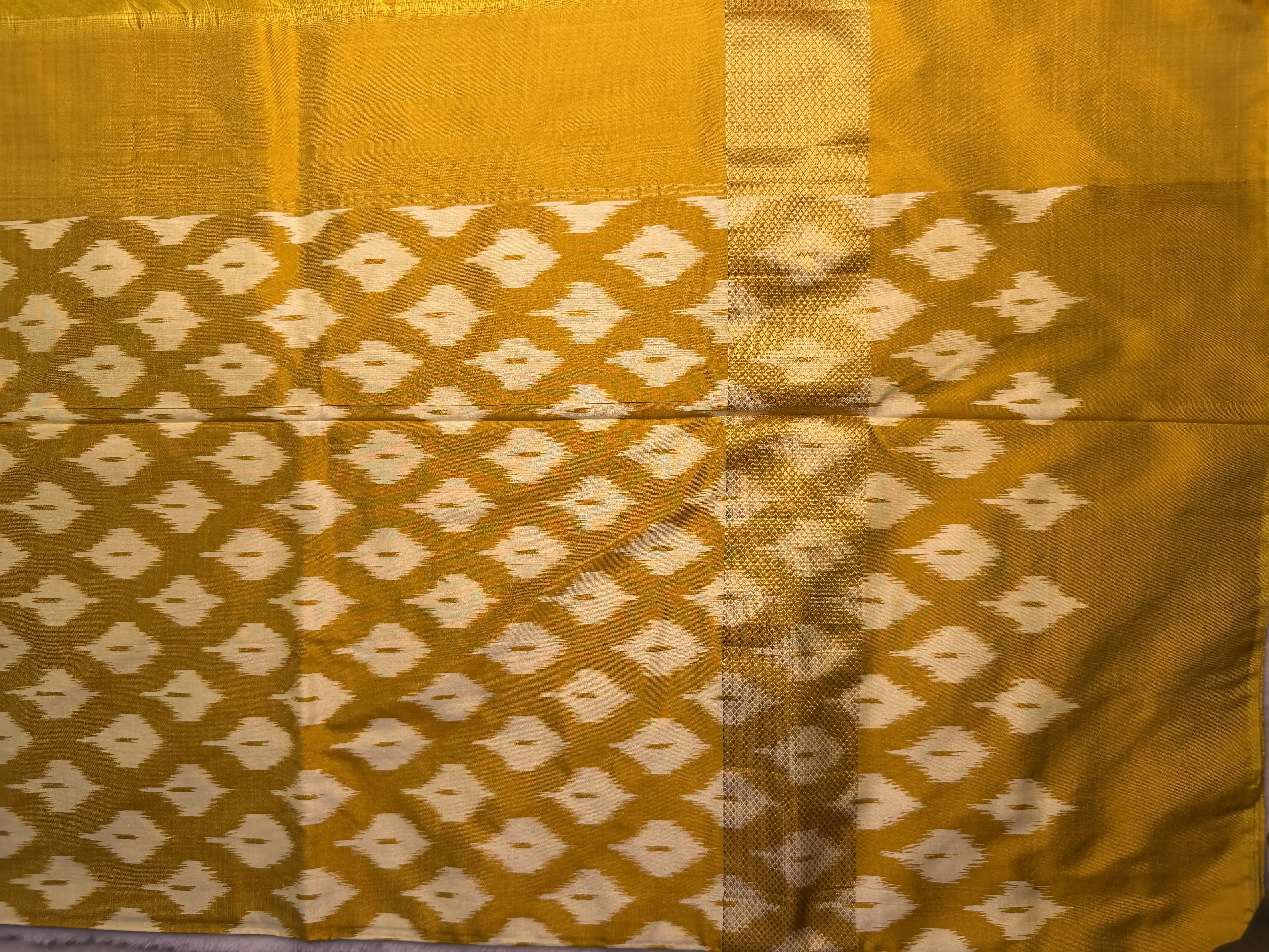 This Poochampalli silk saree in a striking black and mustard yellow combination showcases classic weaving with a rich, regal appeal. The natural sheen and structured drape of Poochampalli silk enhance its elegant silhouette, making it a standout choice.