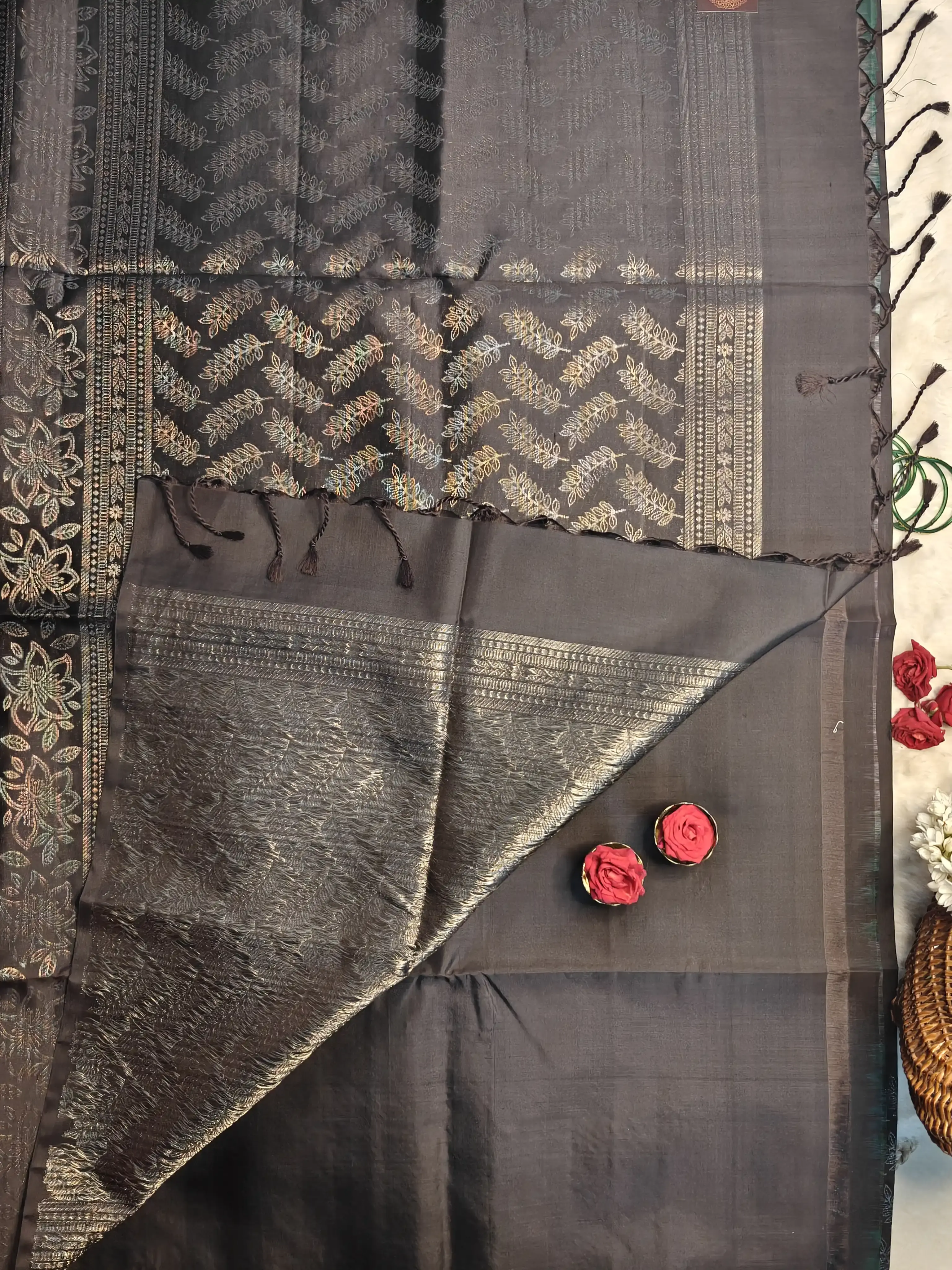 Timeless, powerful, and effortlessly elegant — our Black Soft Silk Saree with Silver Leaf Motifs on the Border is designed for women who love understated luxury with a bold presence. The deep black body creates a striking canvas, while the silver leaf motif border adds a refined shimmer that elevates the saree with contemporary sophistication.