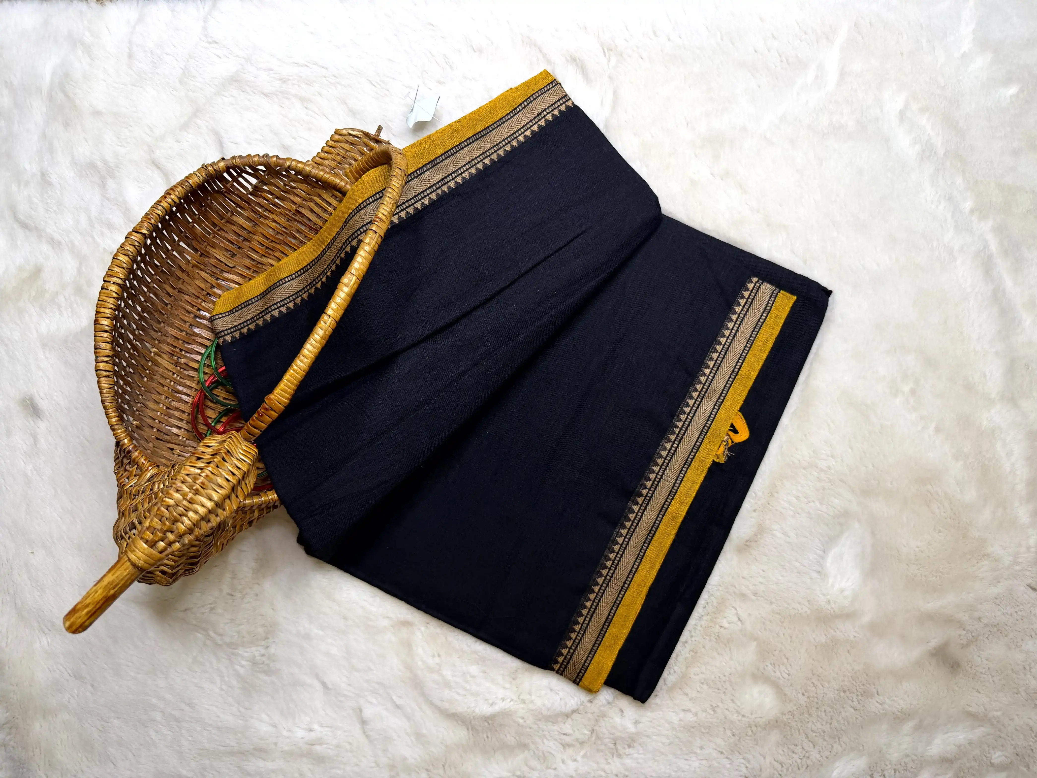This black Dhaniakhali cotton saree is beautifully accentuated by a vibrant mustard yellow border, creating a striking and sophisticated look. Lightweight and breathable, it’s perfect for festive occasions, cultural gatherings, and everyday ethnic style — a graceful blend of classic handloom charm and modern flair 🖤💛