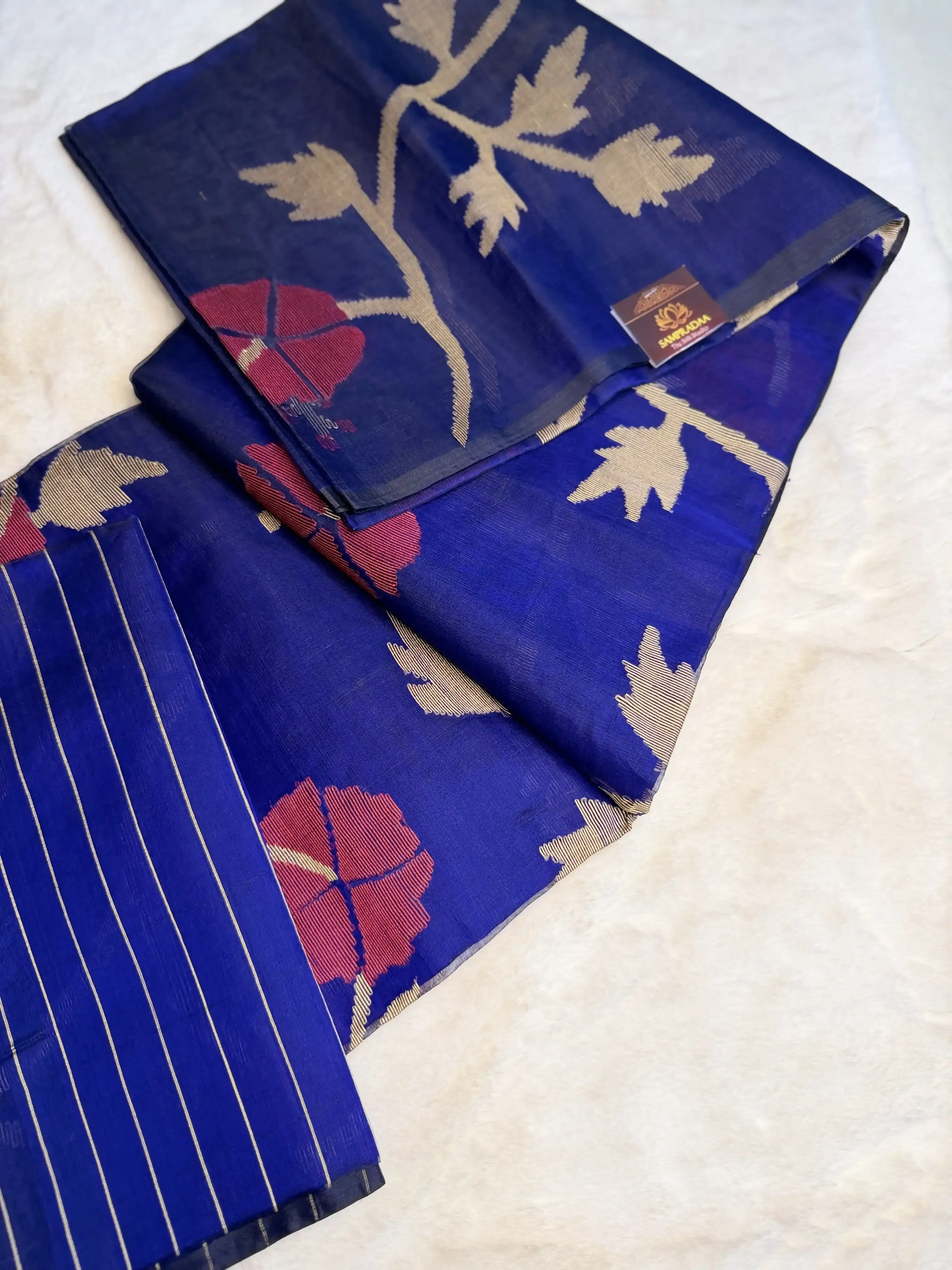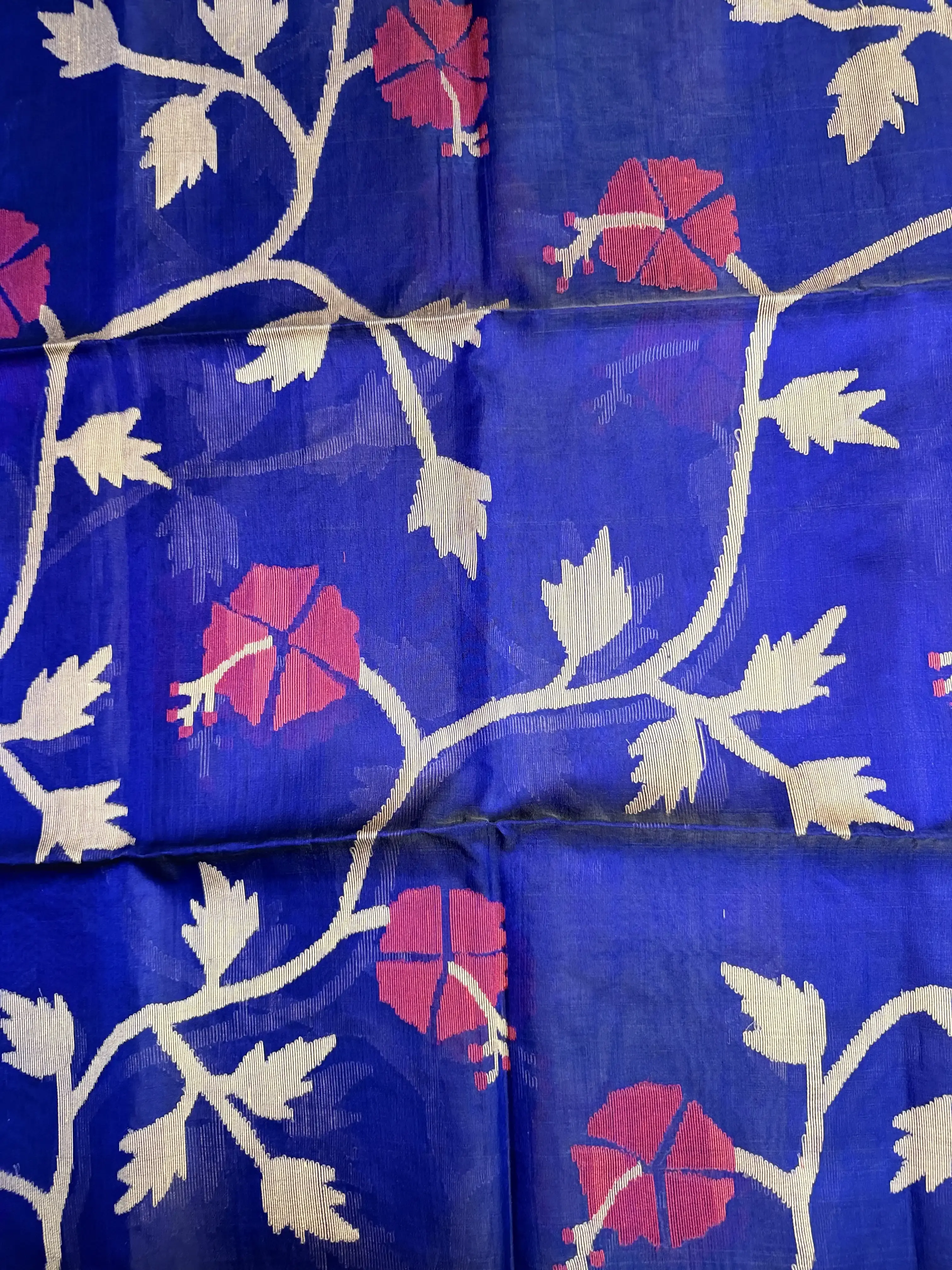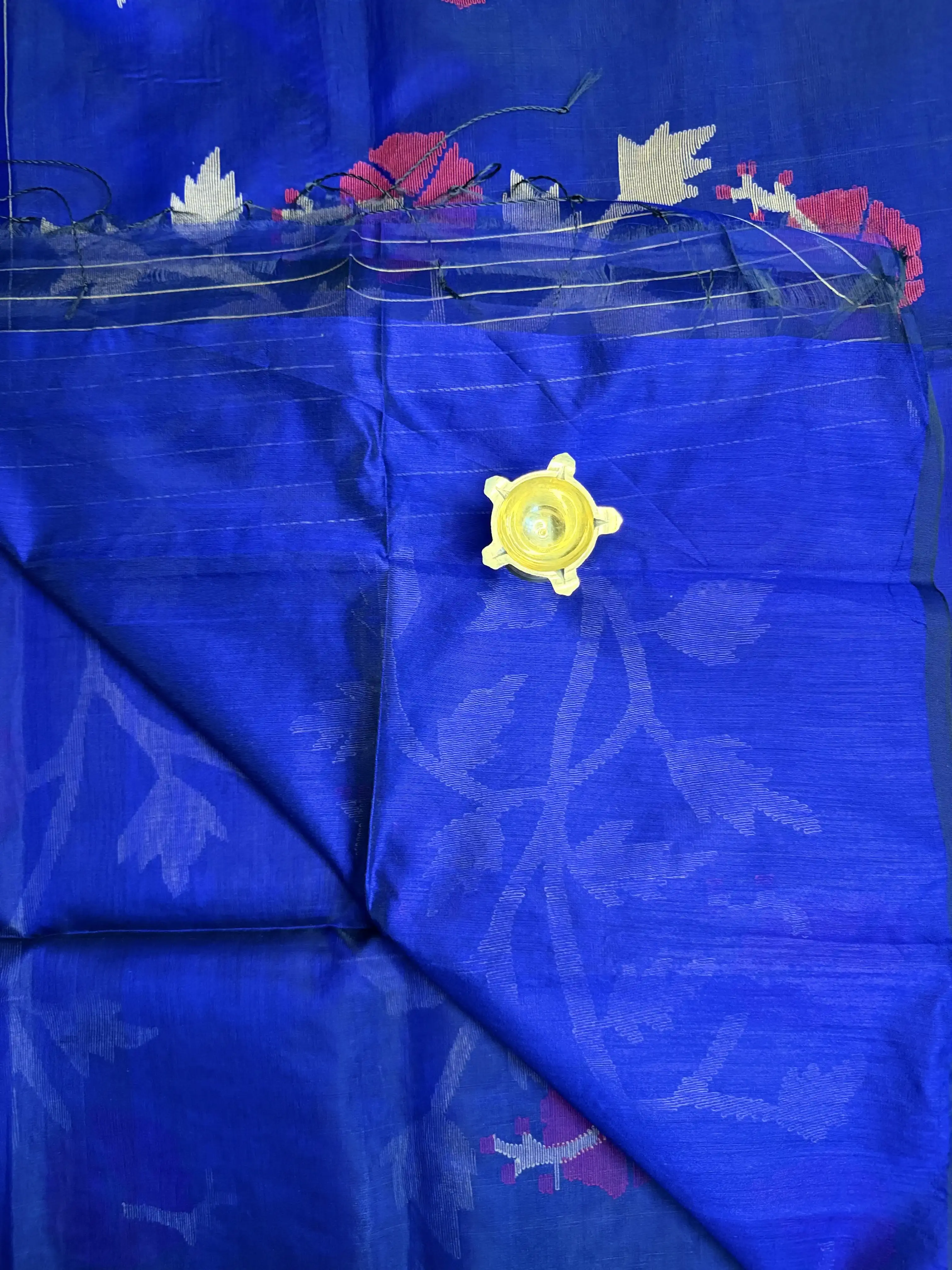 This pure Dhakai cotton saree in a beautiful blue shade is adorned with intricate Jamdhani work, reflecting fine craftsmanship and heritage weaving techniques. Soft, lightweight, and breathable, it offers a comfortable drape that blends tradition with everyday sophistication.