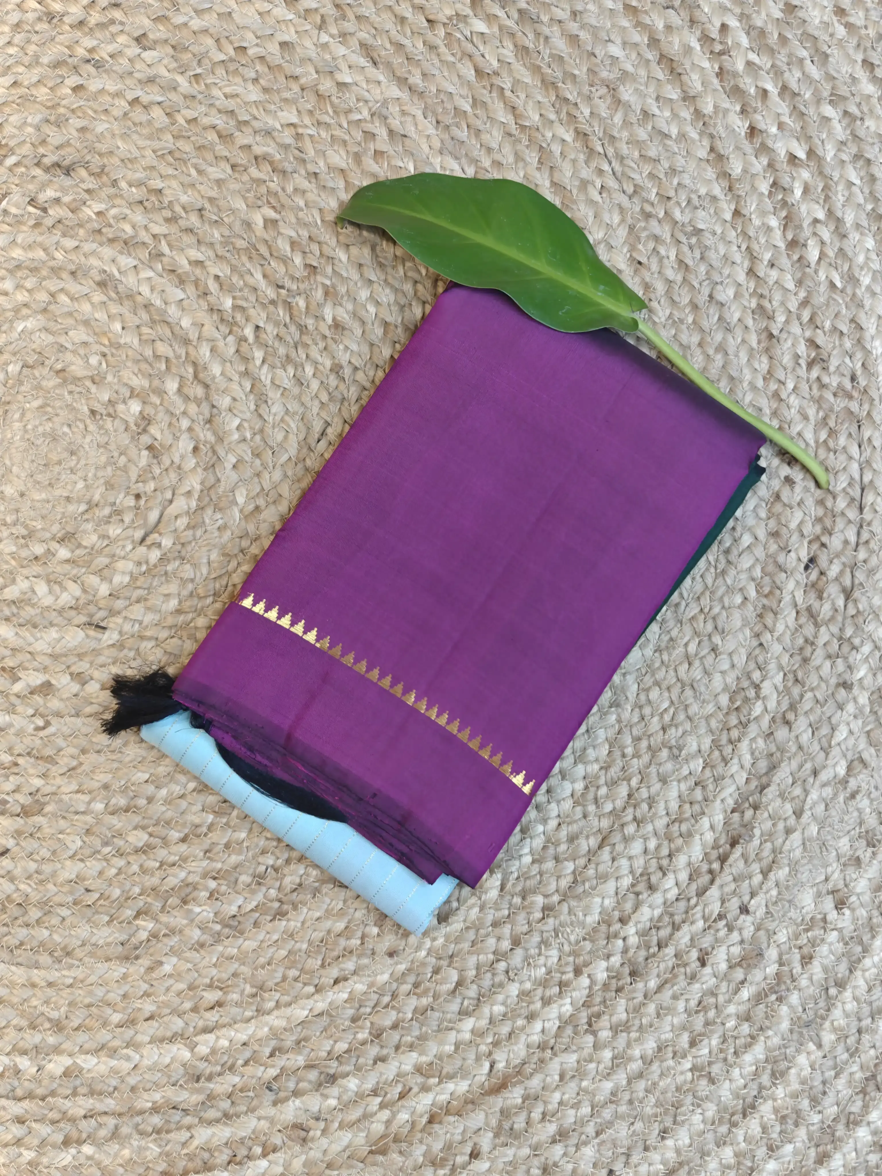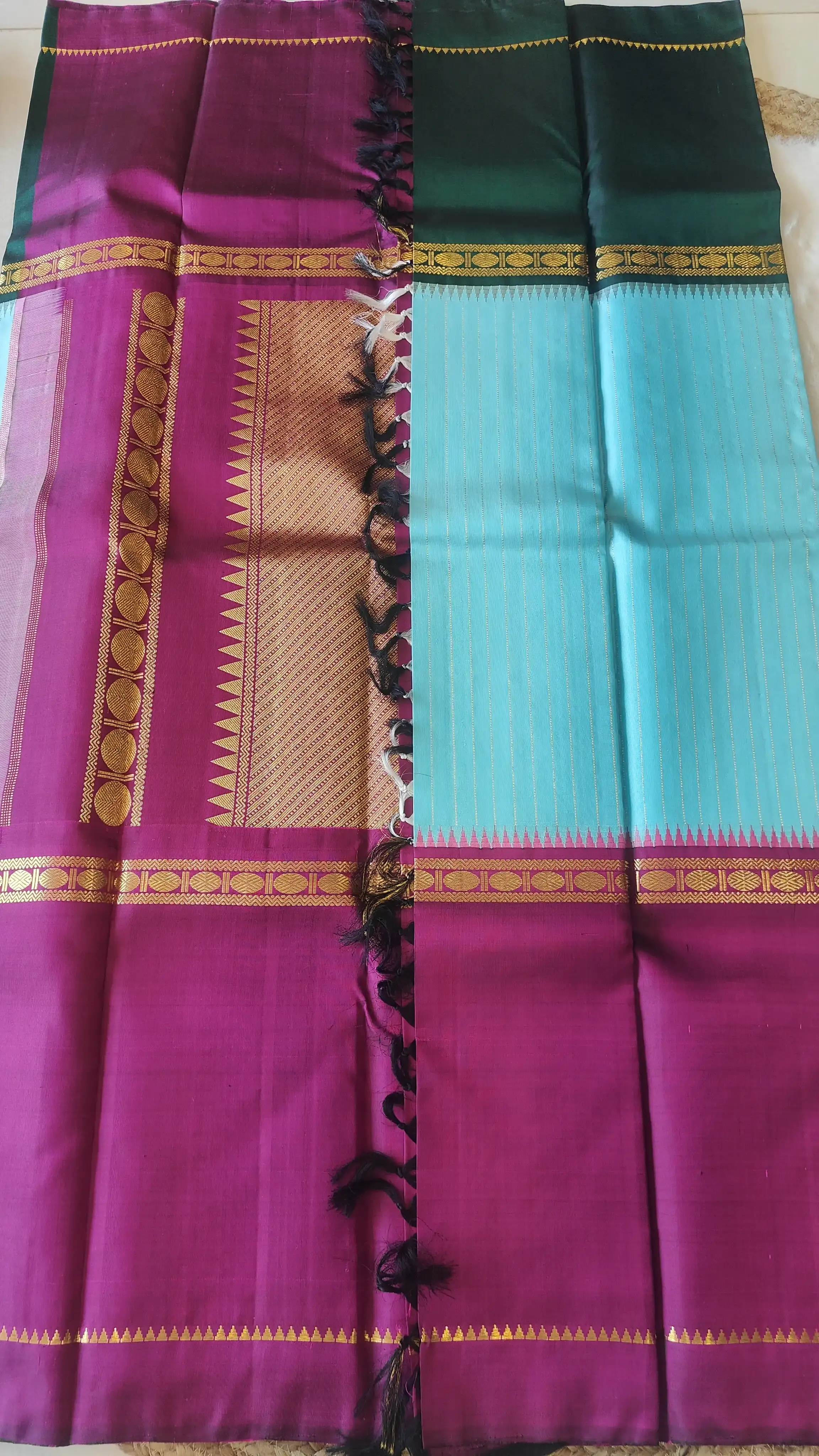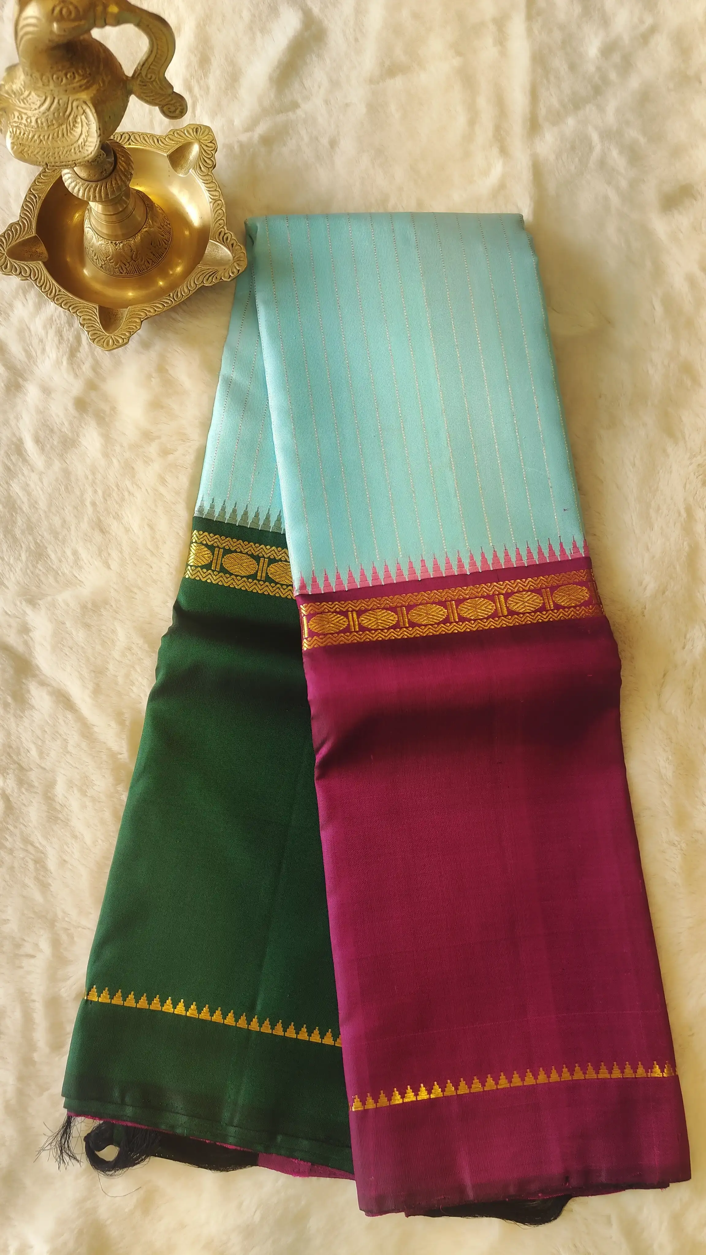The calm elegance of a sky blue silk body is elevated by a bold green and maroon Bentex Ganga Jamuna border, symbolising prosperity and harmony. Paired with a rich pallu, this saree embodies the timeless beauty of South Indian festive attire.