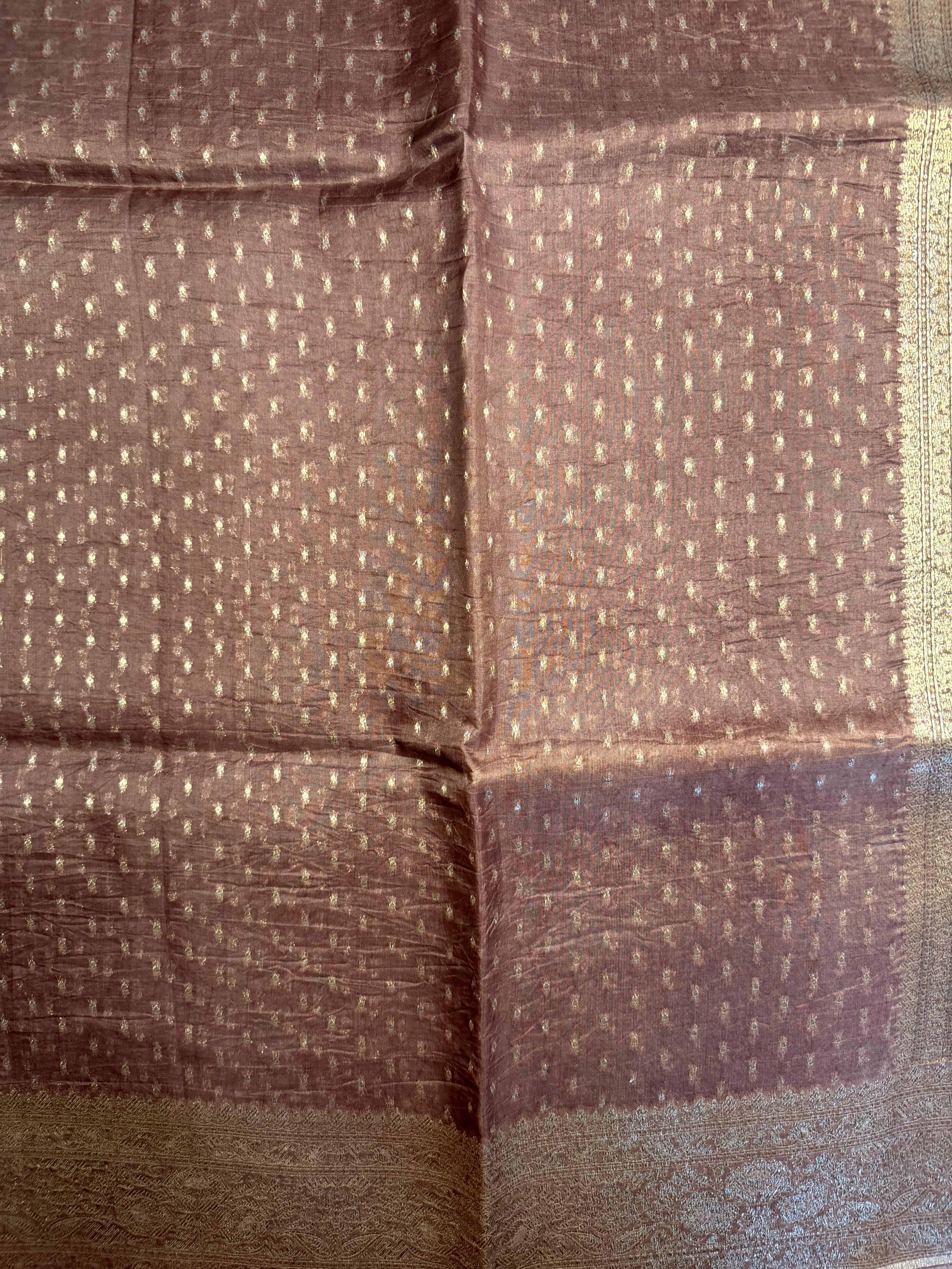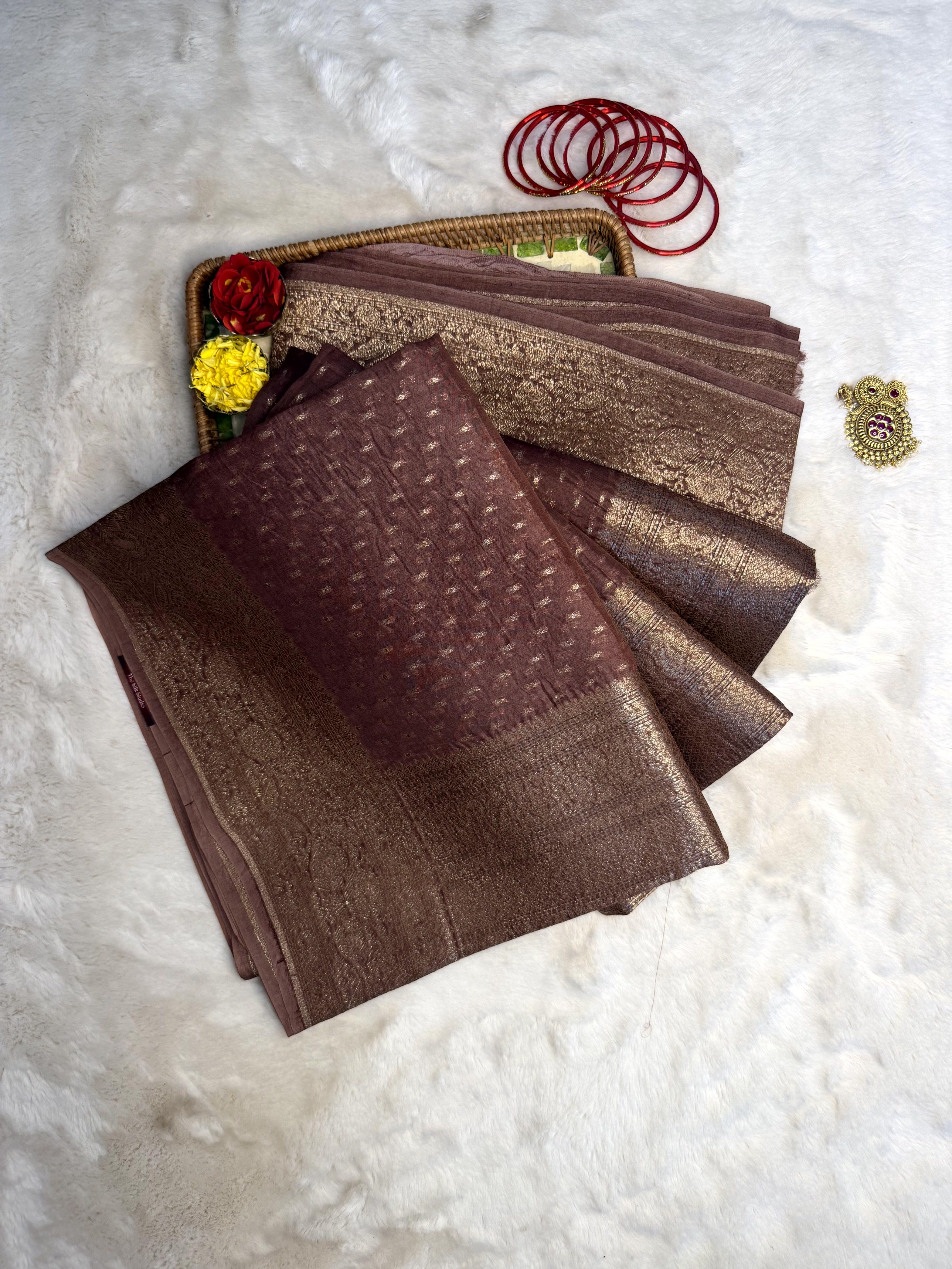 This rich brown pure Kora Organza saree is adorned with delicate small zari buttas scattered gracefully across the body, adding texture and shimmer without overpowering its natural sophistication.