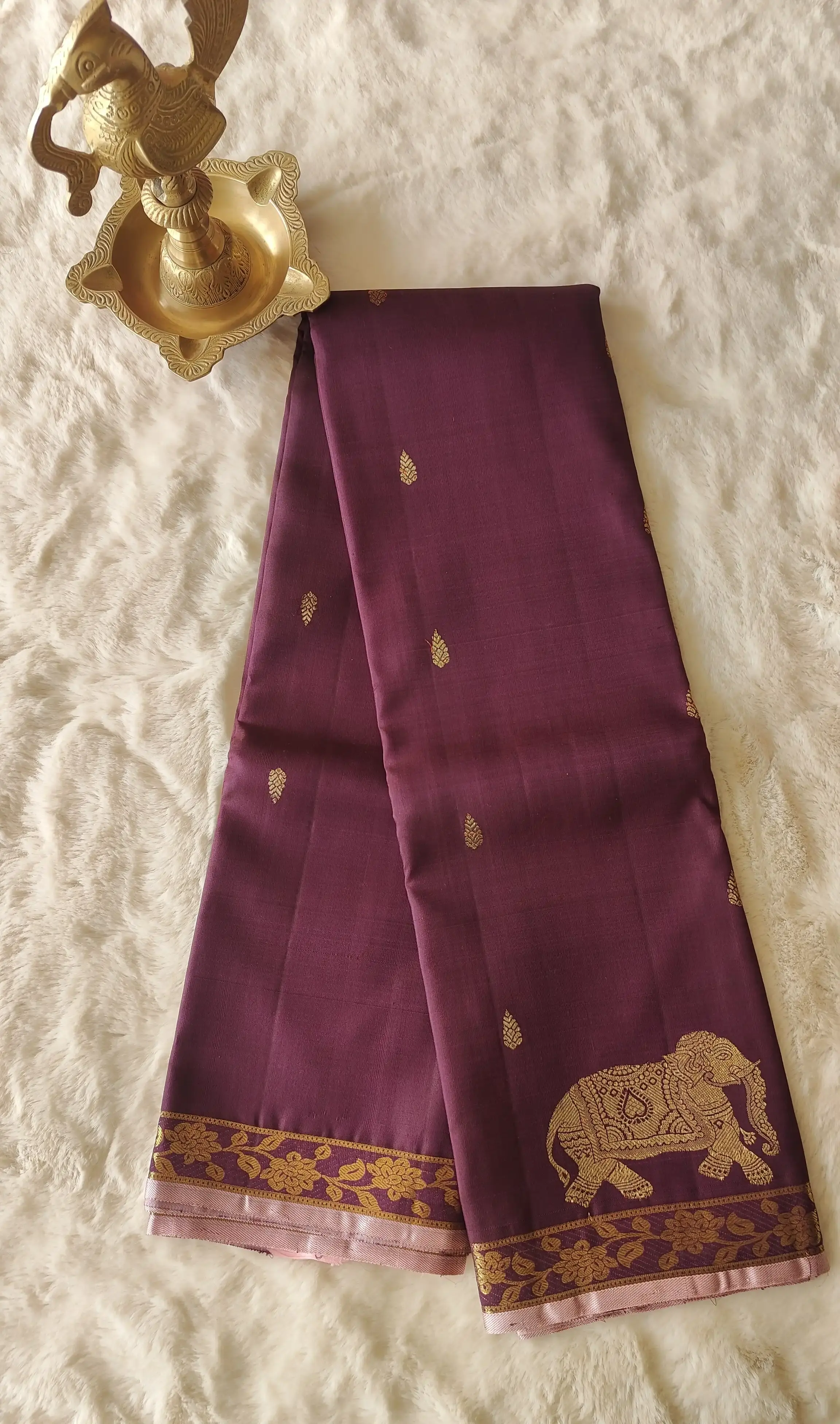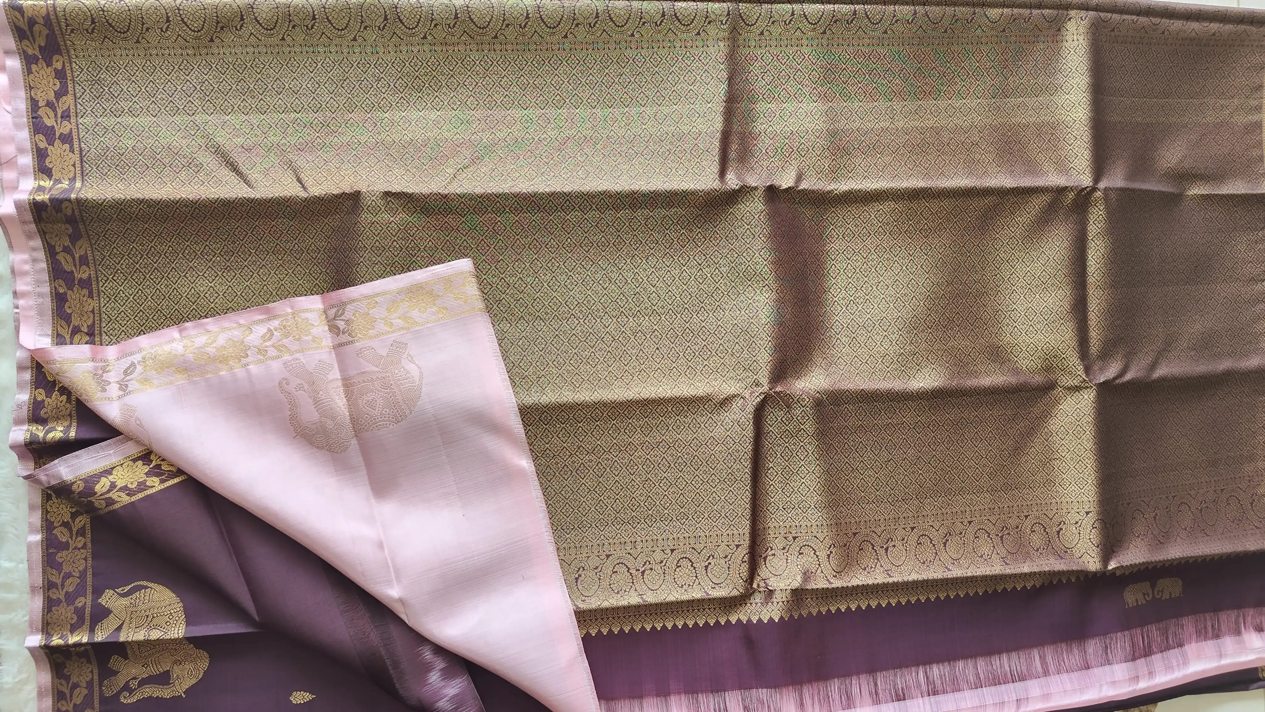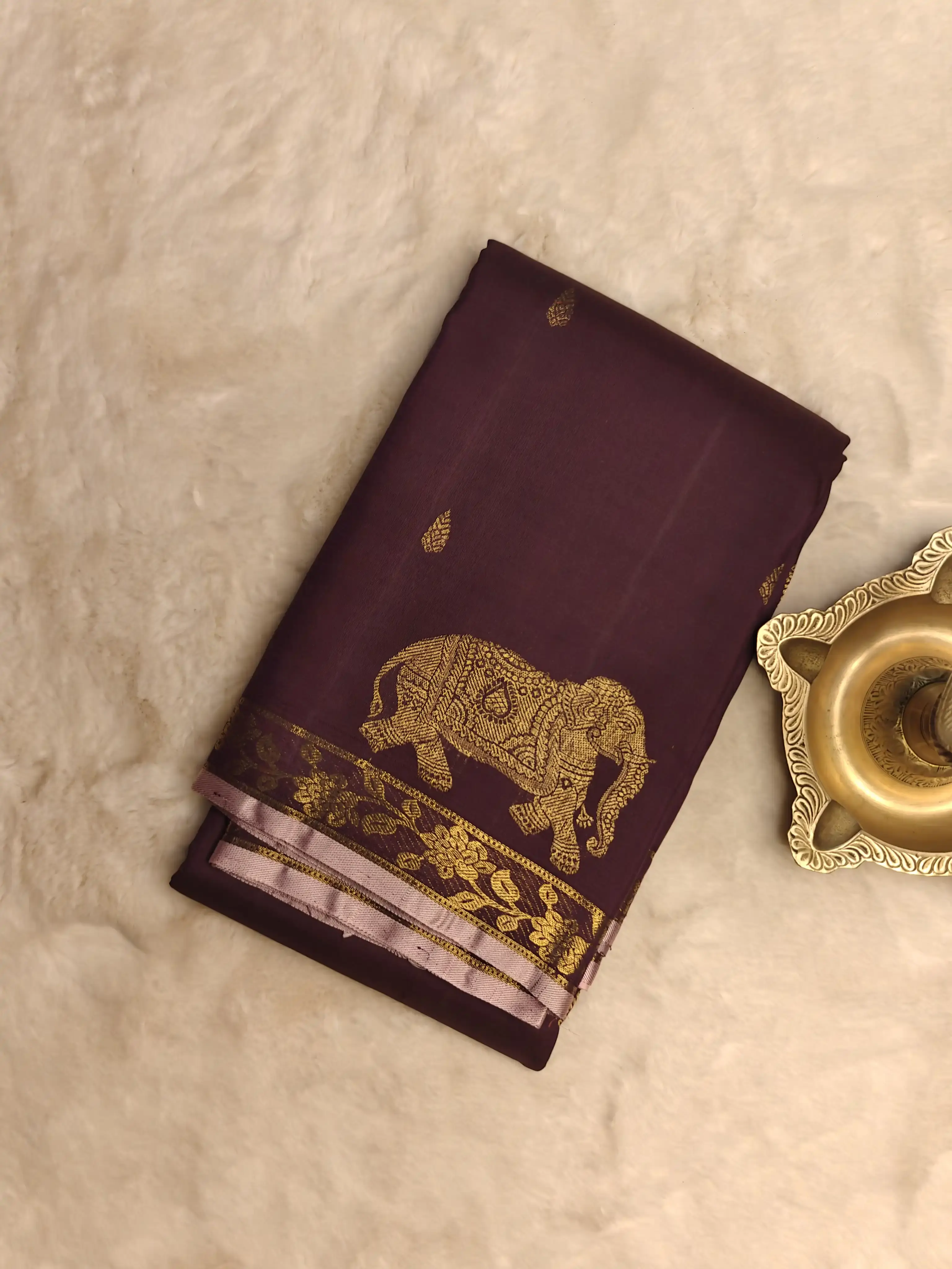 Rich chocolate brown silk meets intricate elephant motif detailing along the border, creating a statement of cultural opulence. Complemented by a baby pink blouse, this pure Kanchipuram saree offers a refined contrast that feels both royal and feminine.