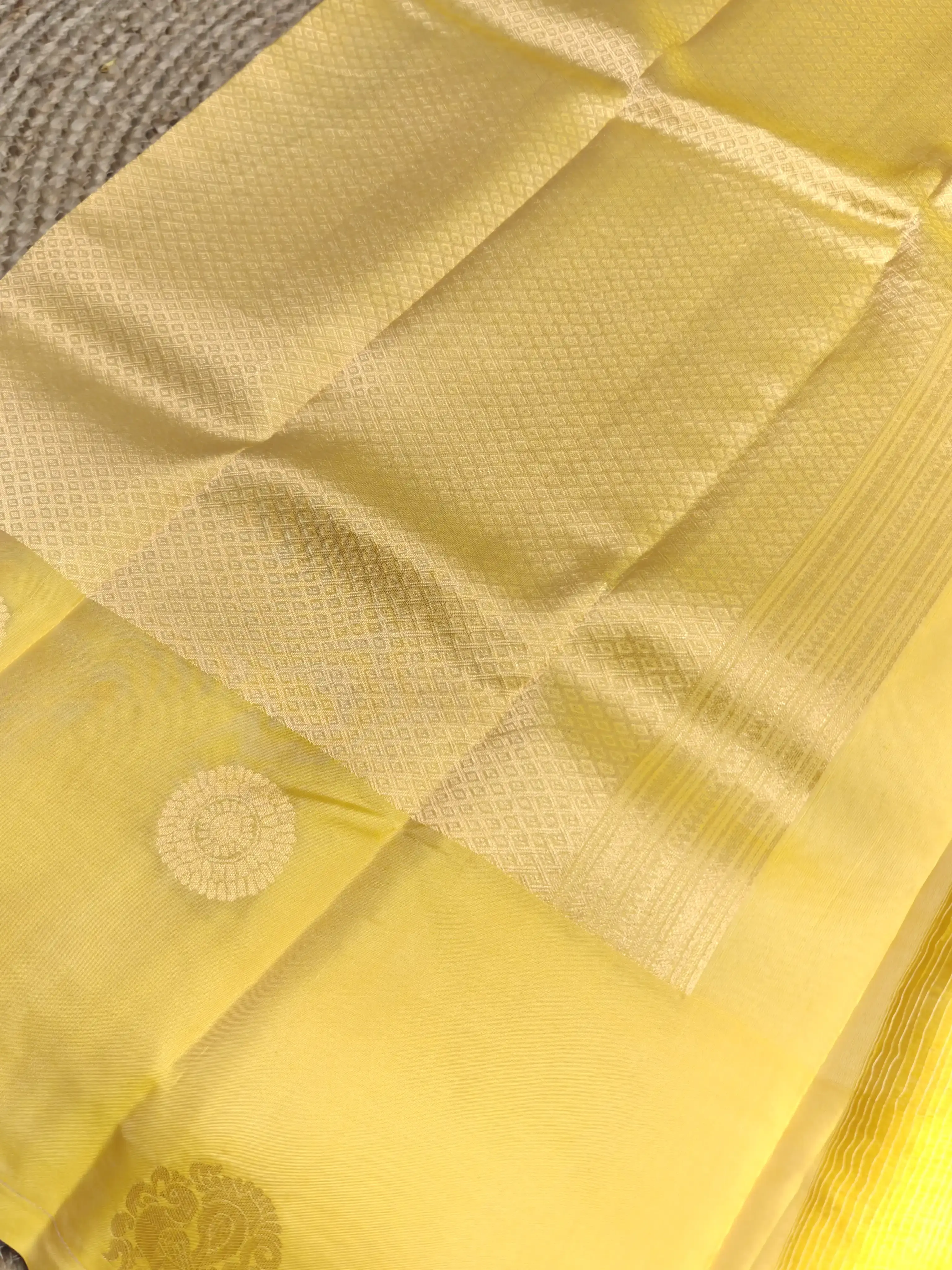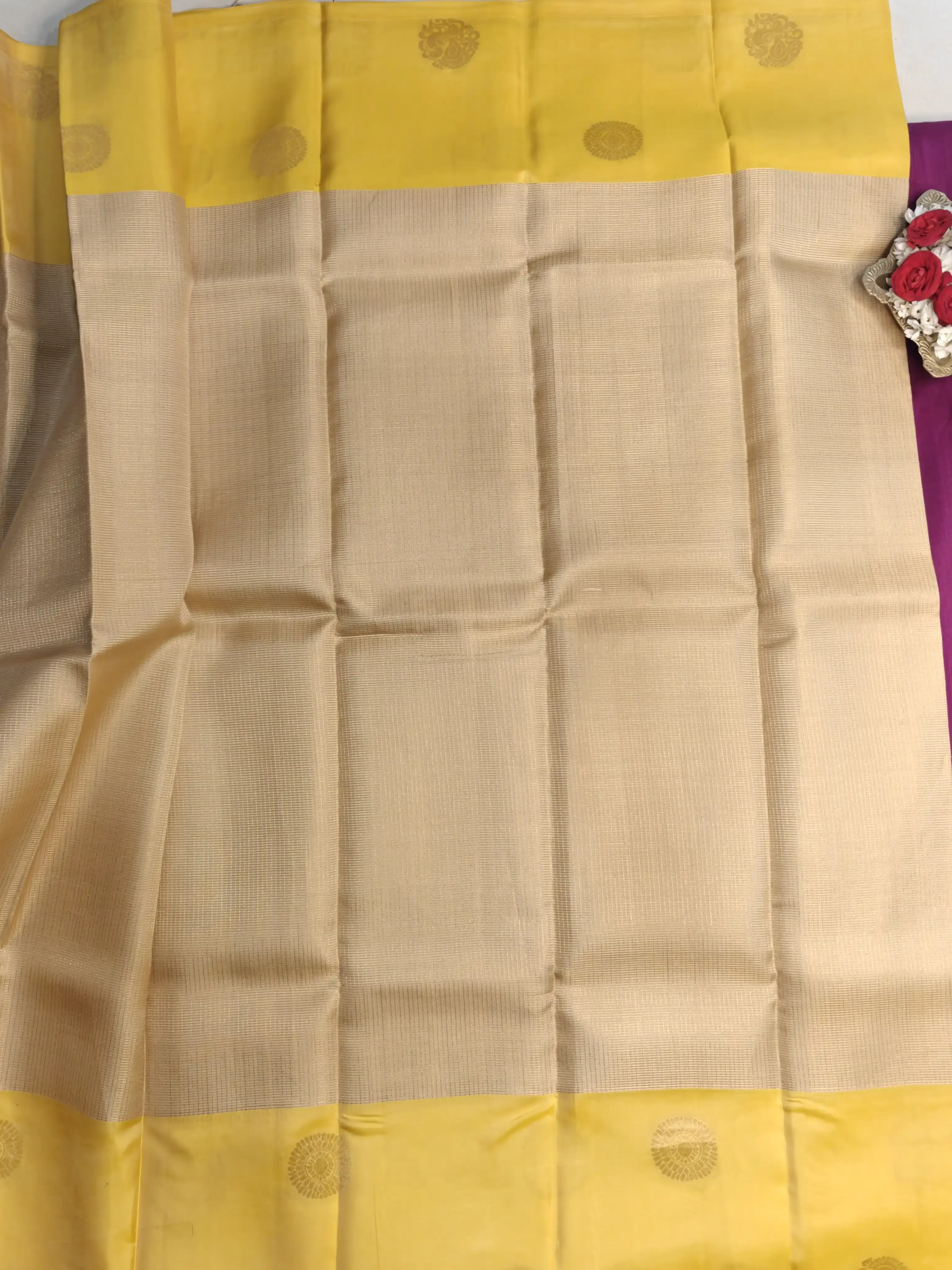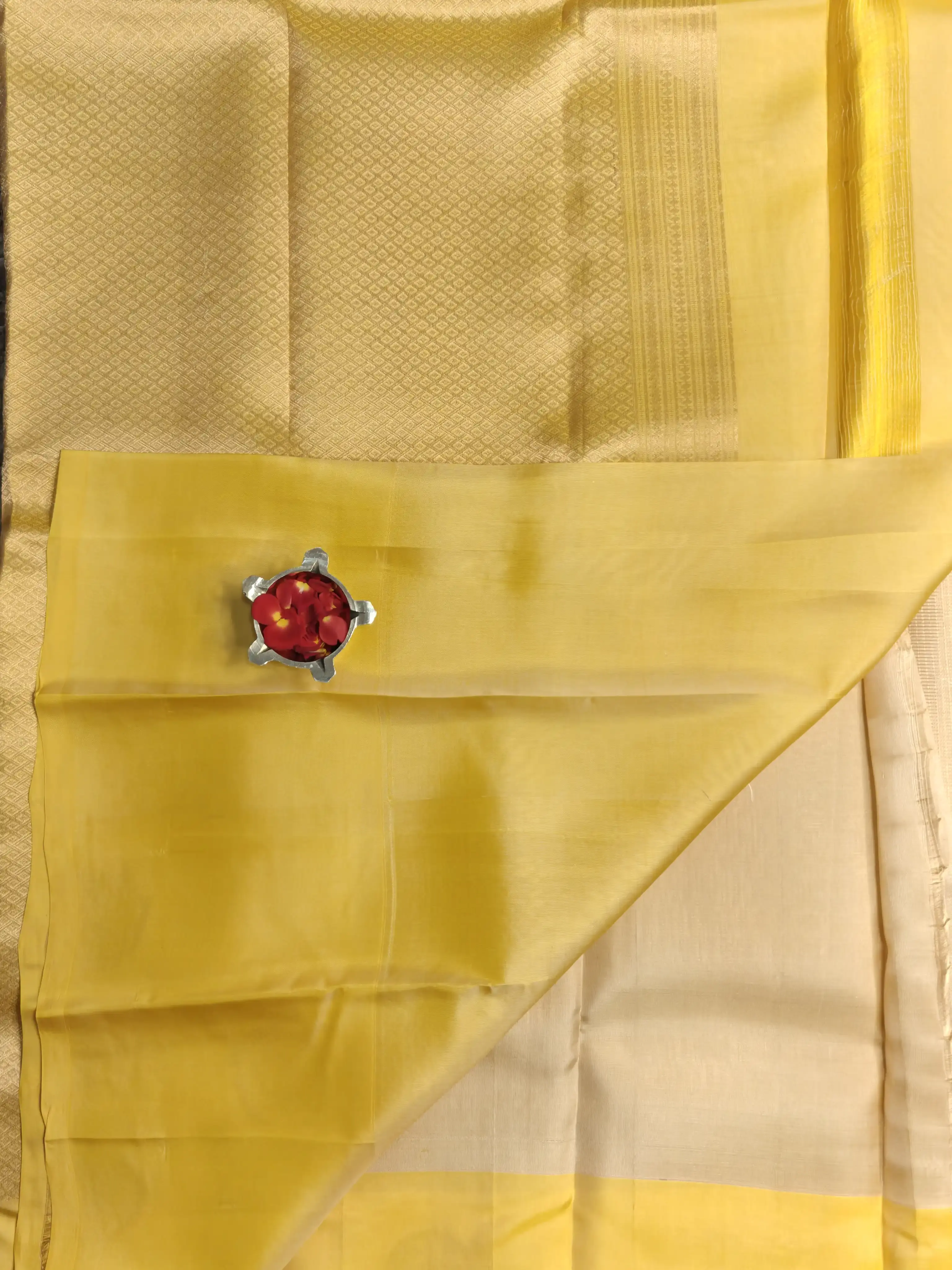 This elegant cream silk saree features delicate microchecks throughout the body, creating a refined texture and understated charm. It is beautifully framed by a long, vibrant yellow border that adds a bright and cheerful contrast. Perfect for festive days, casual celebrations, and elegant ethnic styling, this saree blends simplicity with a sunny twist 🤍💛