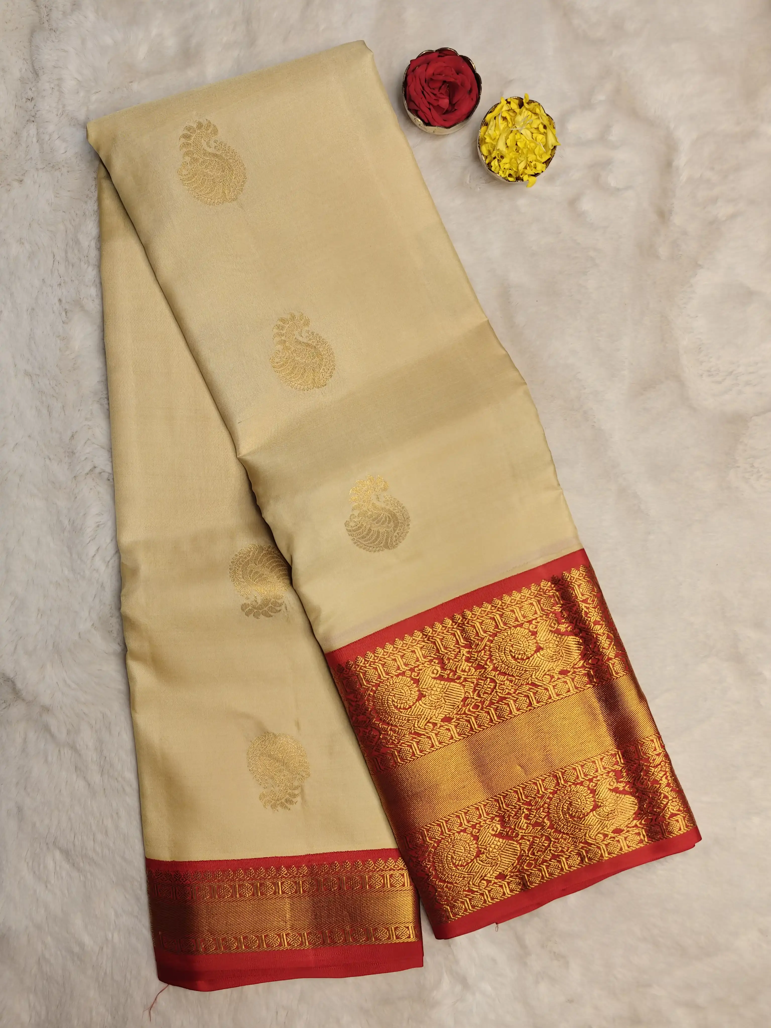 This cream-coloured silk saree radiates timeless grace, highlighted by a bold red traditional border that adds grandeur to the drape. The richly woven pallu enhances its regal appeal, reflecting the essence of age-old craftsmanship and cultural elegance. Perfect for weddings, temple ceremonies, and auspicious occasions, this saree embodies tradition, purity, and royal charm 🤍❤️