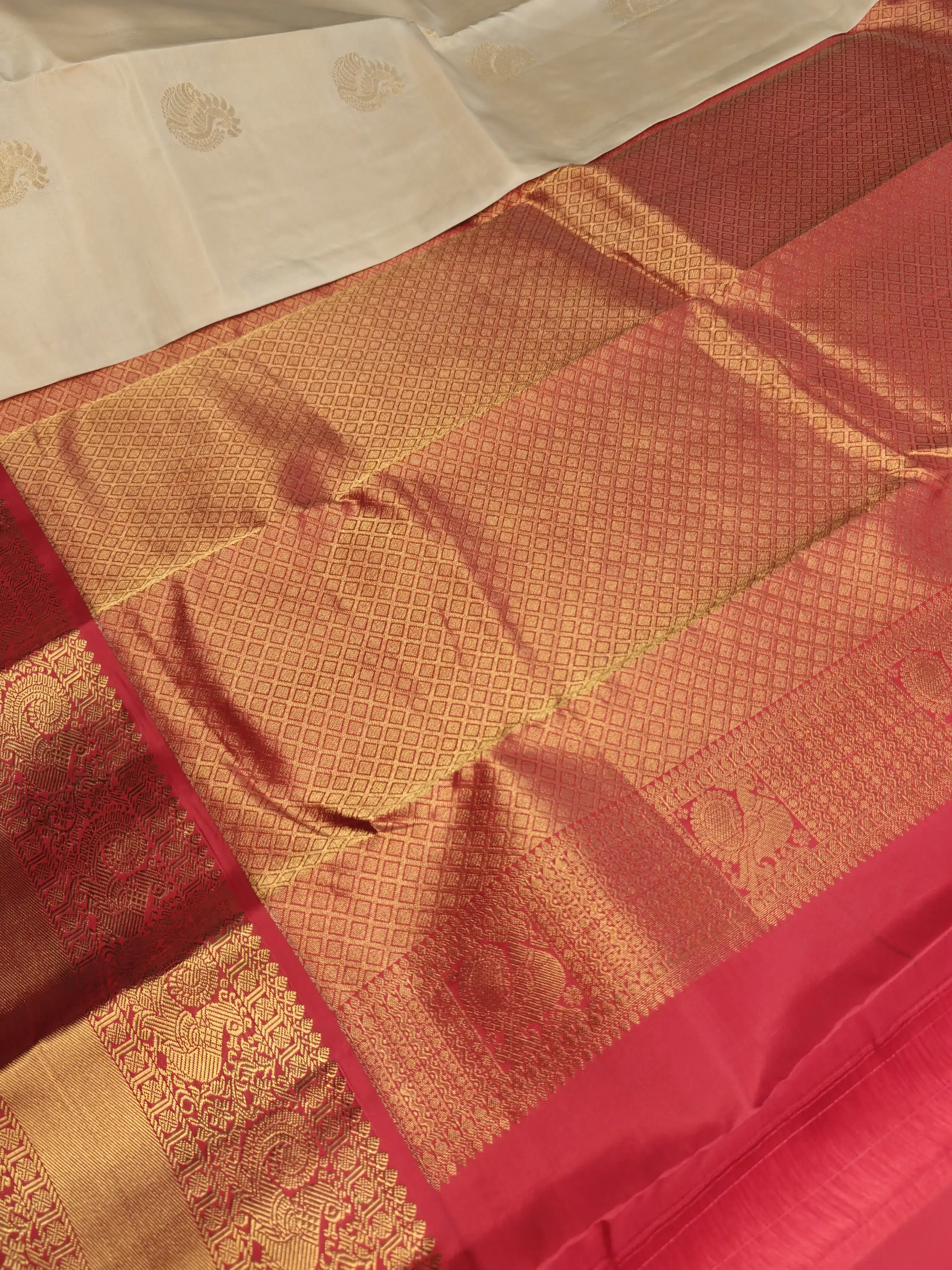 Cream Red with big motifs and large border silk saree