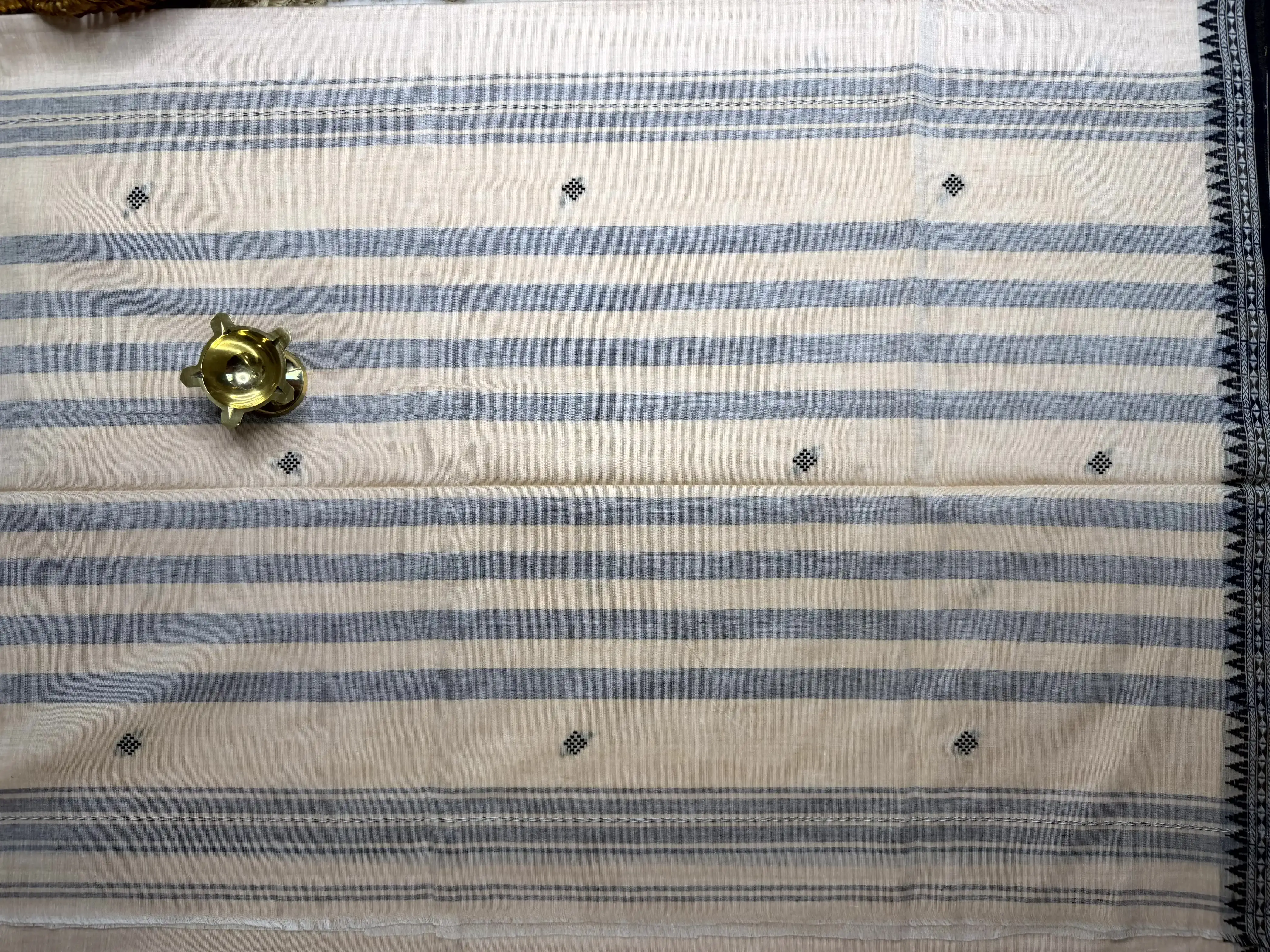 A refined classic for lovers of subtle contrast — this Cream Dhaniakali cotton saree is adorned with black buttas all over the body, creating a timeless and elegant visual rhythm.