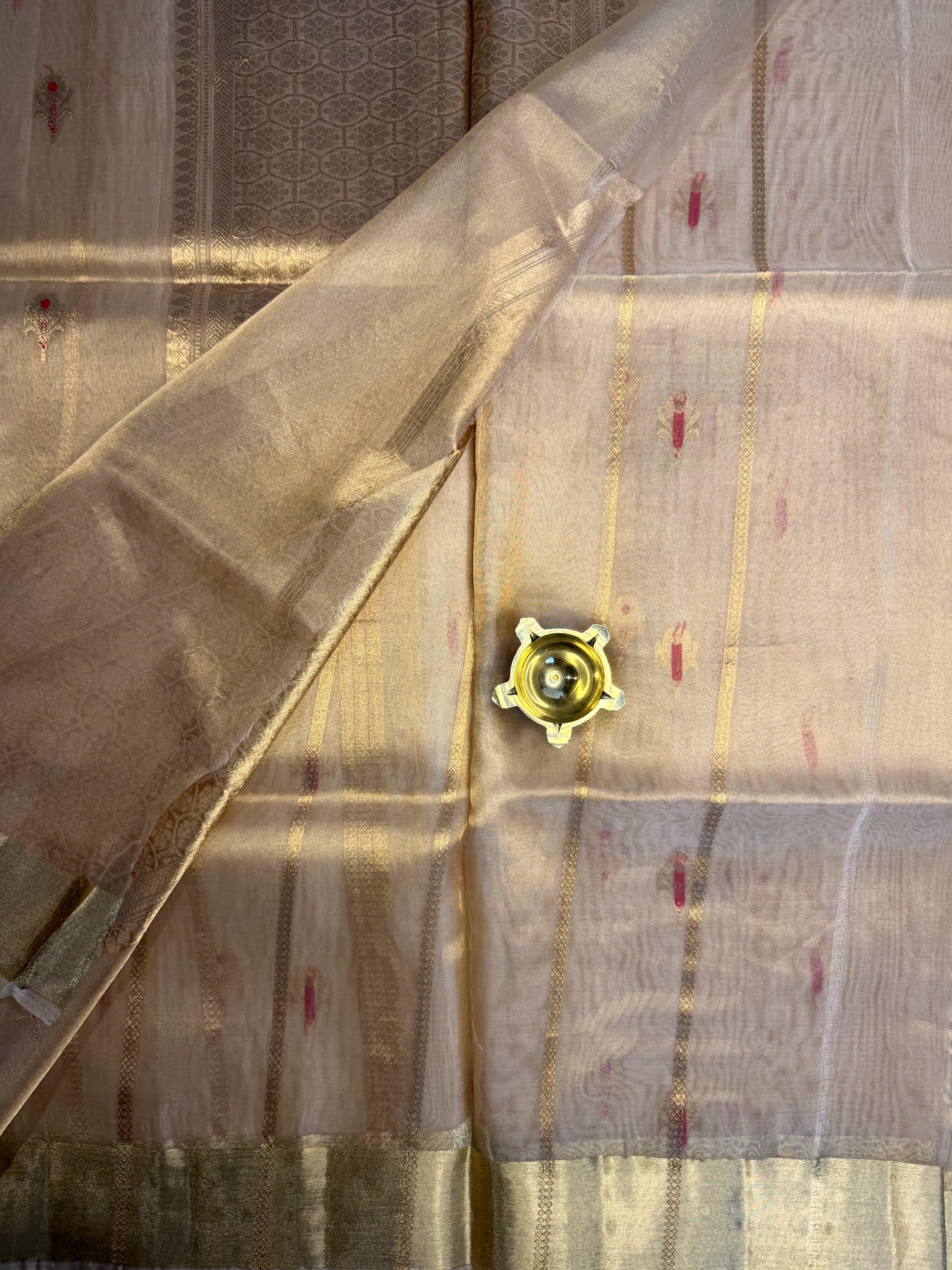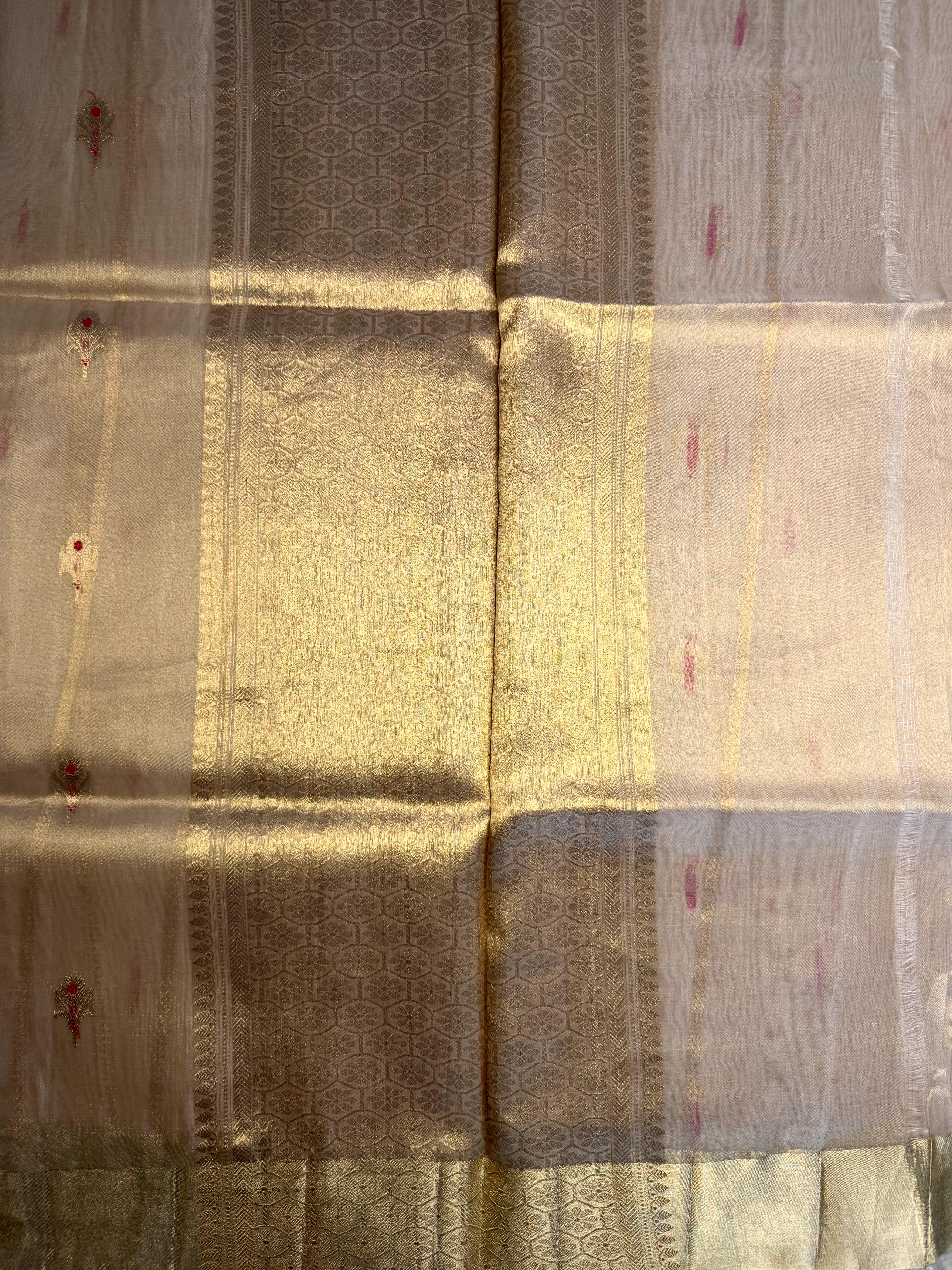 Graceful and timeless, this cream Tissue Kora Organza saree comes adorned with tiny zari buttas all over the body and a traditional zari border that highlights its heritage charm.