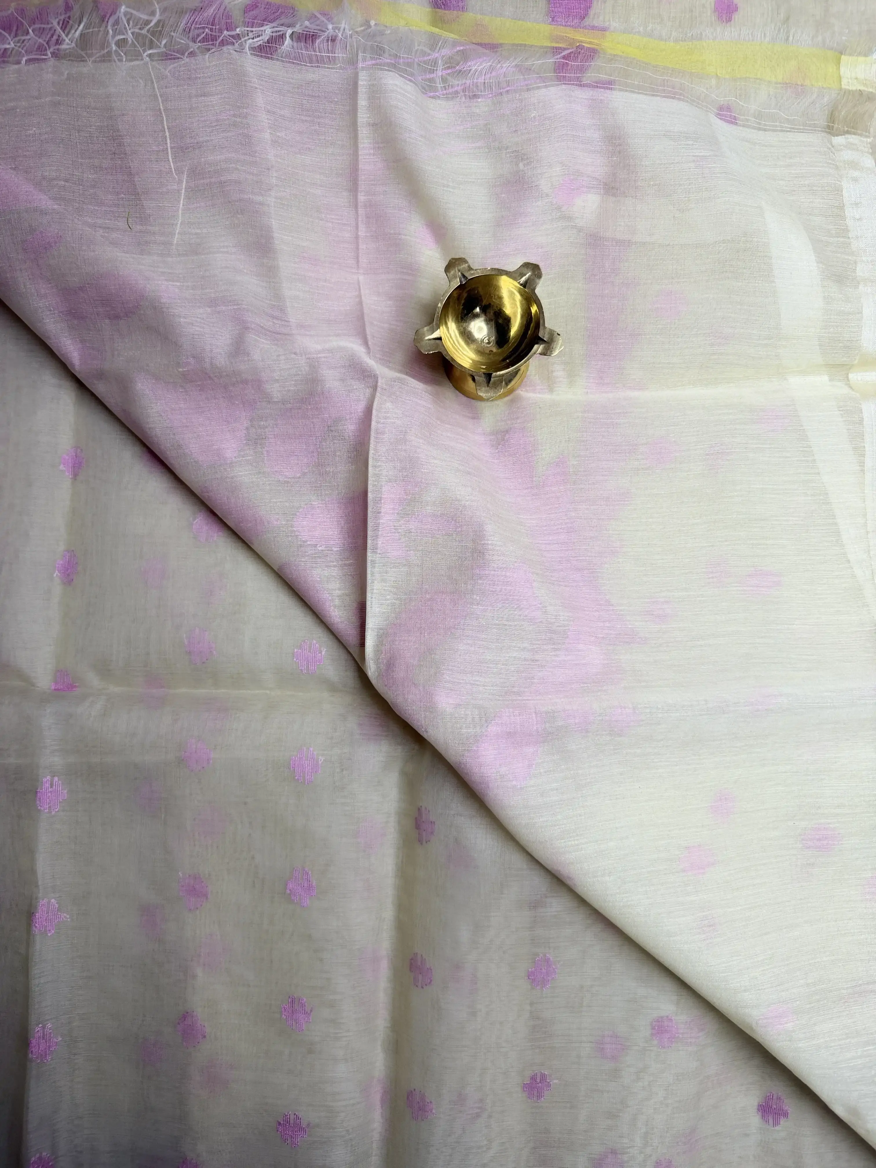 This Muga cotton silk saree in a graceful cream shade is beautifully enhanced with delicate pink Jamdhani work, reflecting fine craftsmanship and heritage weaving. The blend of cotton and silk offers a soft texture with a gentle sheen, creating a luxurious yet comfortable drape.