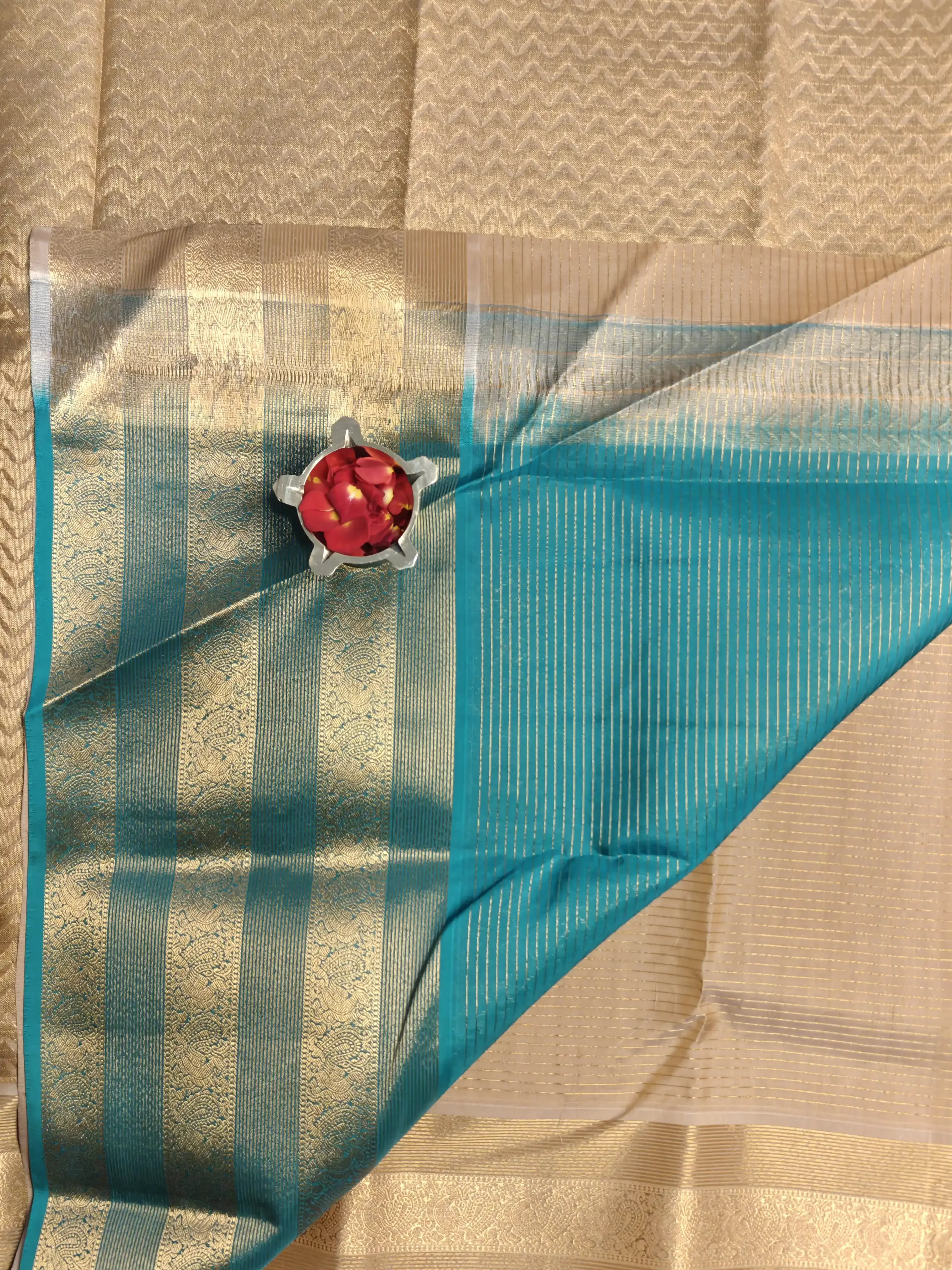 Cream with Teal blue long border silk saree
