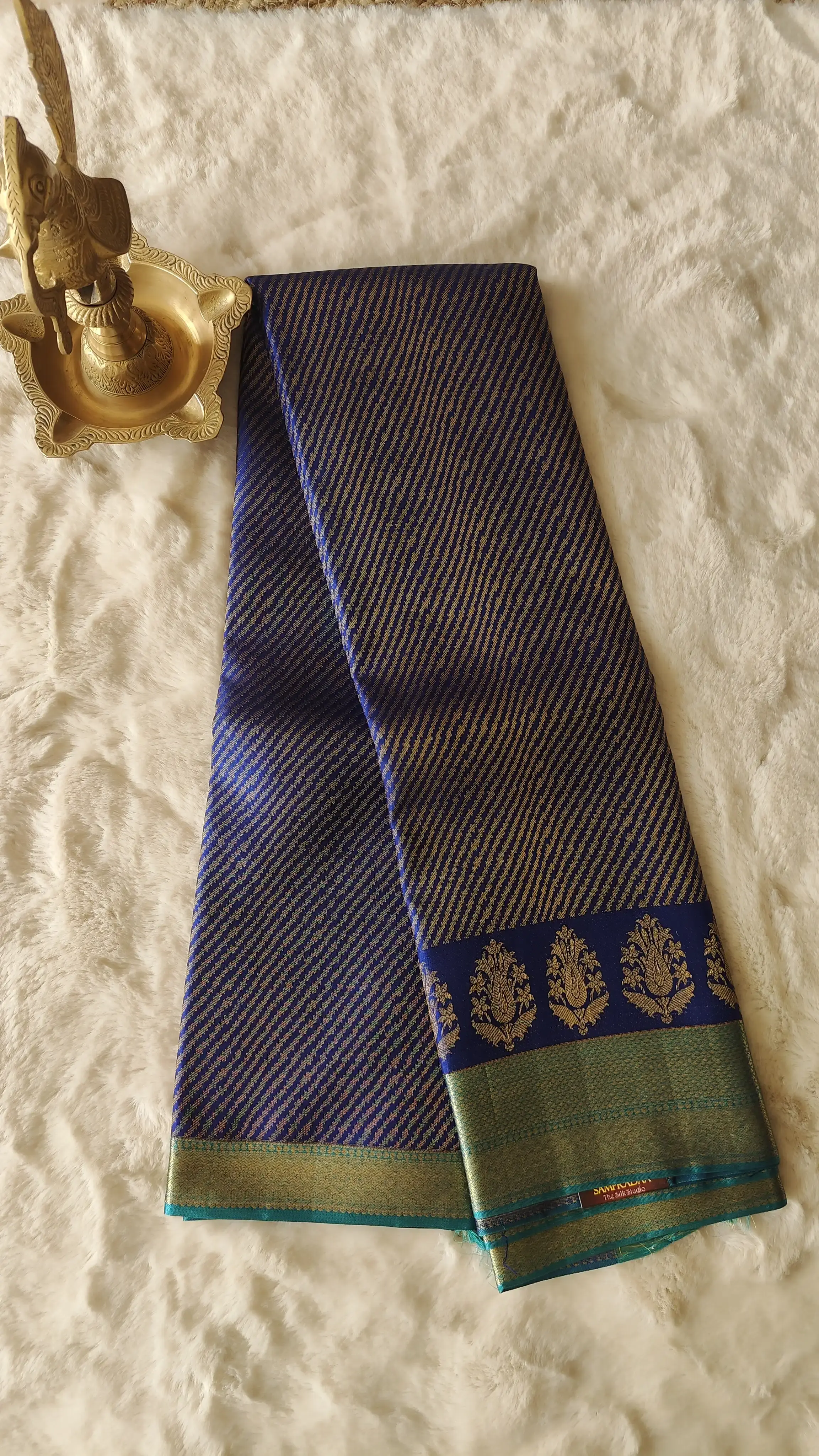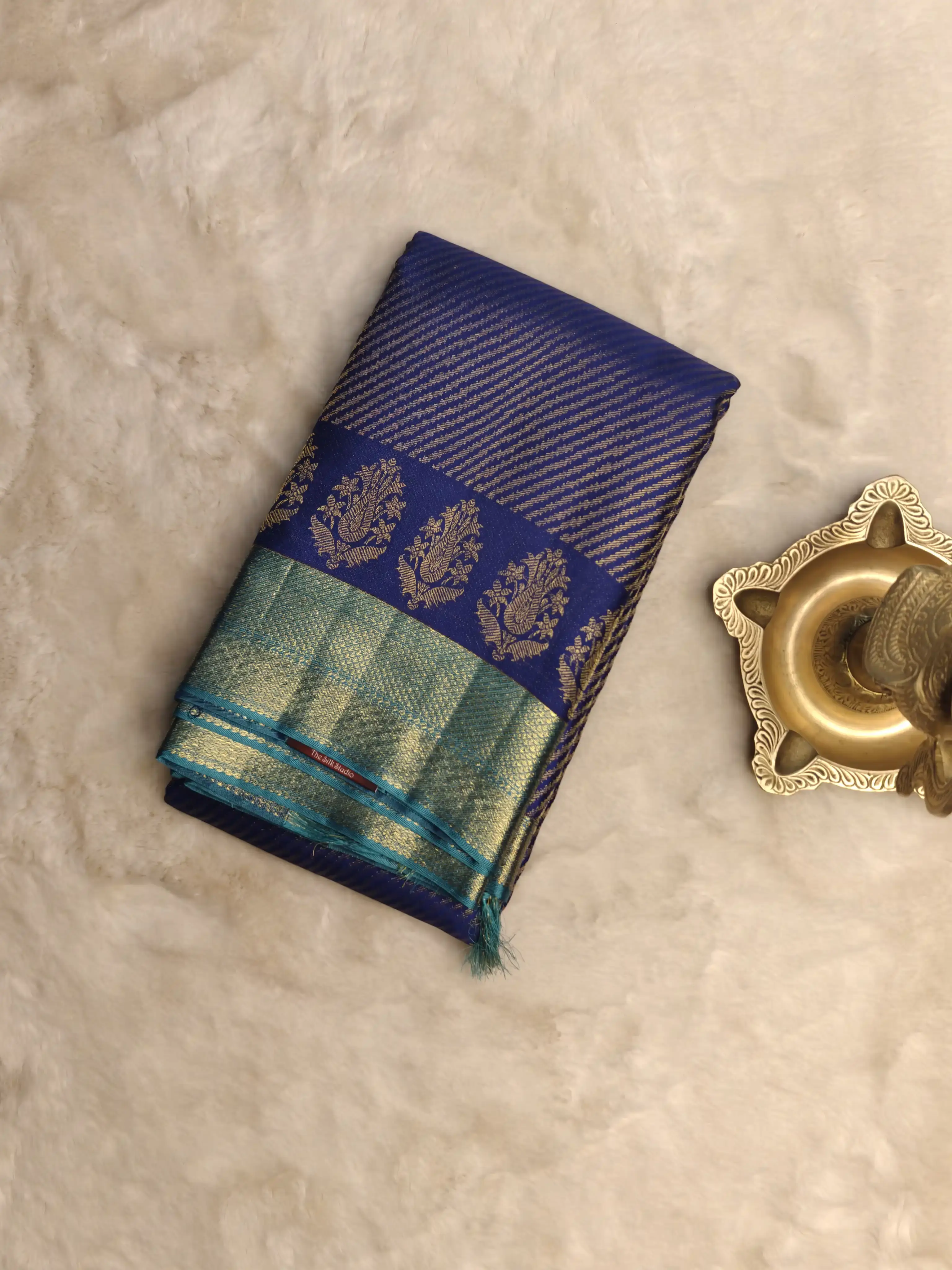 A statement of timeless elegance, this pure Kanchipuram dark blue saree features a graceful lehariya design woven across the body, creating a fluid rhythm in lustrous silk. Accented with a sky blue border adorned with delicate floral motifs, this masterpiece balances depth and softness—an exquisite choice for weddings and grand festive occasions.