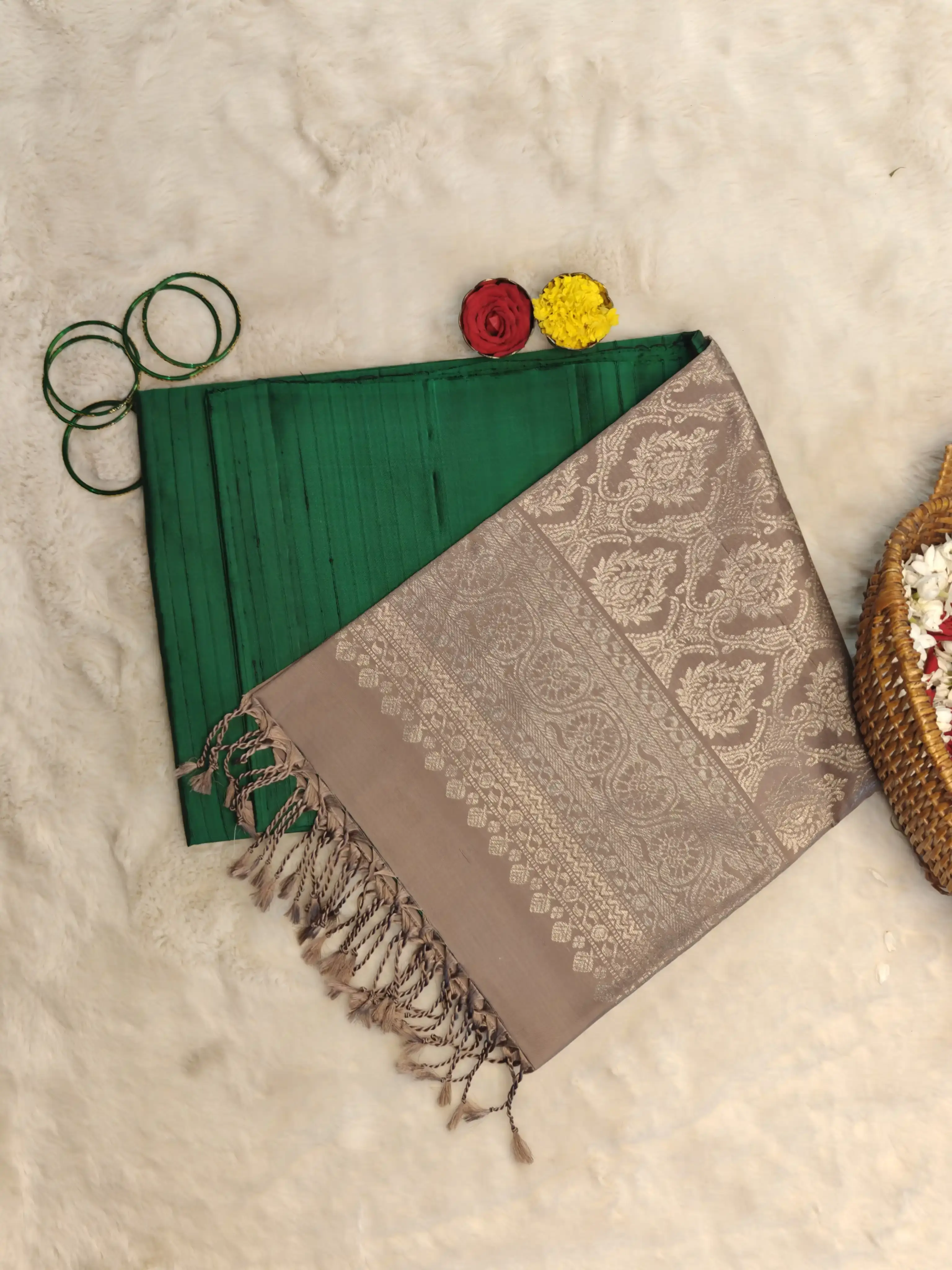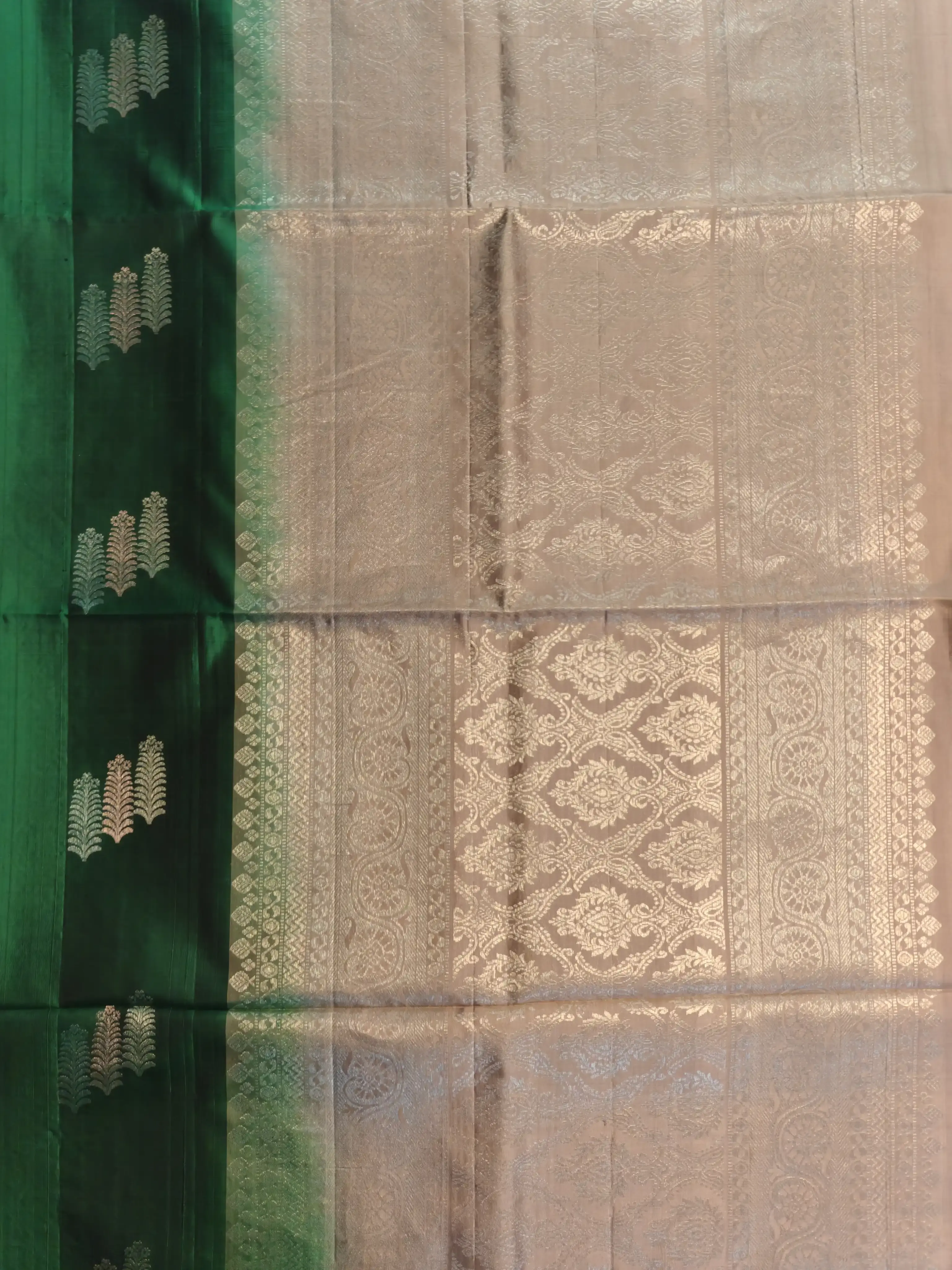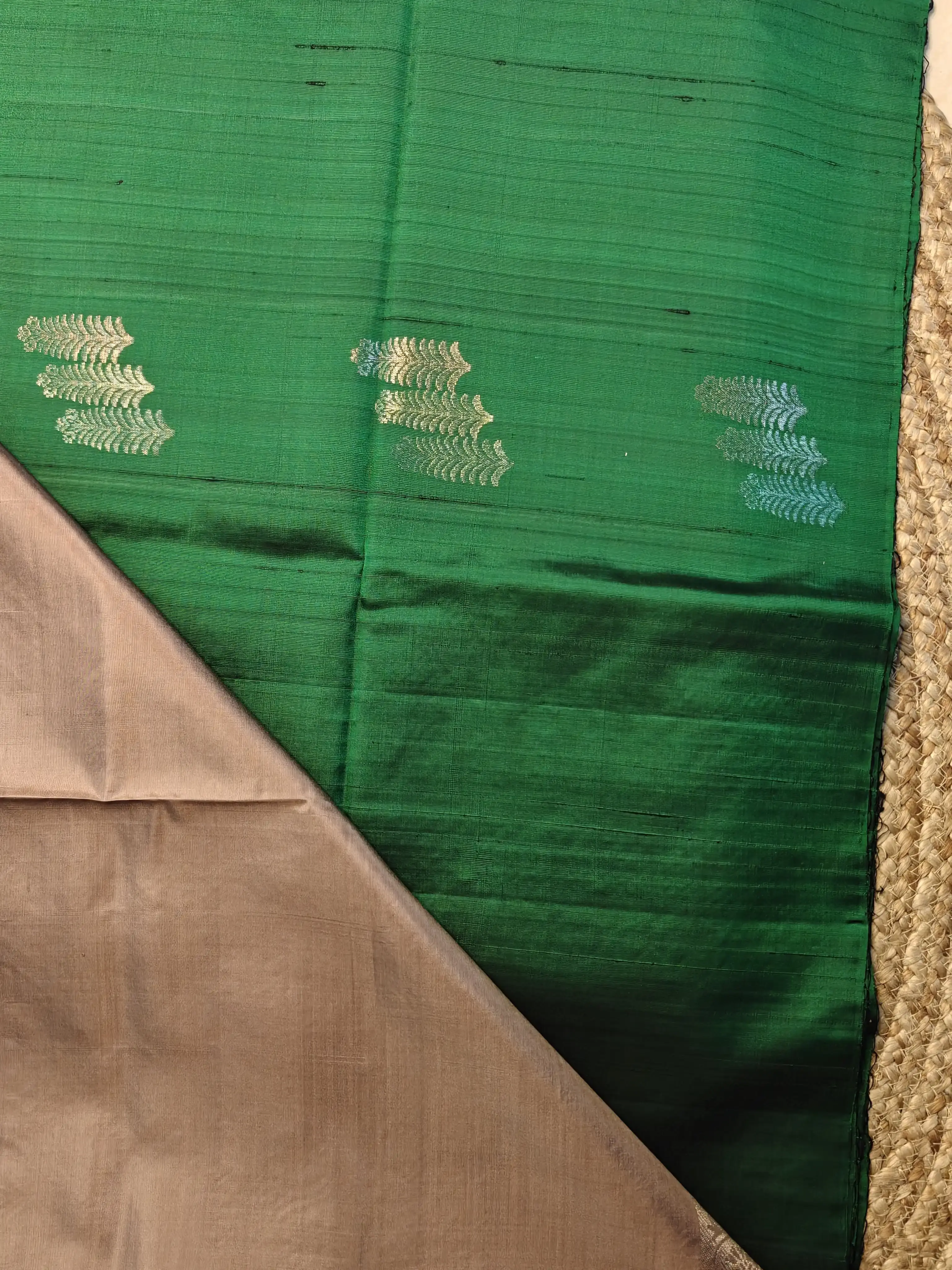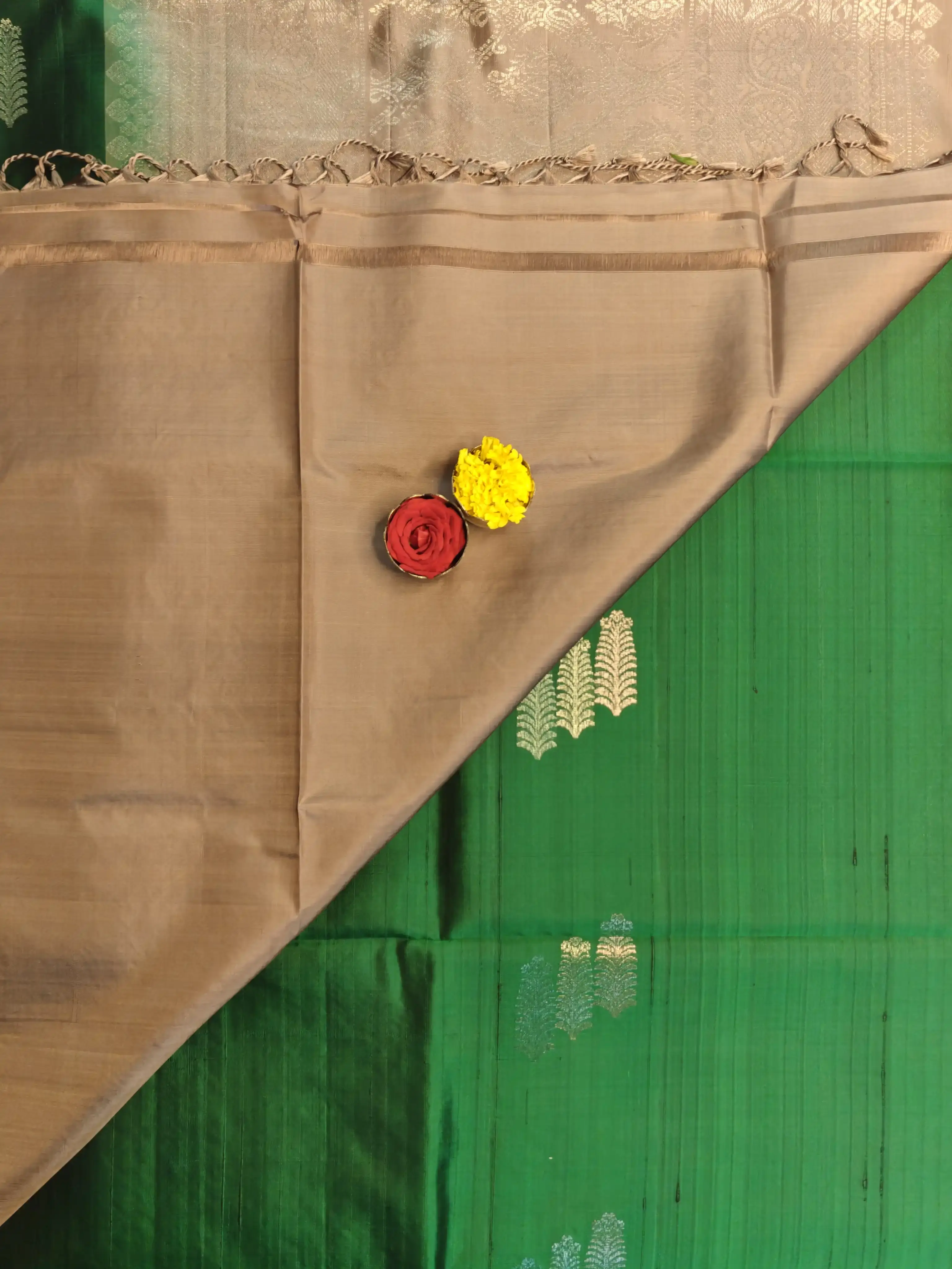 This dark green soft silk saree features a serene beige pallu that beautifully contrasts with the rich body. Adorned with unique motifs all over, it adds an artistic touch while maintaining classic elegance. Perfect for festive occasions and traditional celebrations, this saree brings together subtle sophistication and distinctive charm 💚🤍
