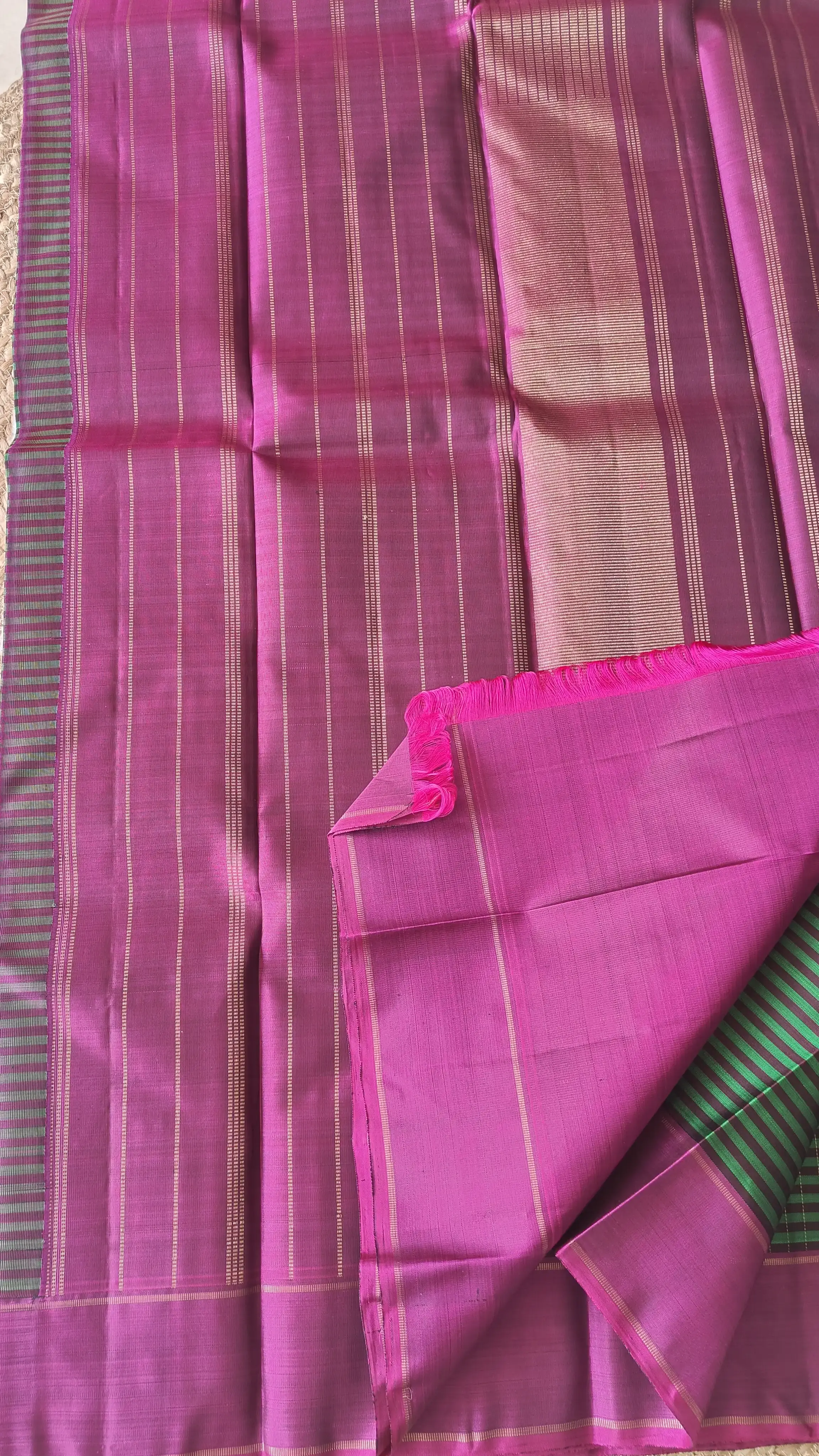 A refined play of color and texture, this saree features an elegant green and chocolate brown checks pattern woven across the body, exuding timeless charm. Framed with a plain pink border and finished with a richly woven pallu, this drape blends classic tradition with understated luxury—perfect for festive and celebratory occasions.
