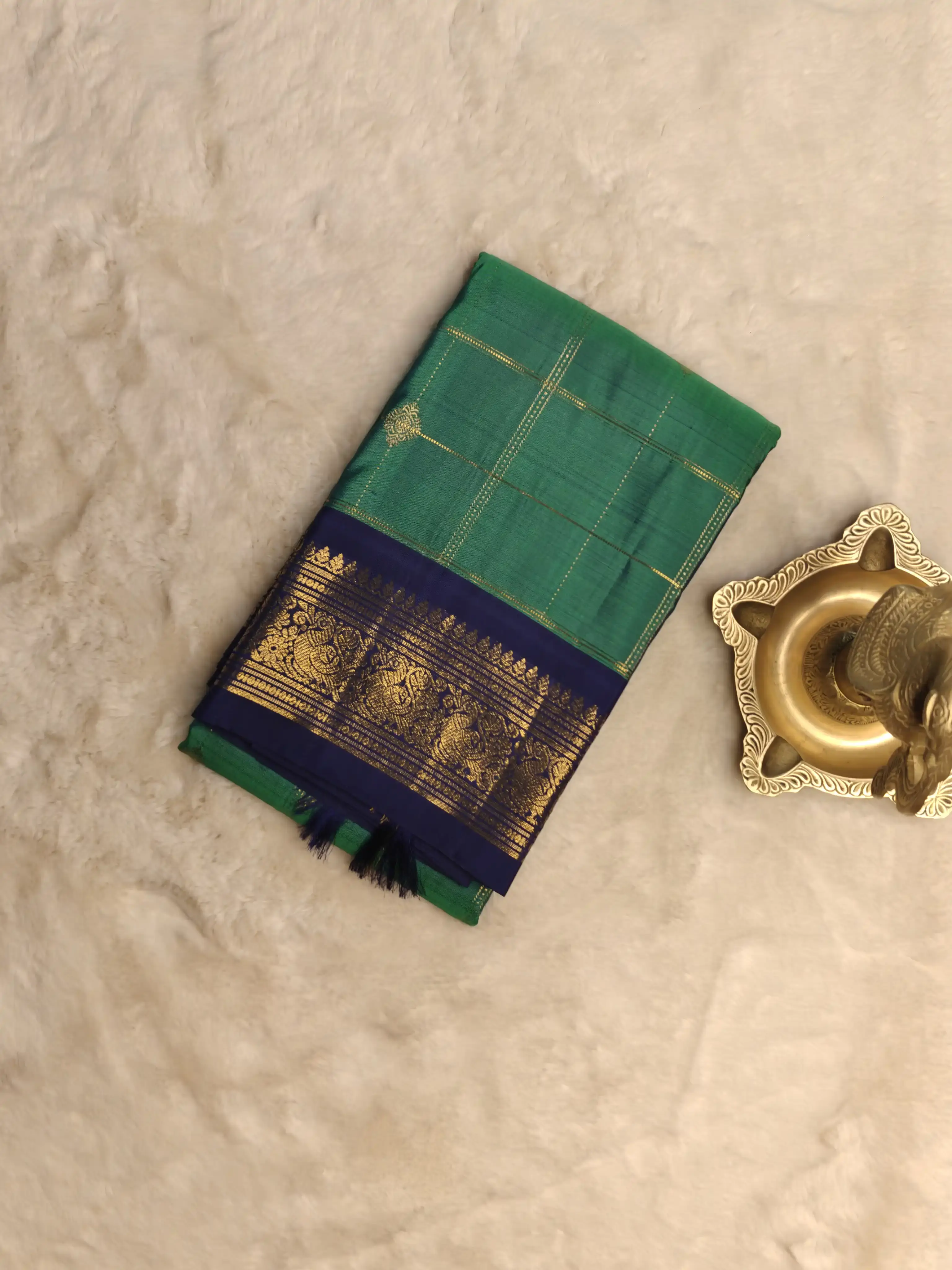 Green checks with navy blue contrast Pure kanchipuram silk saree