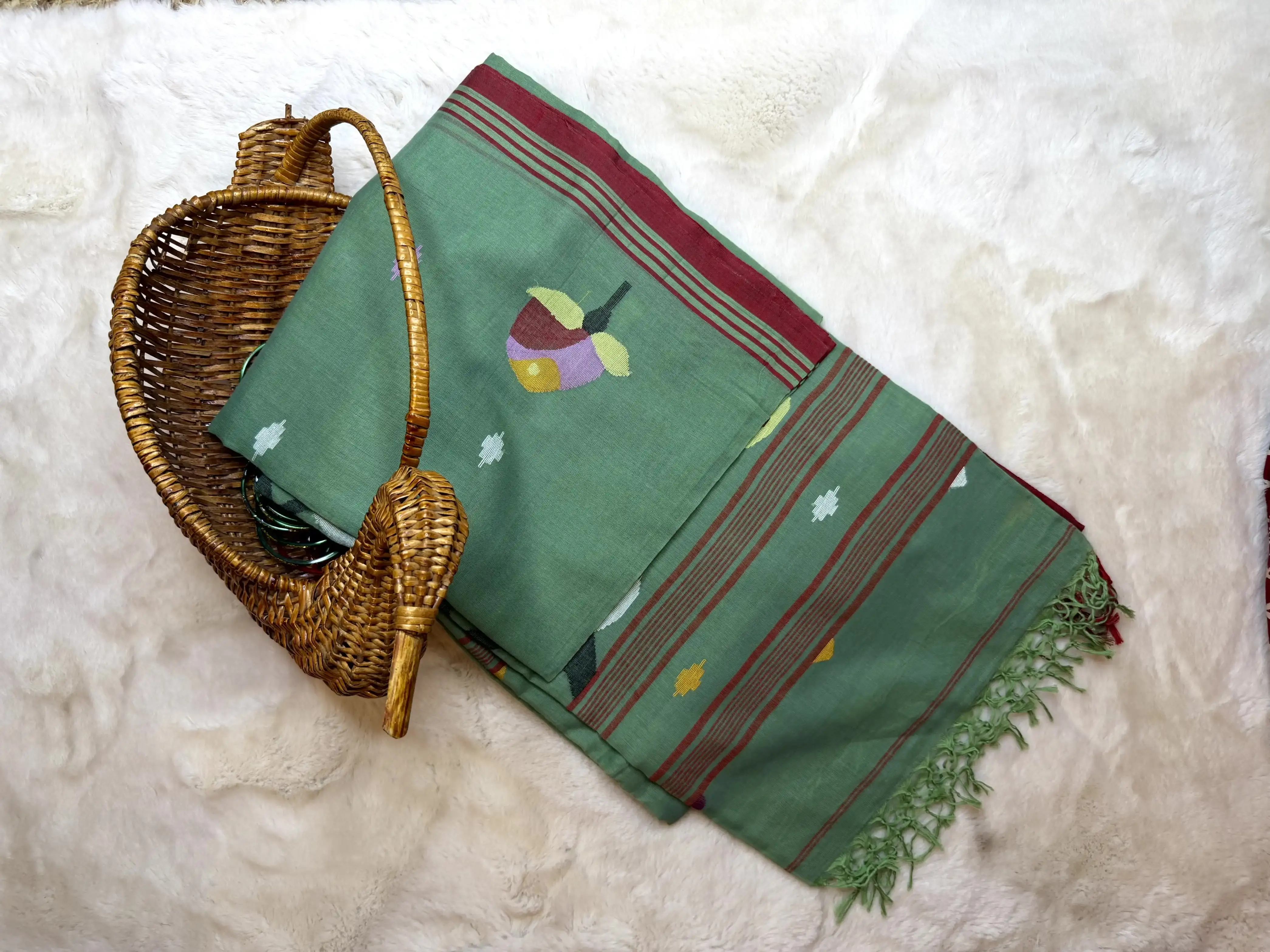 Green jamdhani work cotton saree