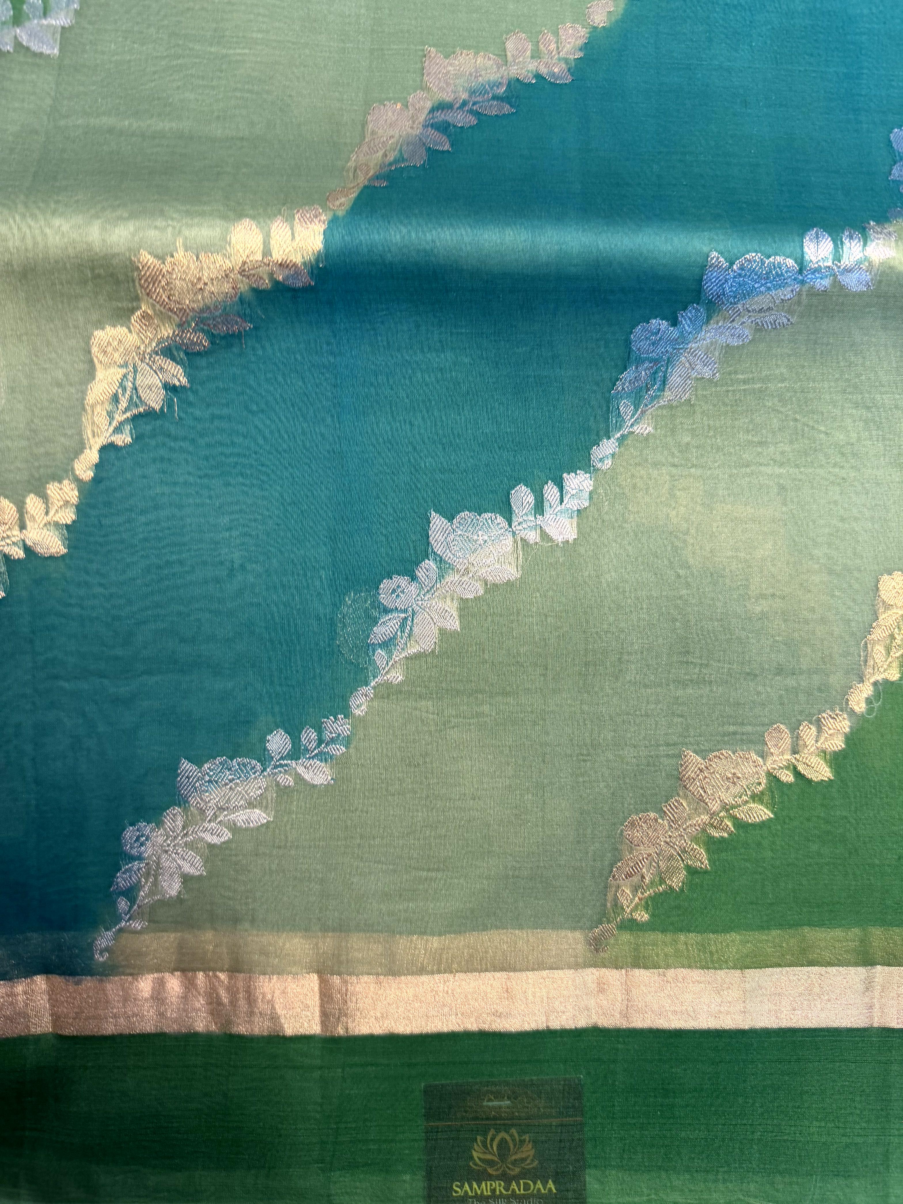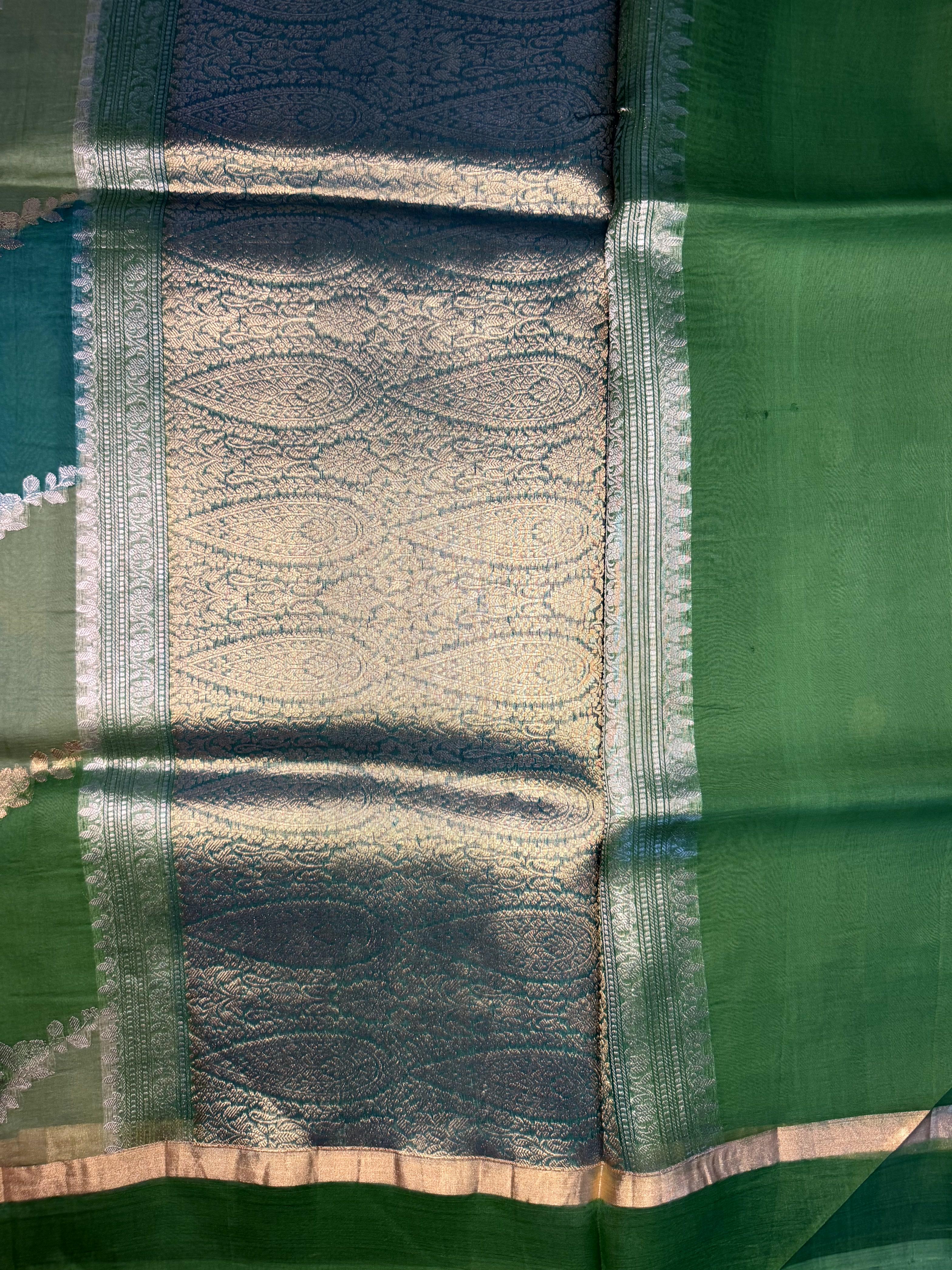 Green Lehariya pattern pure kora organza saree