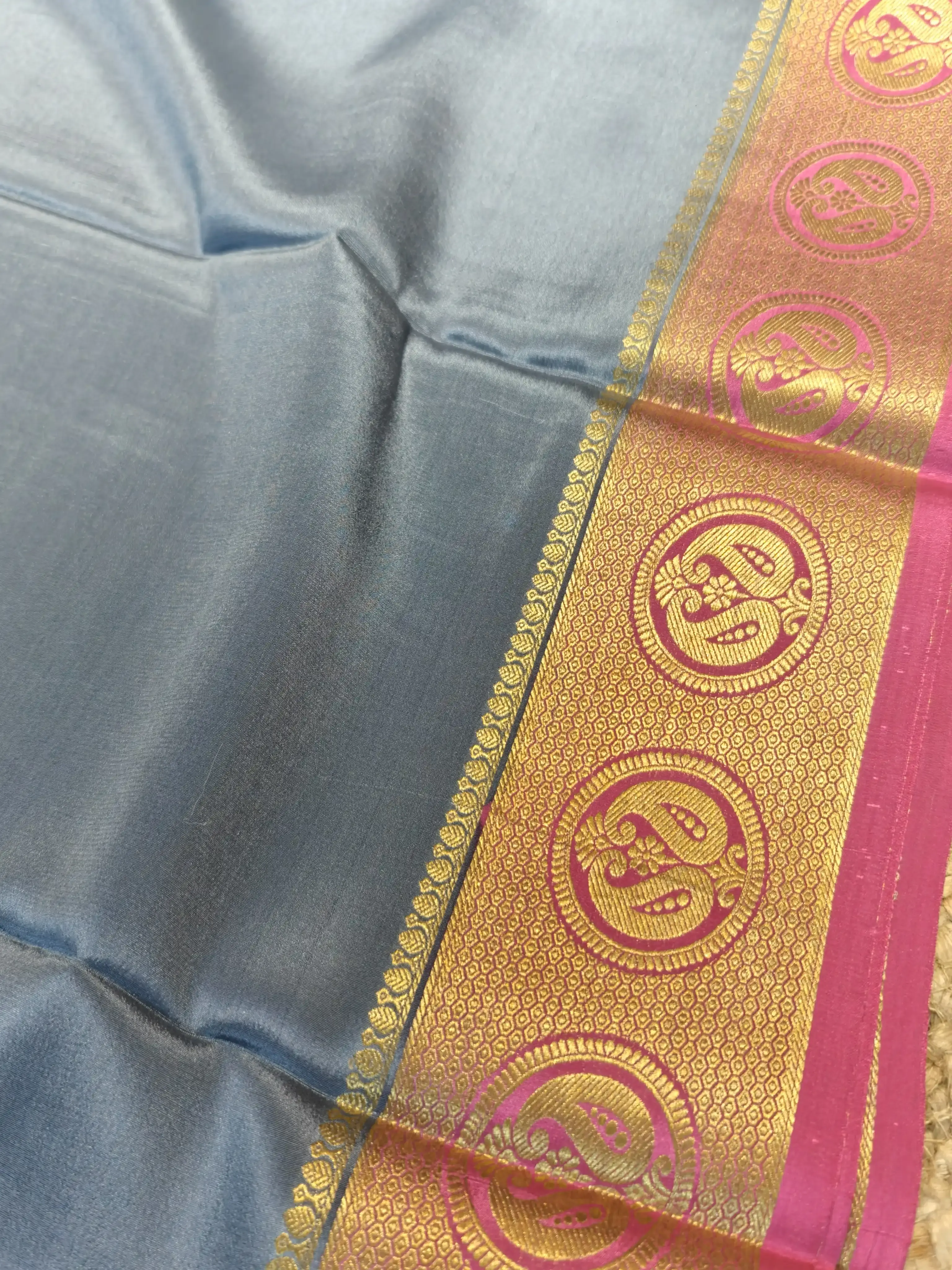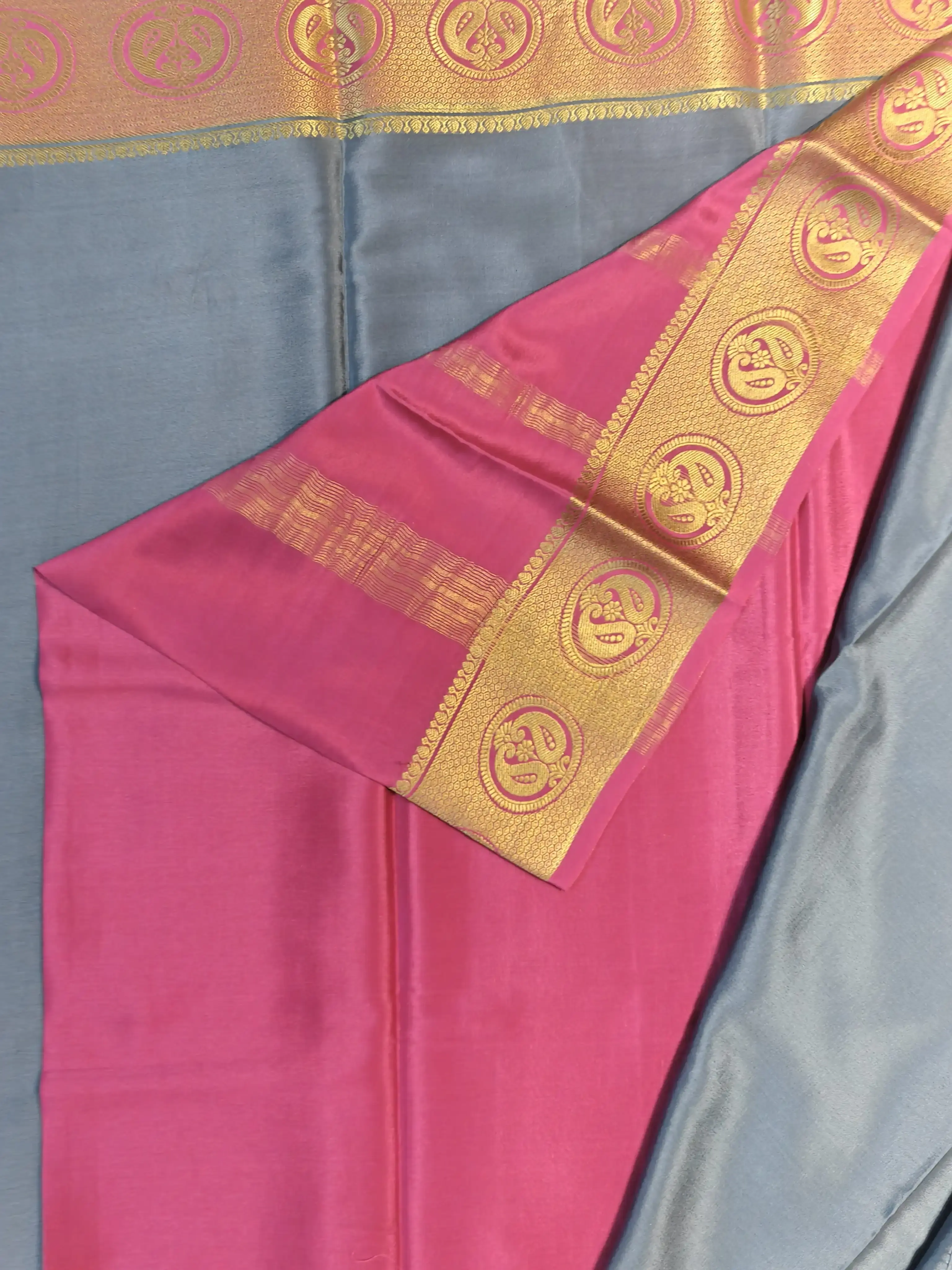 A pure crepe silk saree (120 GSM) with a plain grey body, finished with a graceful pink border and a rich pallu for that perfect touch of tradition. Lightweight, fluid, and timeless—made for effortless sophistication.