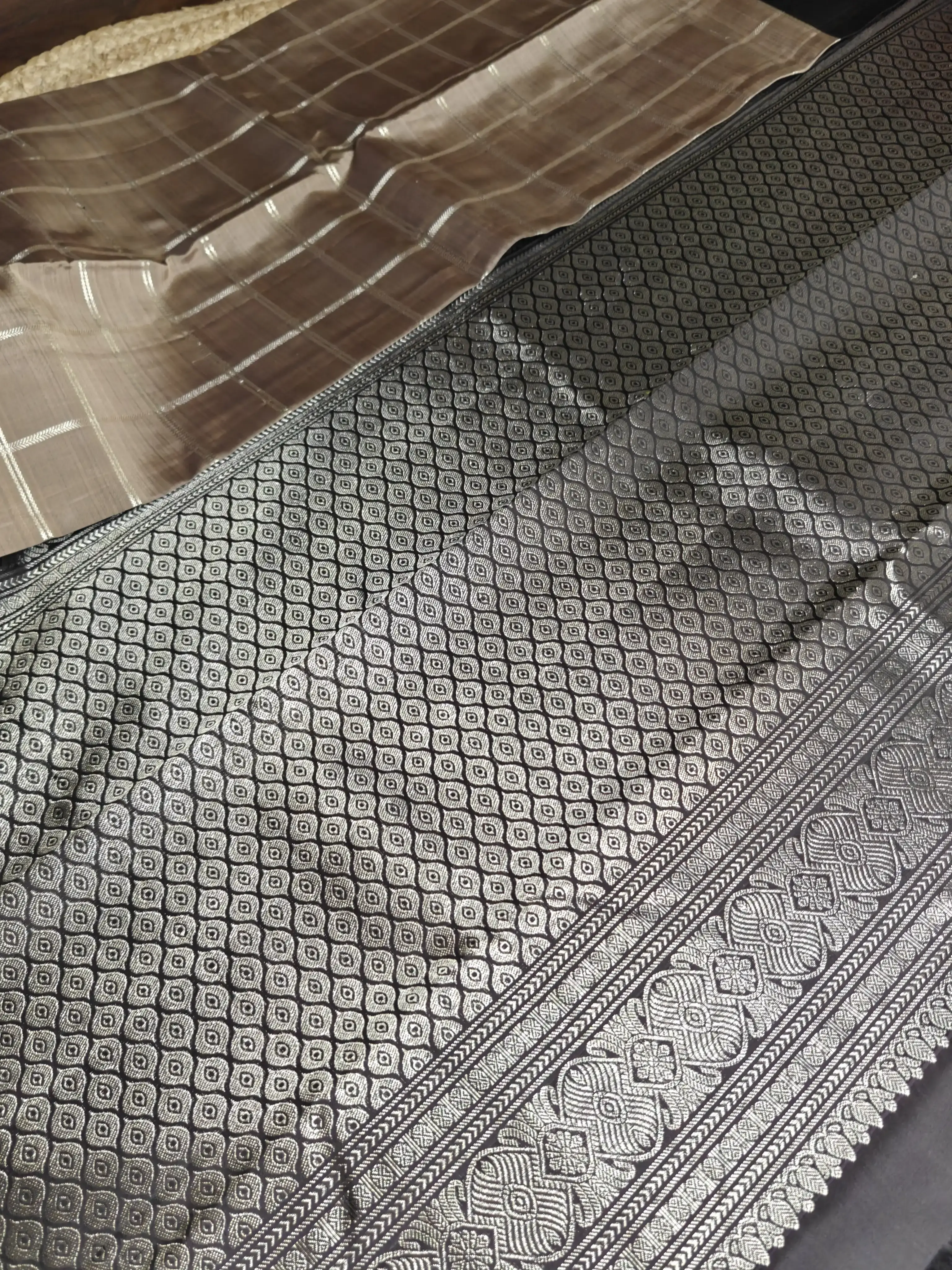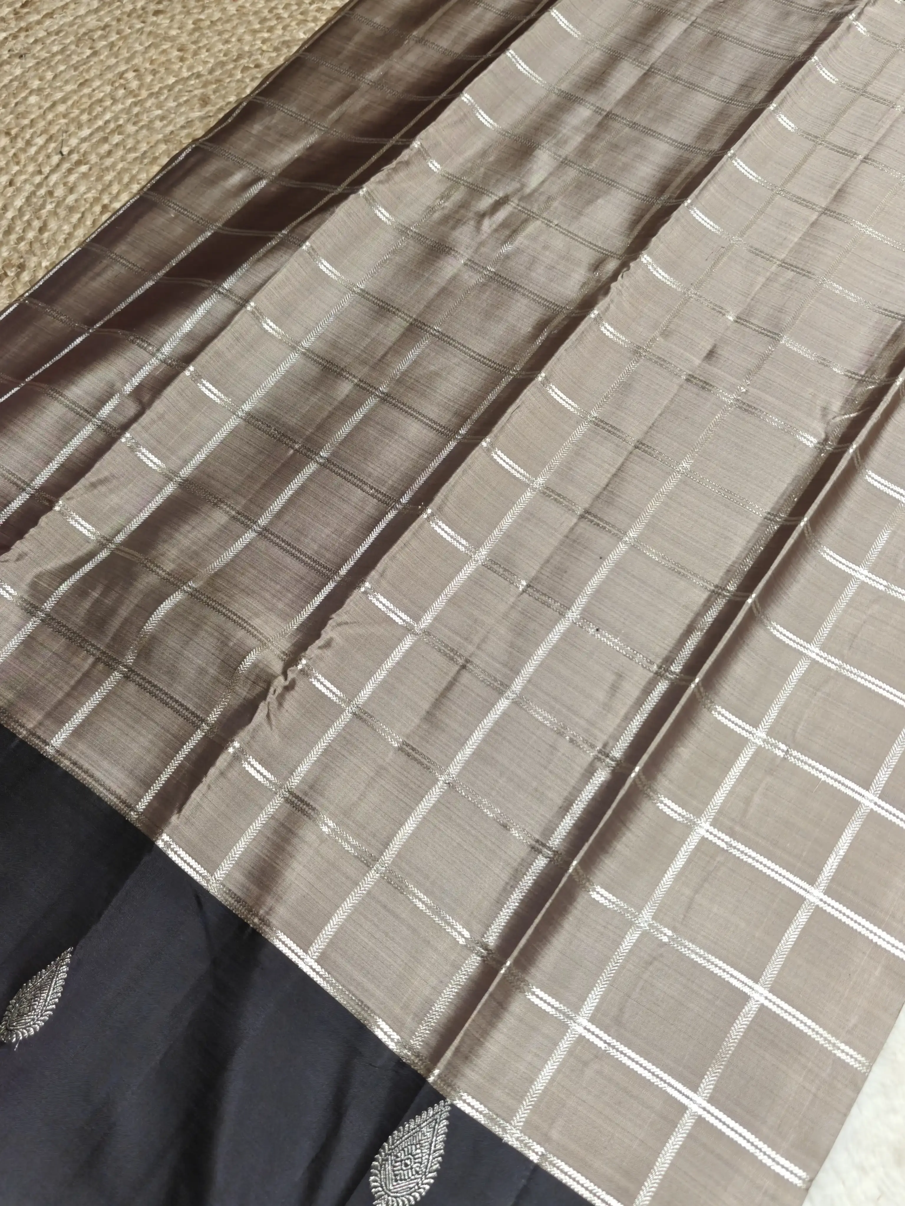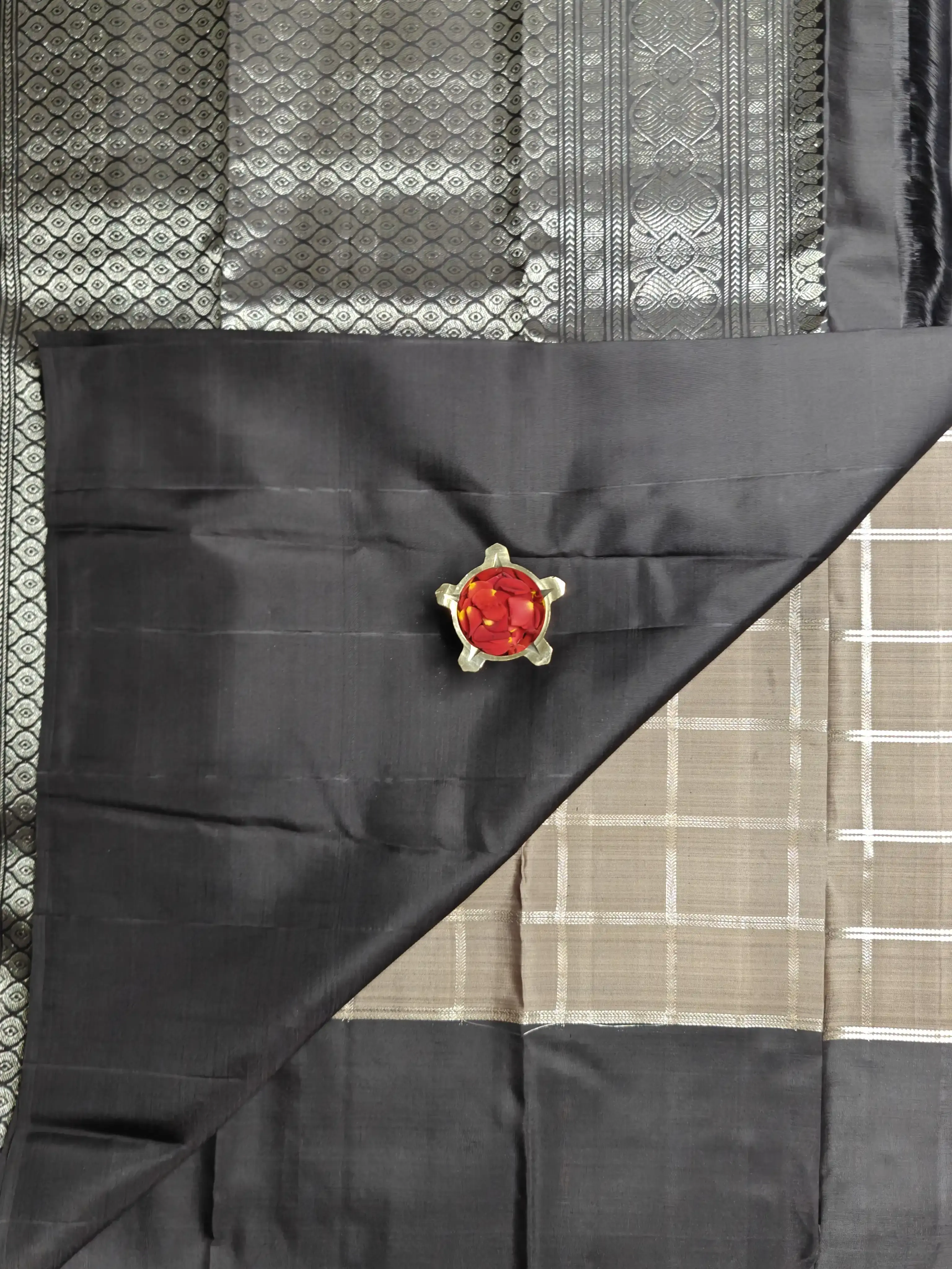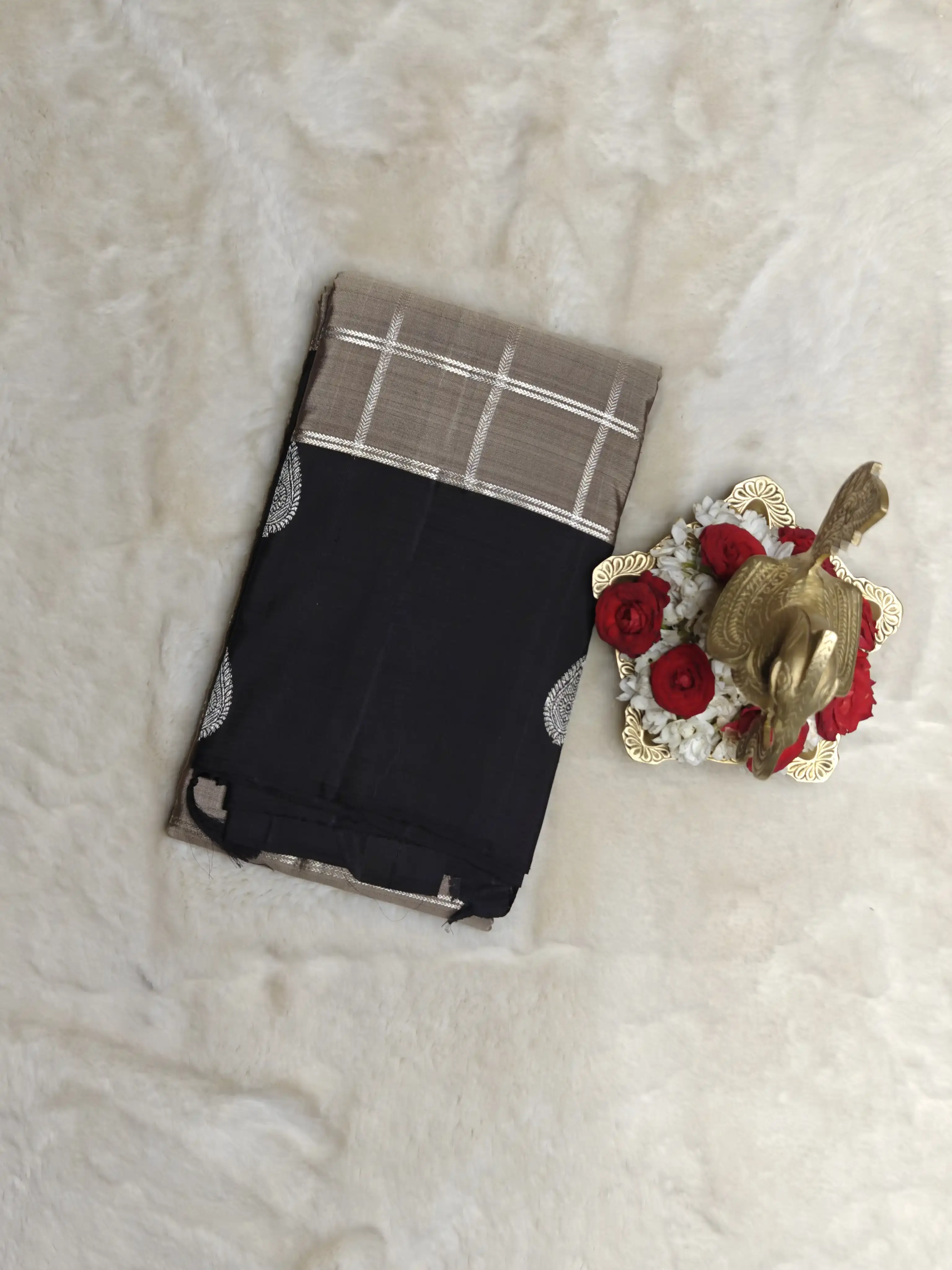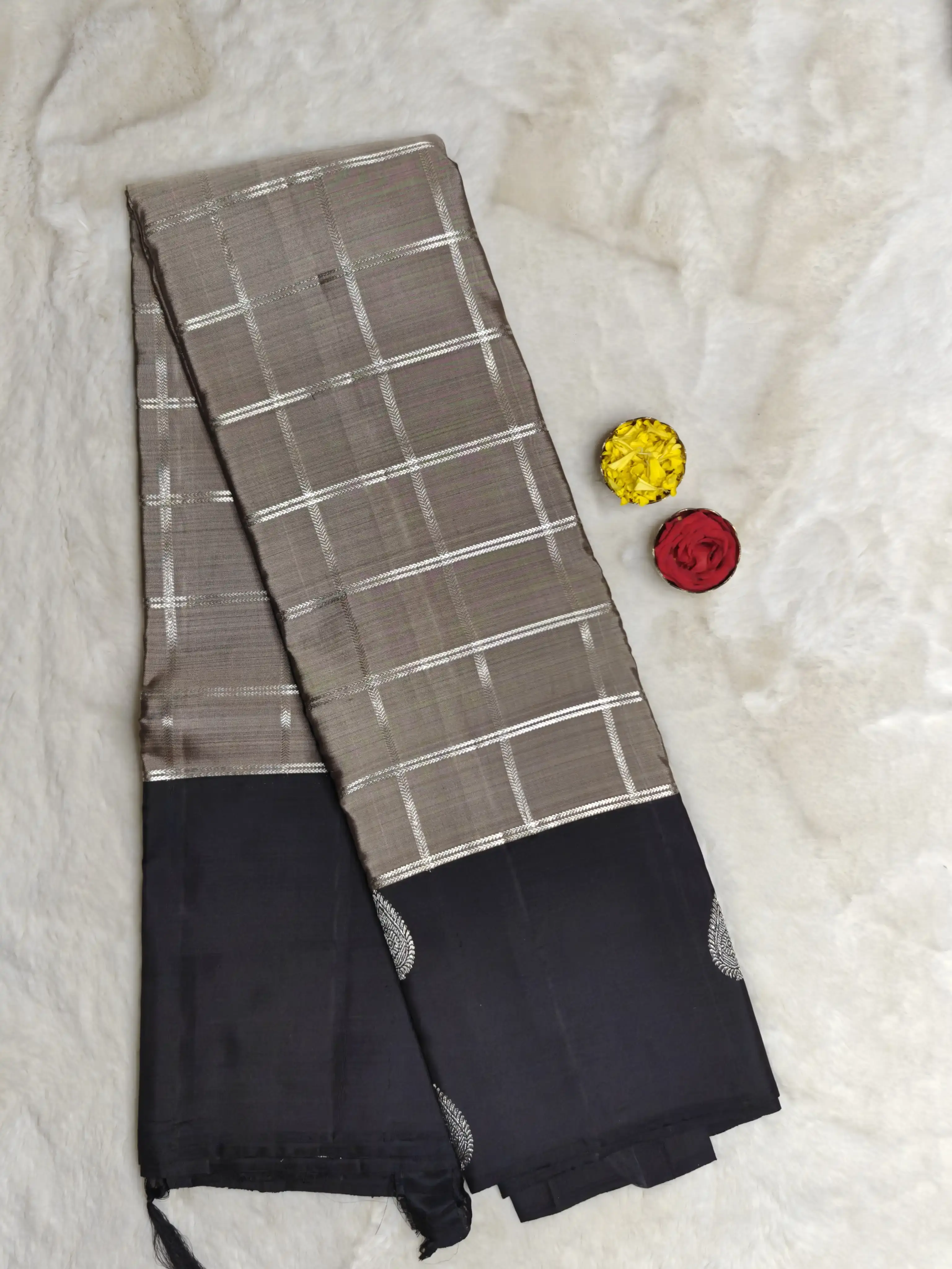 A classic grey silk saree adorned with timeless checks pattern, perfectly contrasted by a bold black border that adds depth and definition. The subtle sheen of silk paired with traditional checks creates a graceful, heritage-inspired drape—ideal for temple wear, festive occasions, and elegant gatherings where simplicity speaks of tradition ✨