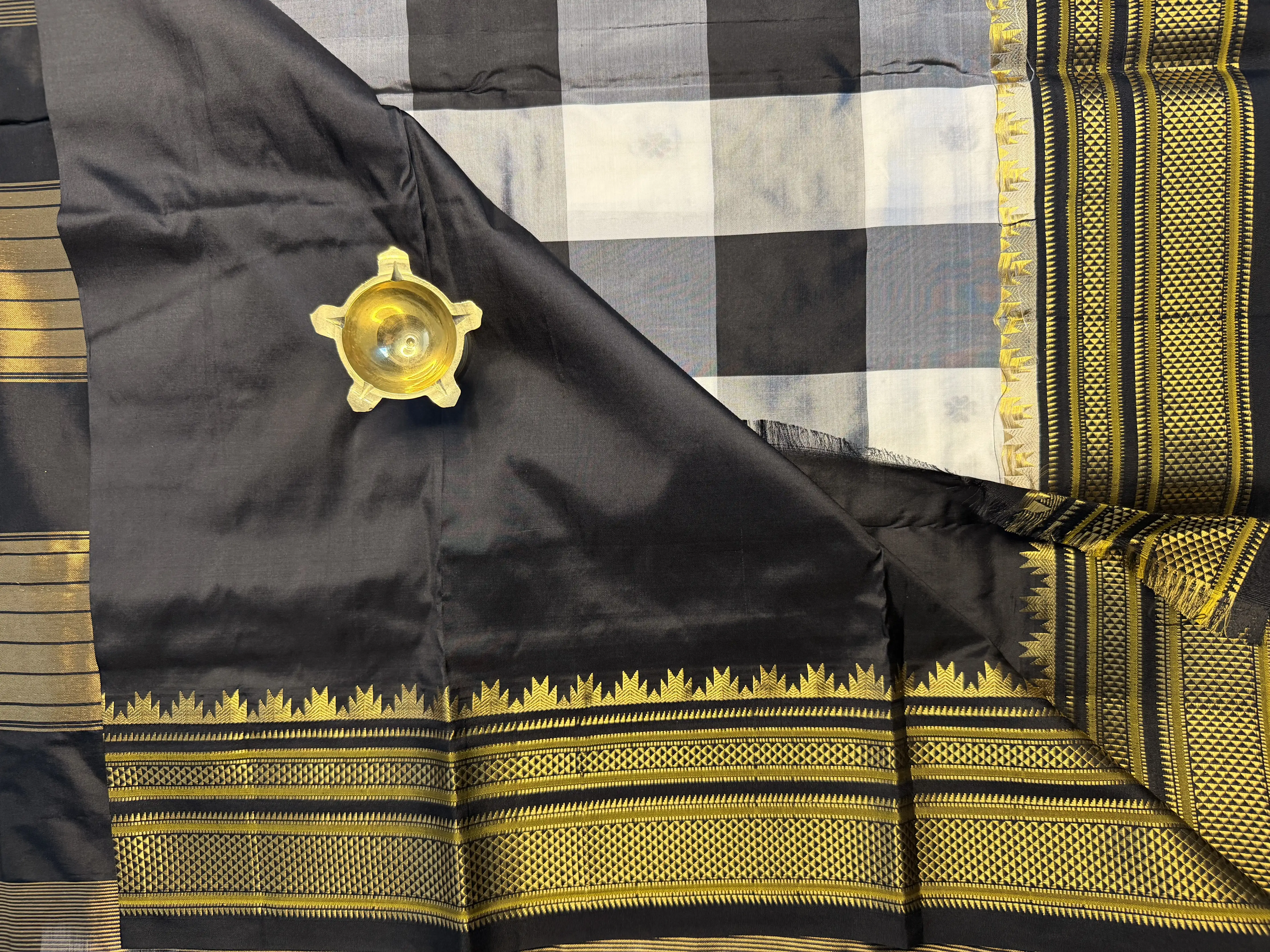 A timeless Ilakal silk saree in classic black and white checks, delicately accented with subtle gold floral motifs. Elegant, balanced, and rooted in tradition—crafted for understated sophistication and everyday luxury.