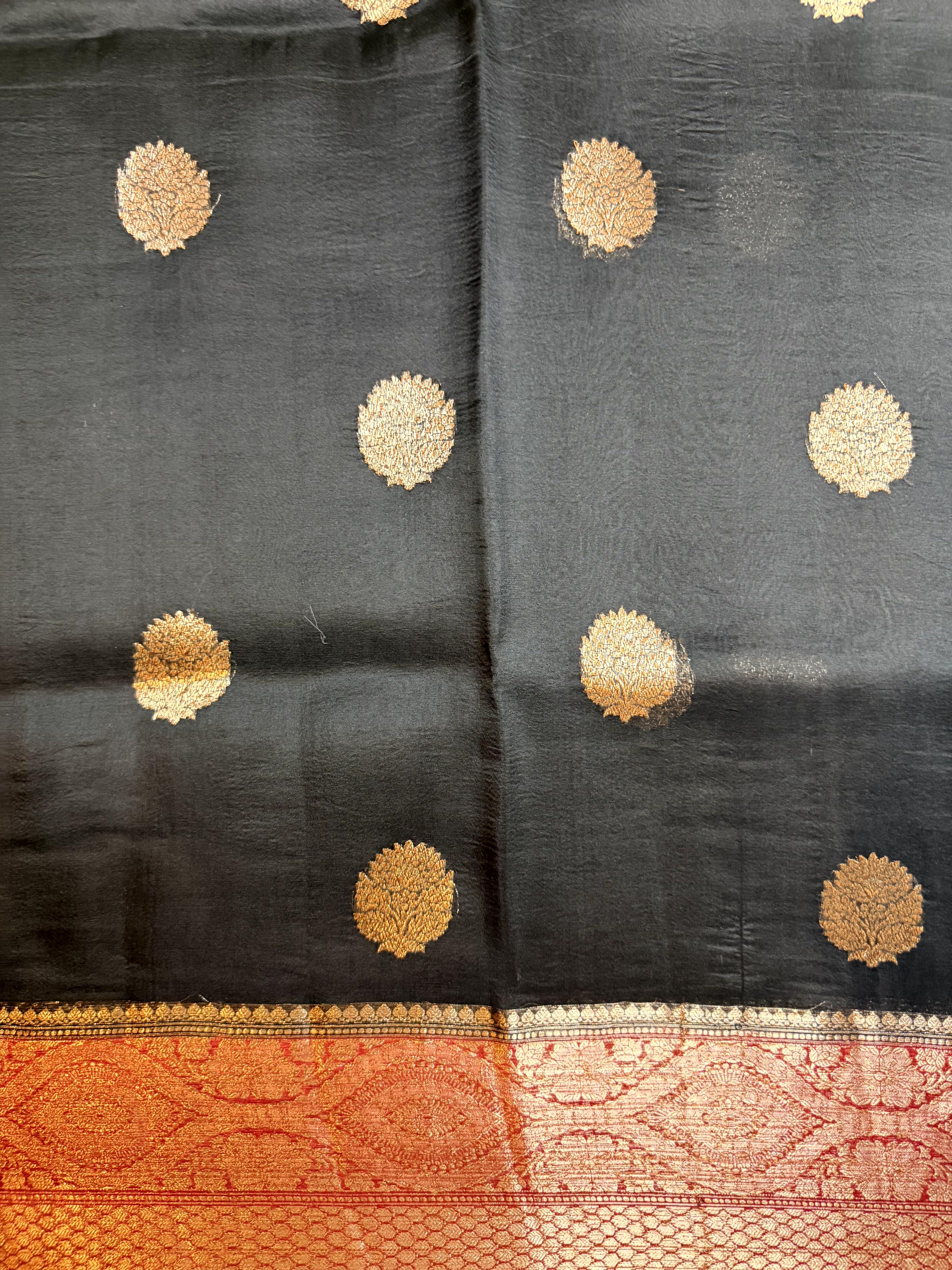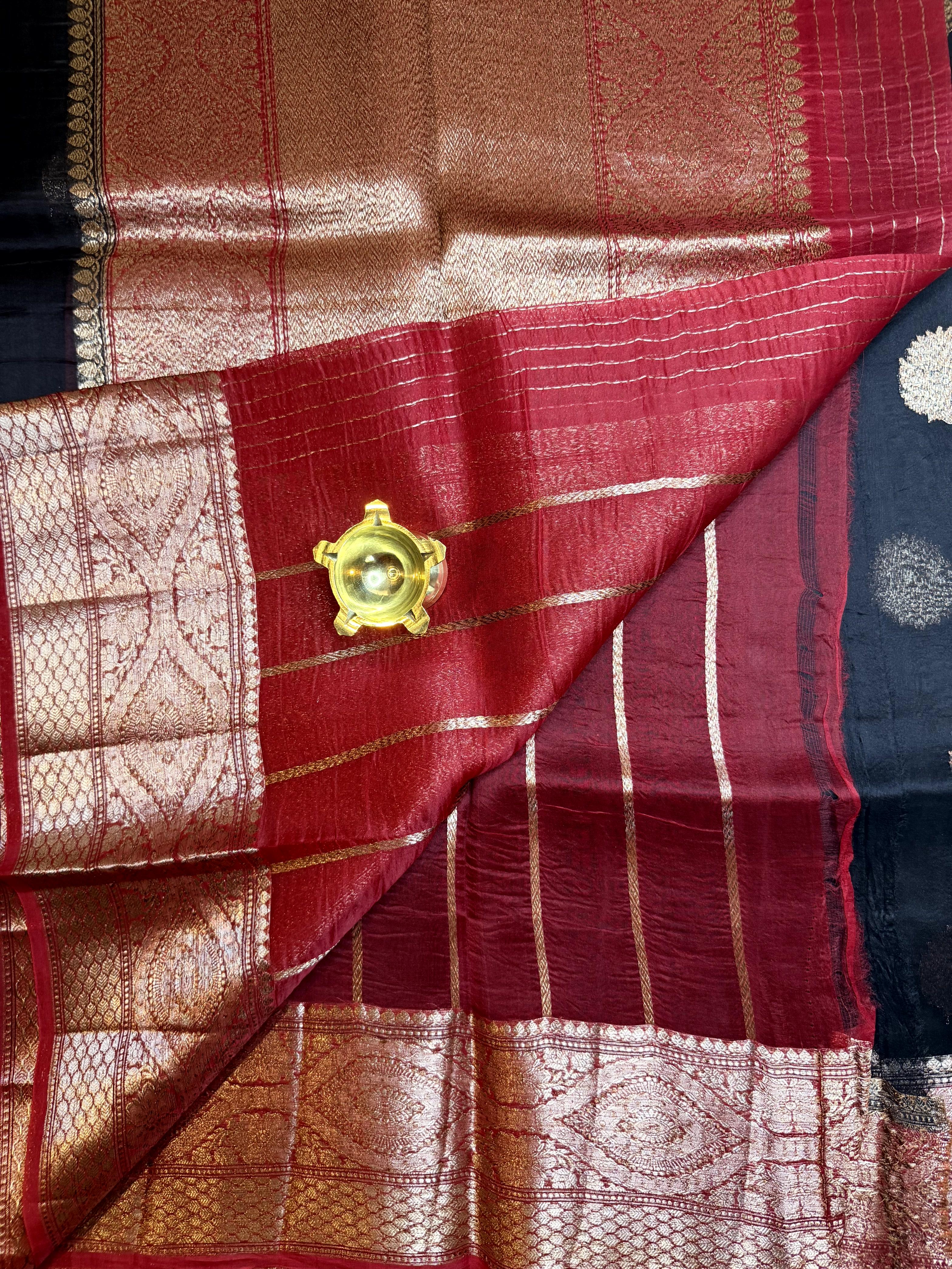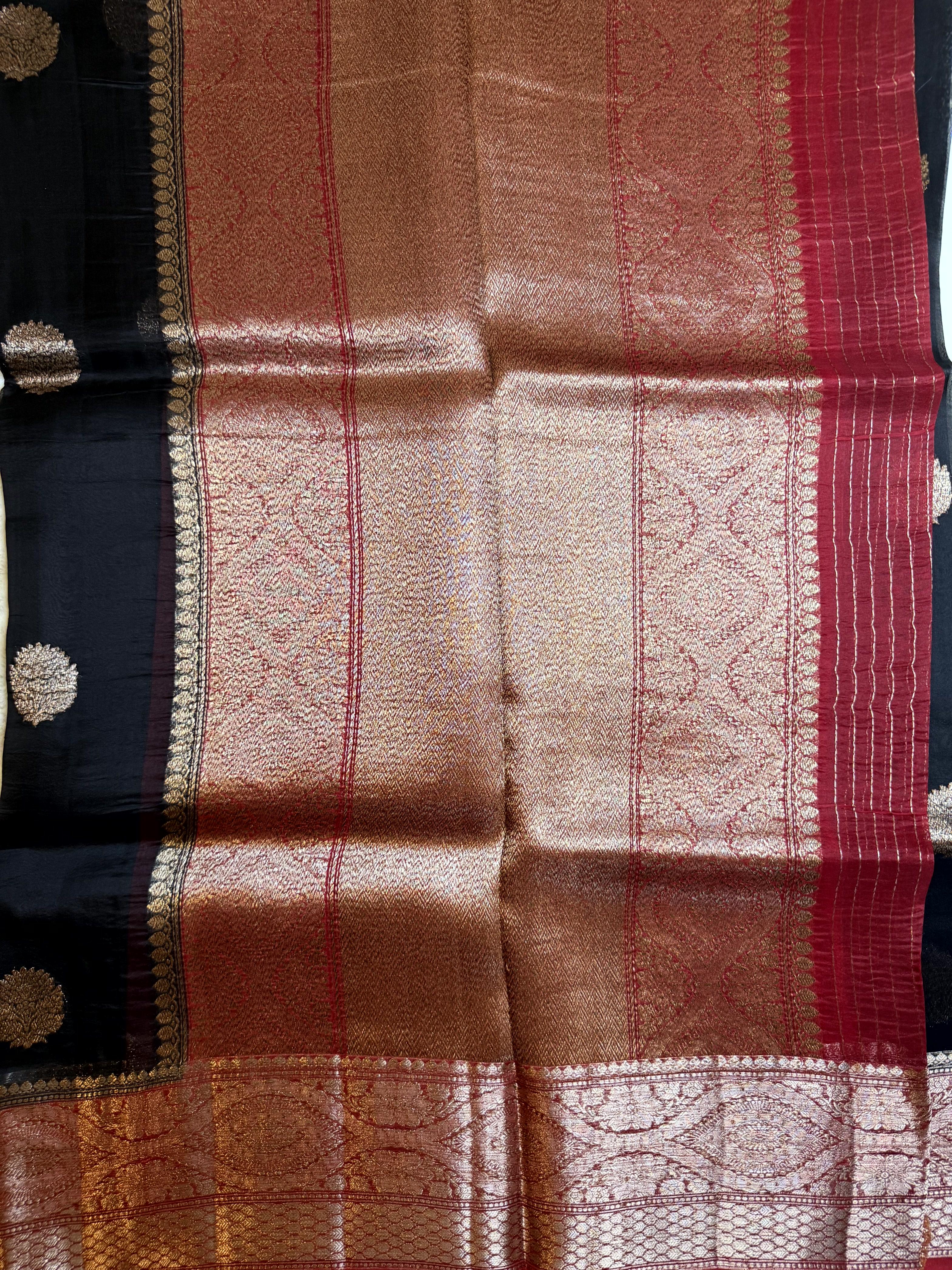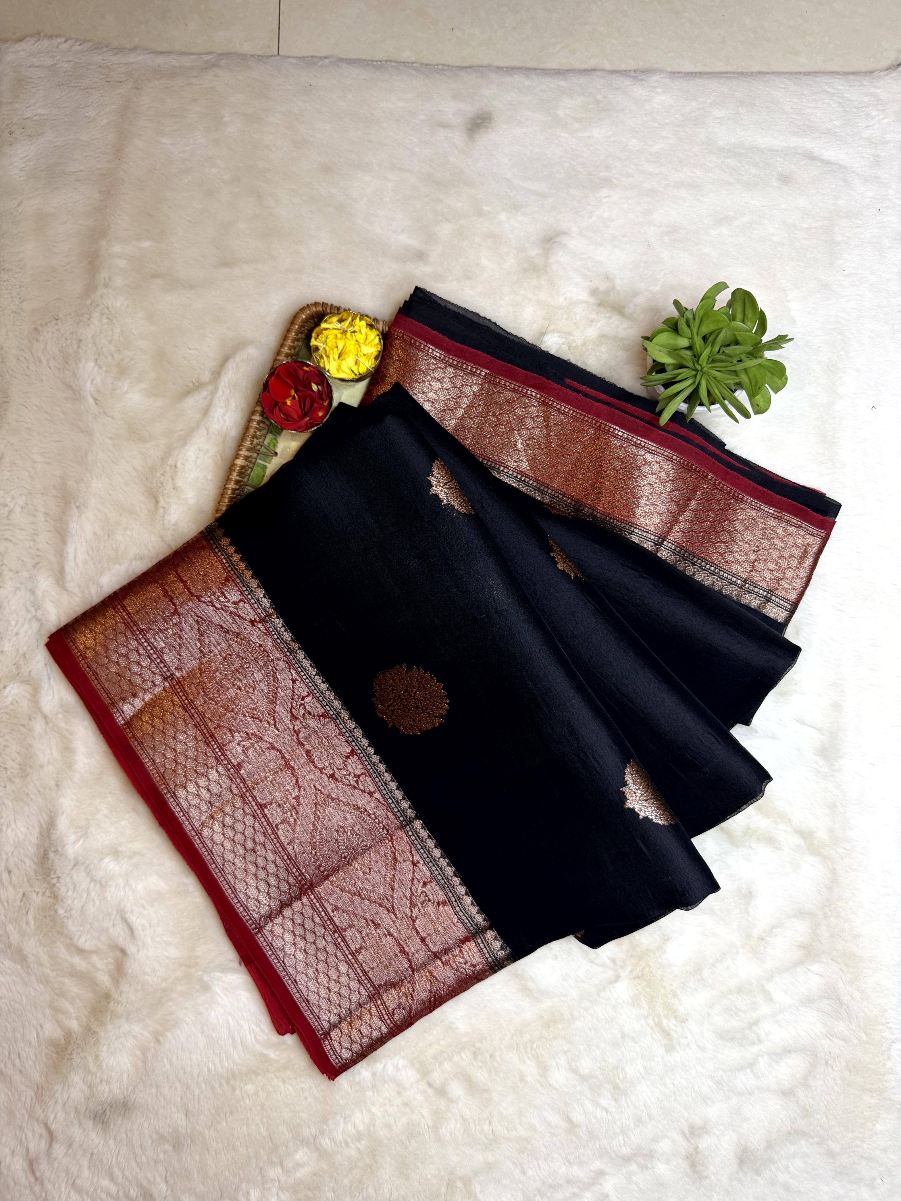 Bold, dramatic, and undeniably elegant โ this pure Kora organza handloom saree in striking jet black captivates at first glance. Its sheer, feather-light texture offers a graceful, structured fall while letting the craftsmanship shine through. The body is adorned with large red buttas, creating a vivid contrast that adds depth, richness, and a touch of traditional grandeur. Perfect for festive evenings, intimate receptions, and cultural celebrations, this saree blends modern minimalism with handloom heritage in the most artistic way. A statement piece for those who love sophistication with a bold edge โจ๐คโค๏ธ