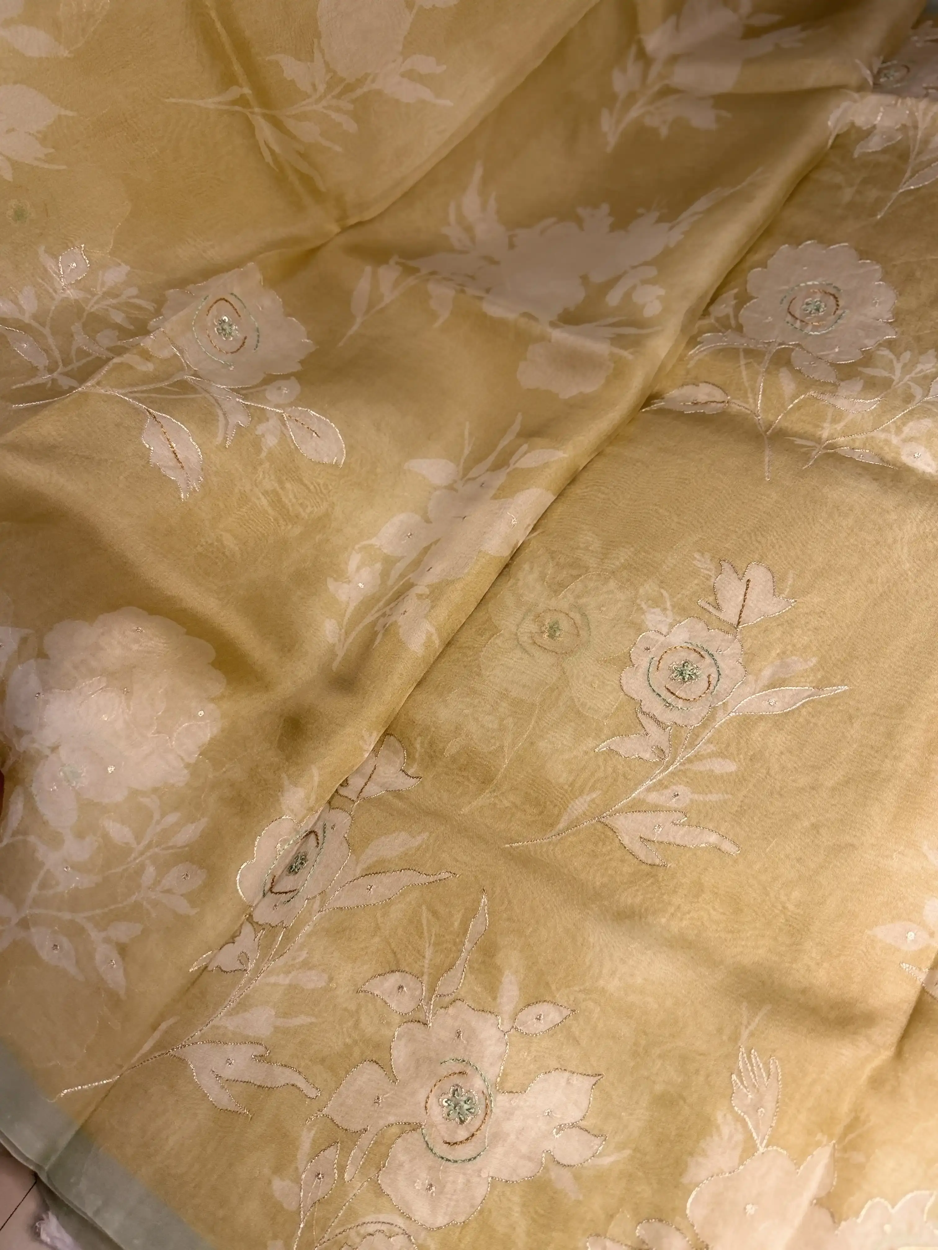 This organza saree blends refreshing lemon yellow and mint green tones, creating a light, airy look that feels effortlessly elegant. The sheer texture and soft sheen of organza add a delicate charm, making it perfect for daytime festivities and celebratory moments.
