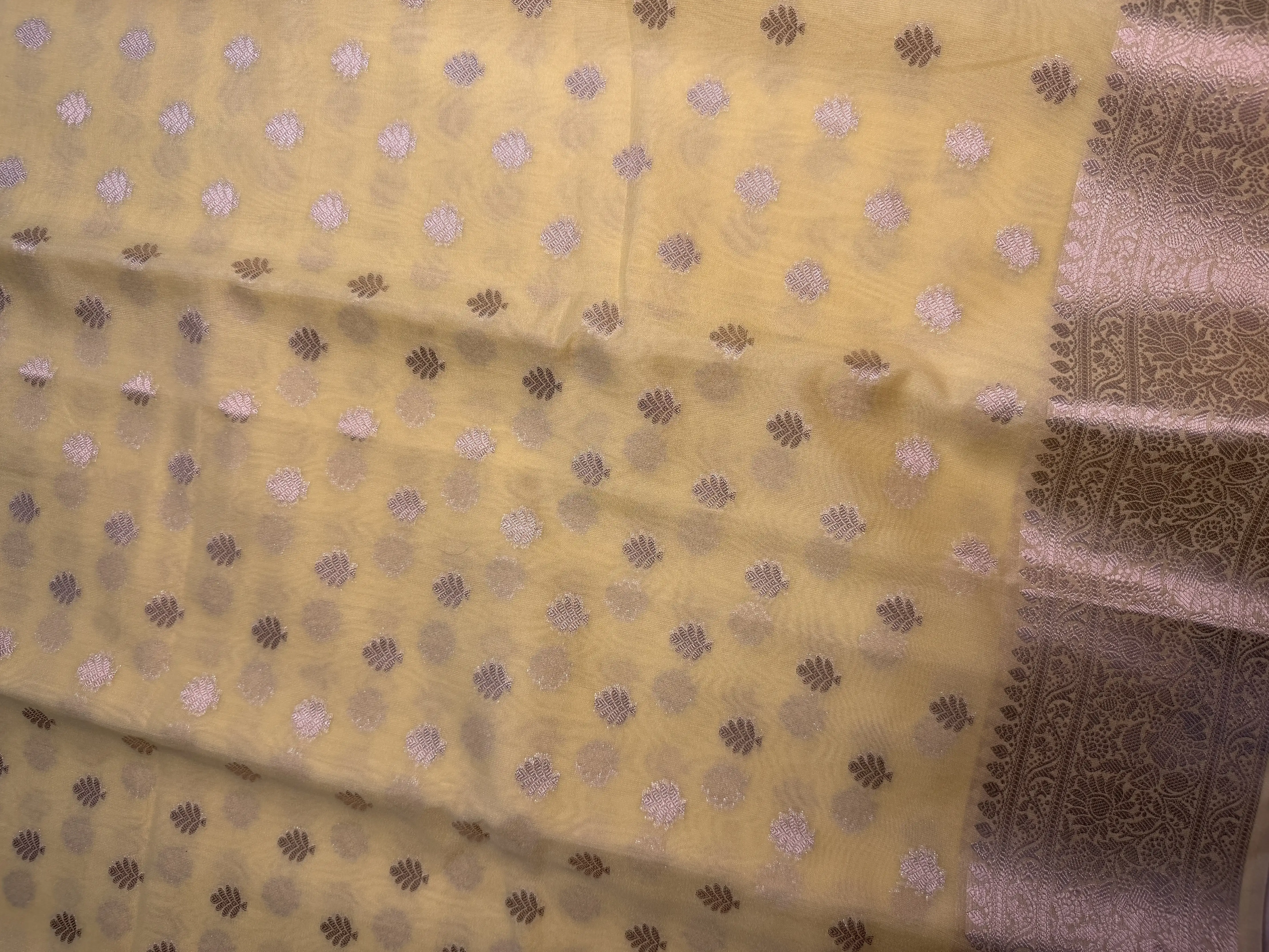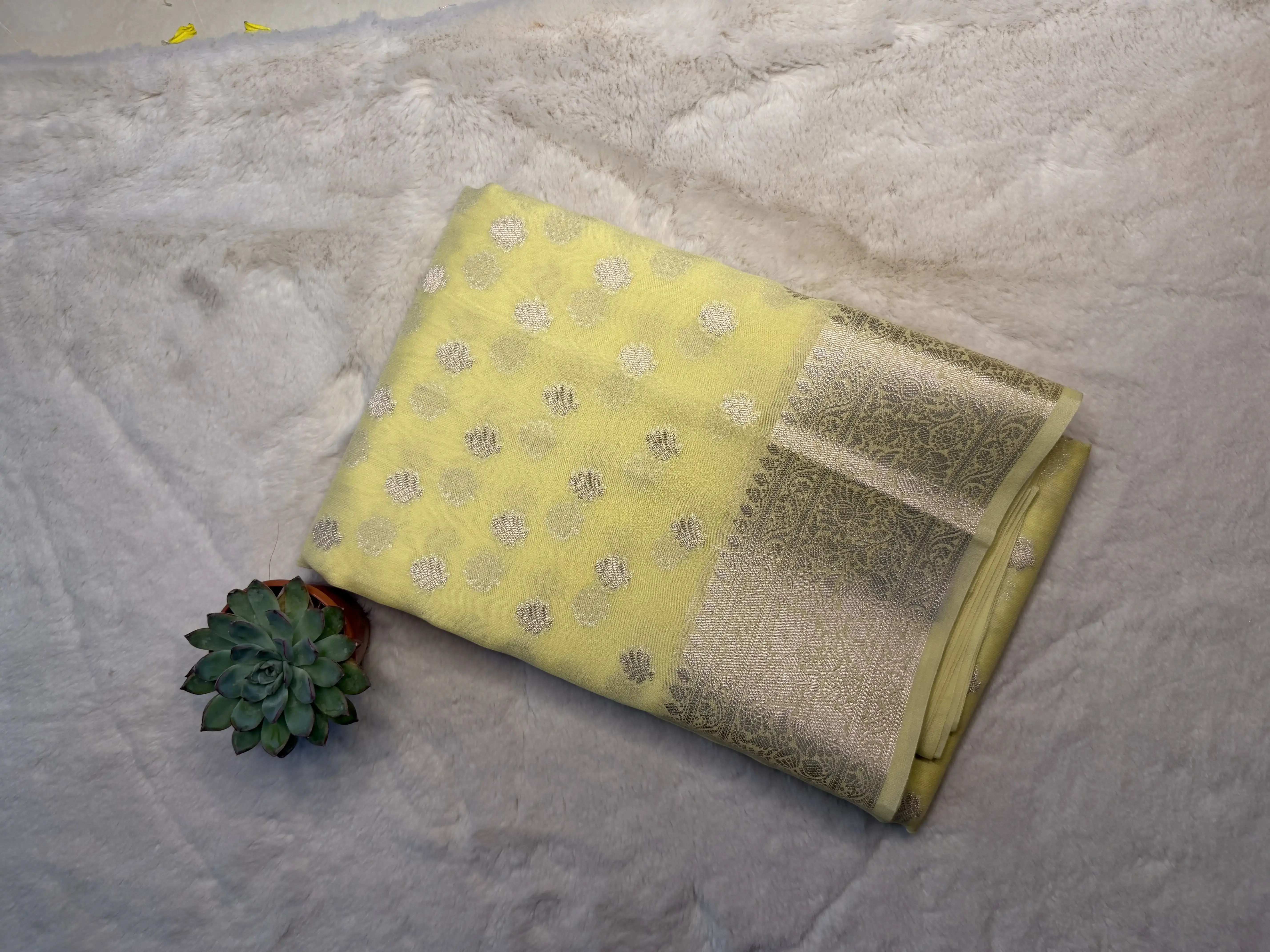 This lemon yellow chiffon saree is delicately adorned with buttas scattered gracefully across the fabric, adding a subtle yet charming detail. The sheer, flowing texture of chiffon lends an airy drape, perfect for warm days and vibrant occasions.
