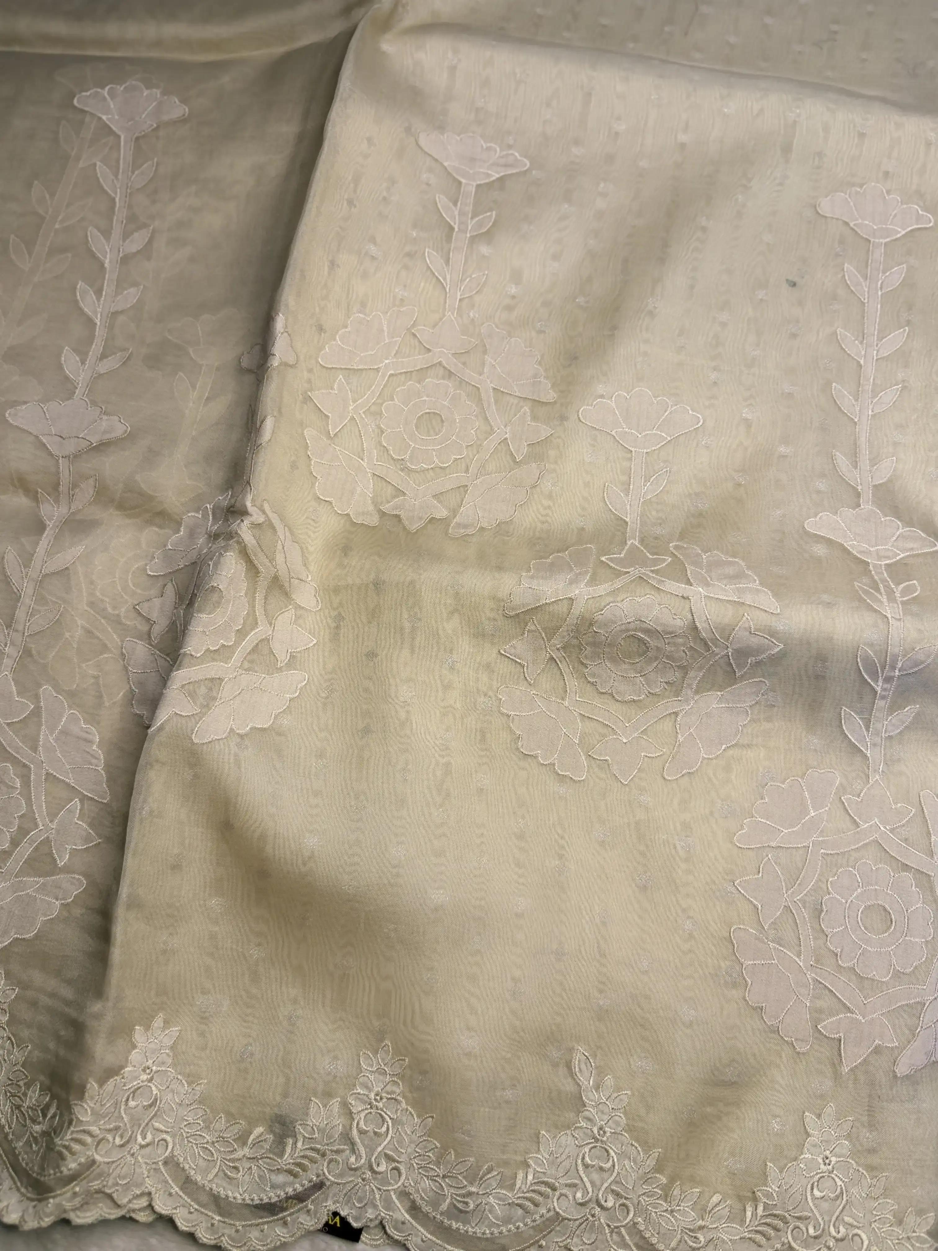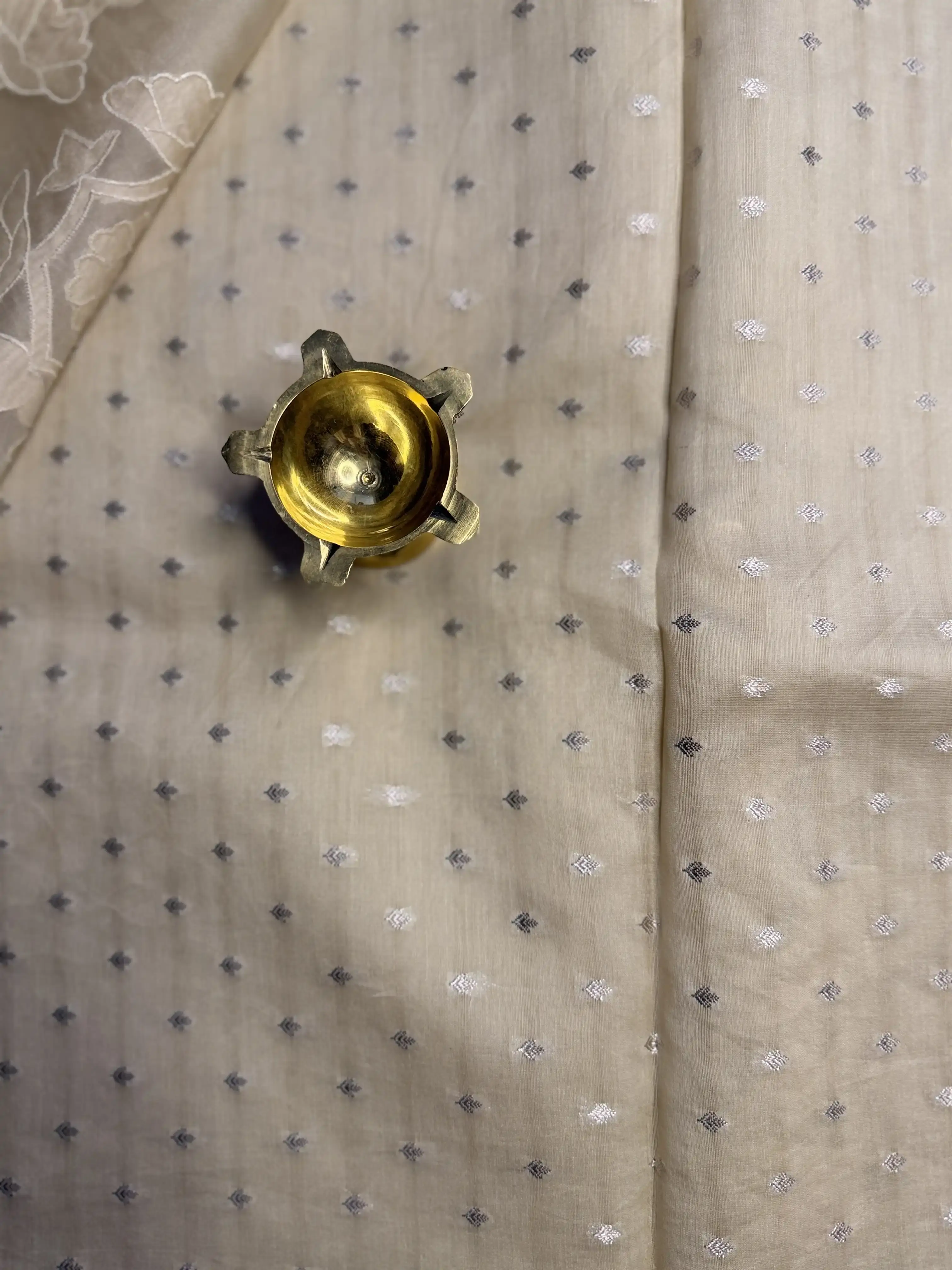 This light beige pure organza saree, featuring an elegant scallop design, drapes with airy grace and timeless charm—perfect for sophisticated occasions and serene celebrations. 🤍✨