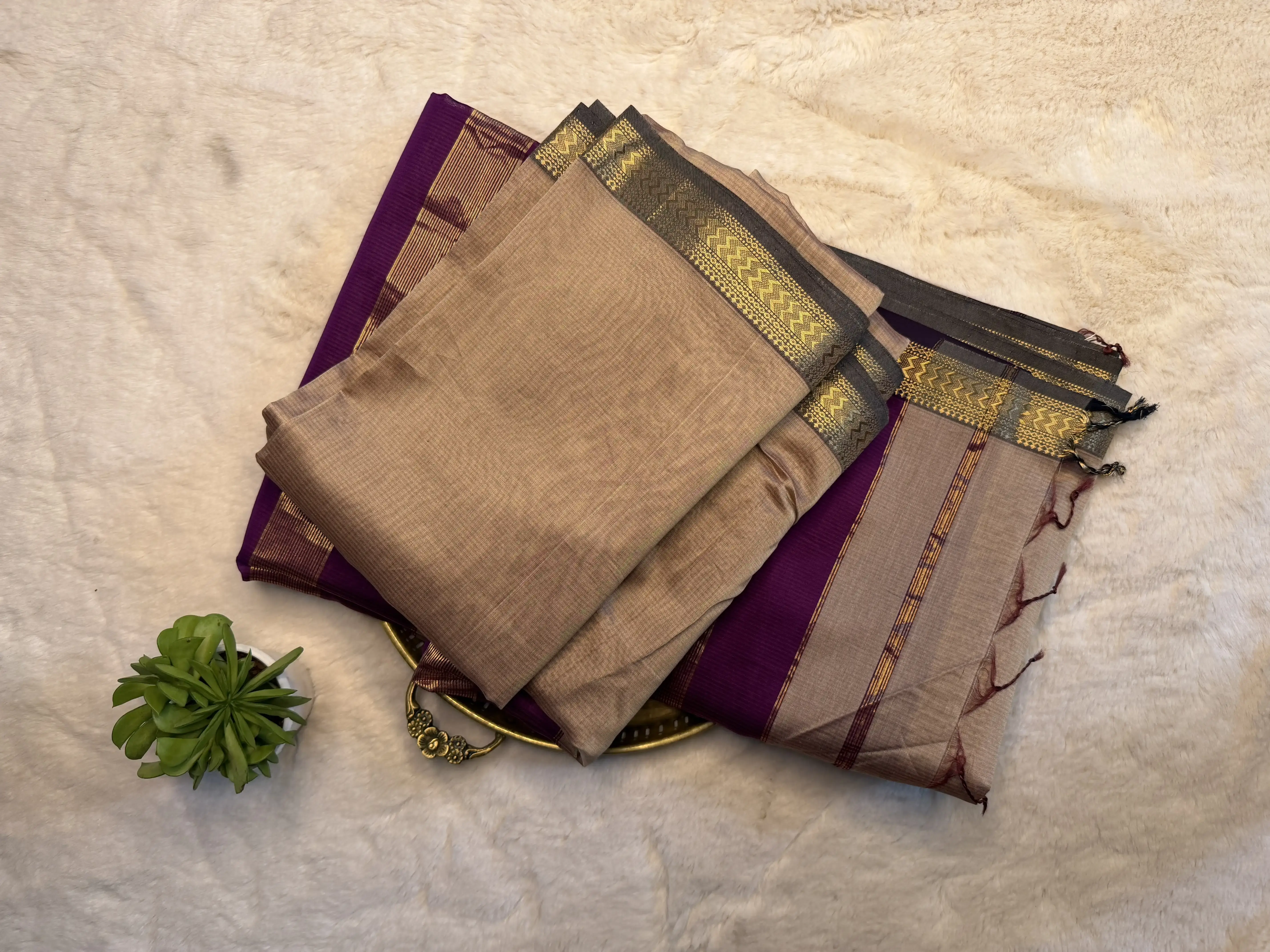 This light brown Maheshwari semi silk saree is elegantly paired with grey accents, creating a calm and refined colour harmony. The signature Maheshwari weave lends it a rich yet lightweight texture, while the semi silk fabric ensures a smooth, comfortable drape. Perfect for festive occasions, office wear, and cultural gatherings, this saree reflects understated elegance with timeless appeal 🤎🩶