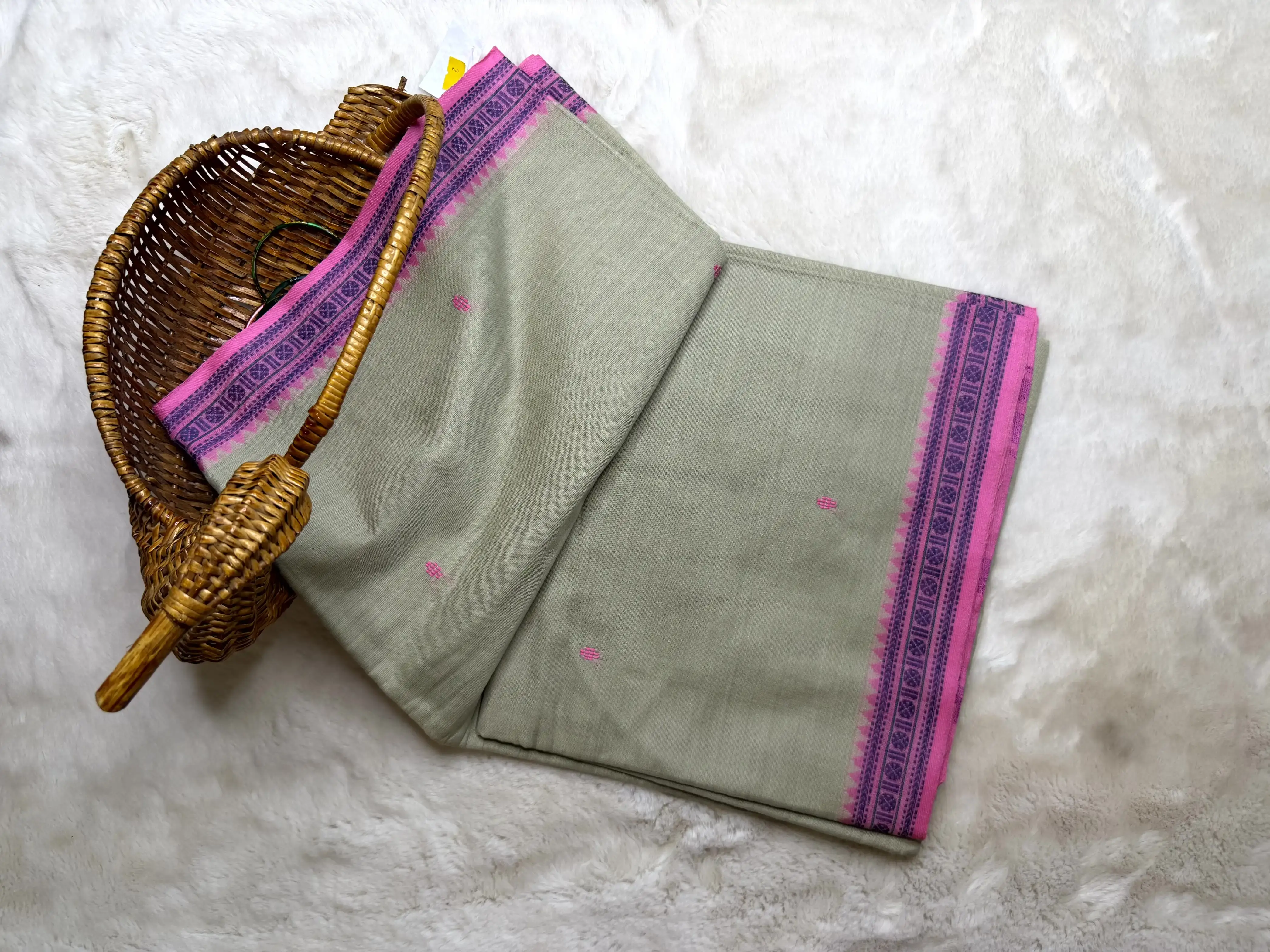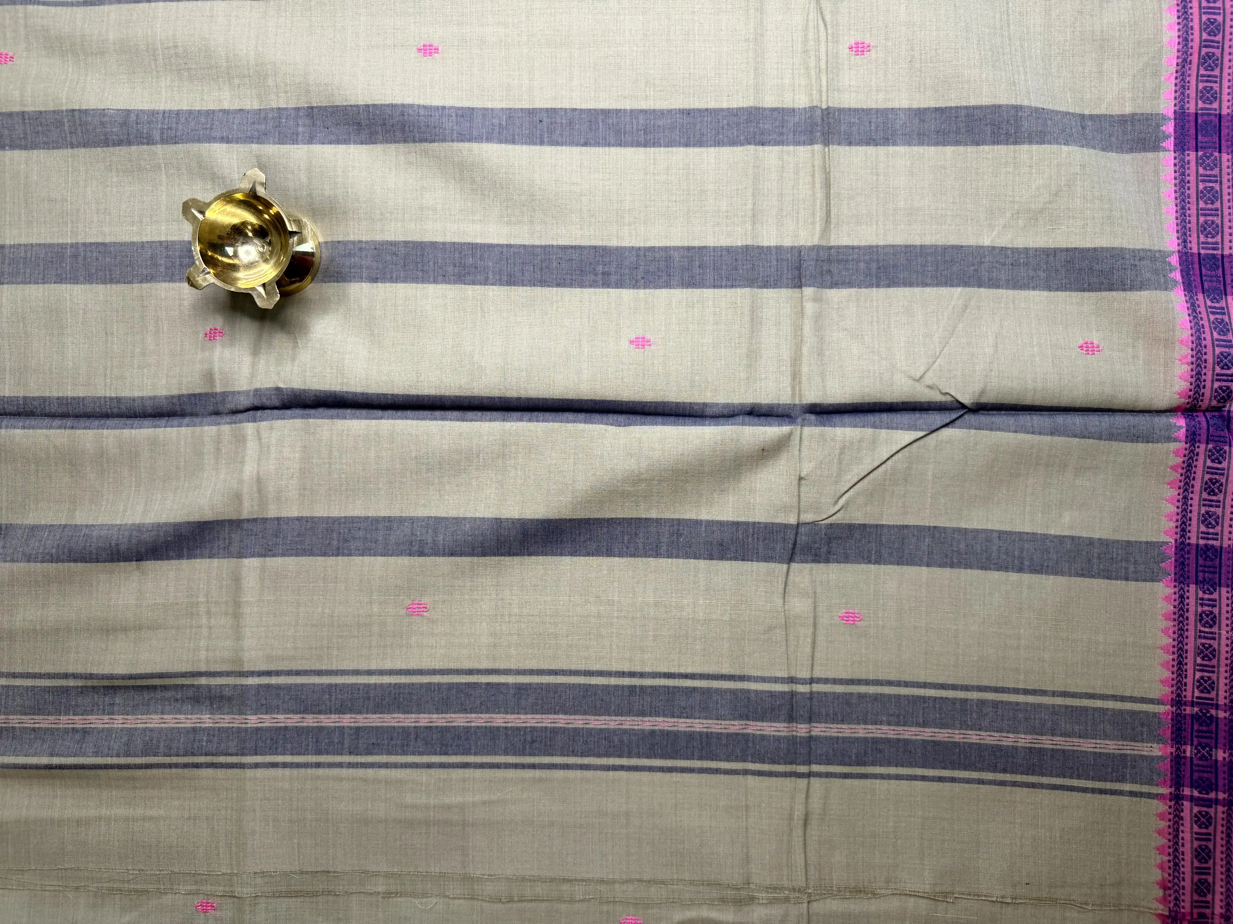 This light grey Mul-Mul cotton saree comes paired with a soothing purple contrast, creating an elegant yet fresh colour play. The feather-soft mulmul fabric drapes effortlessly, making it perfect for daily wear, summer styling, or casual chic looks.