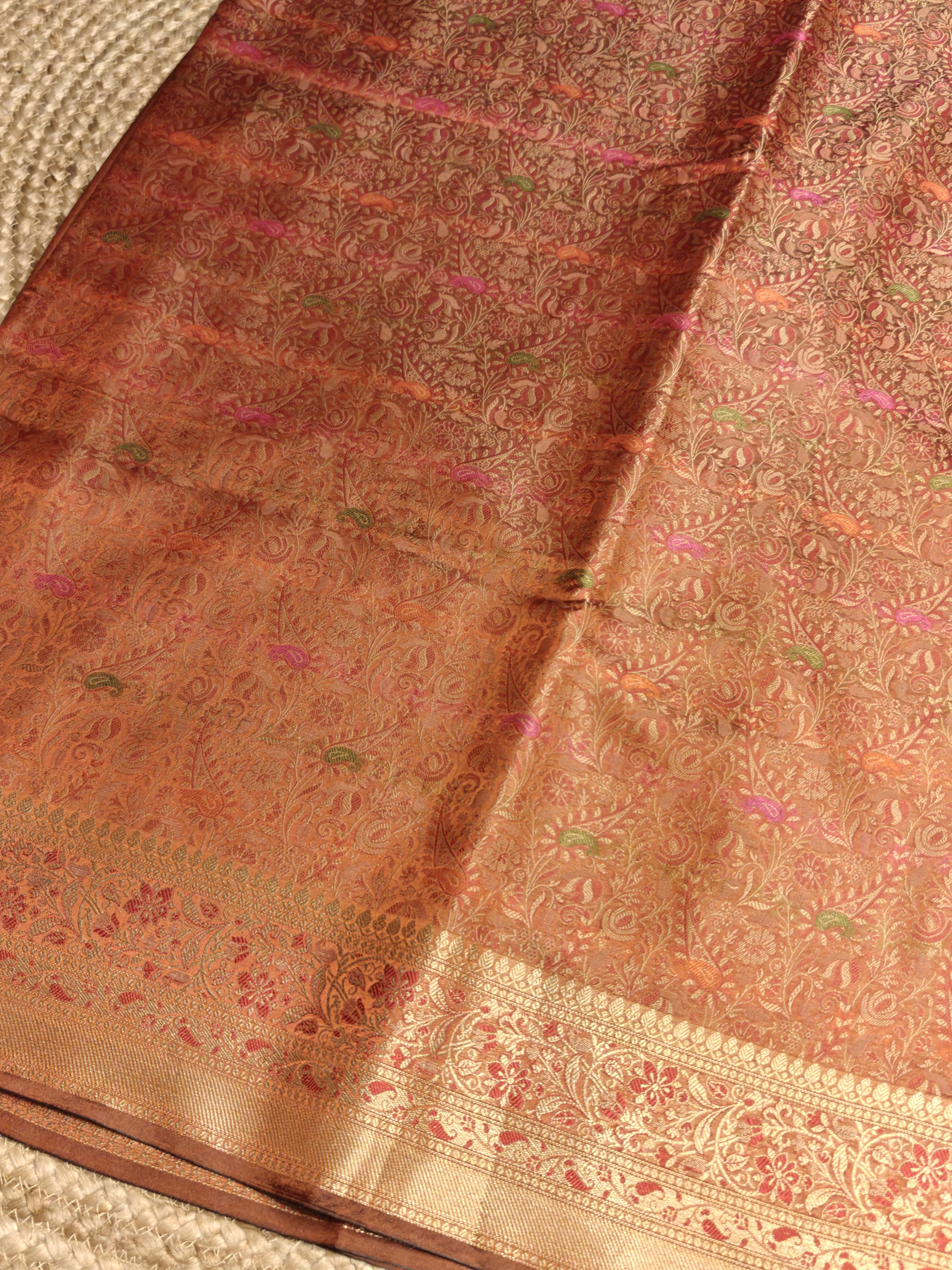 Radiate subtle elegance in this Light Orange Meenakari Work Benaras Saree 🧡✨