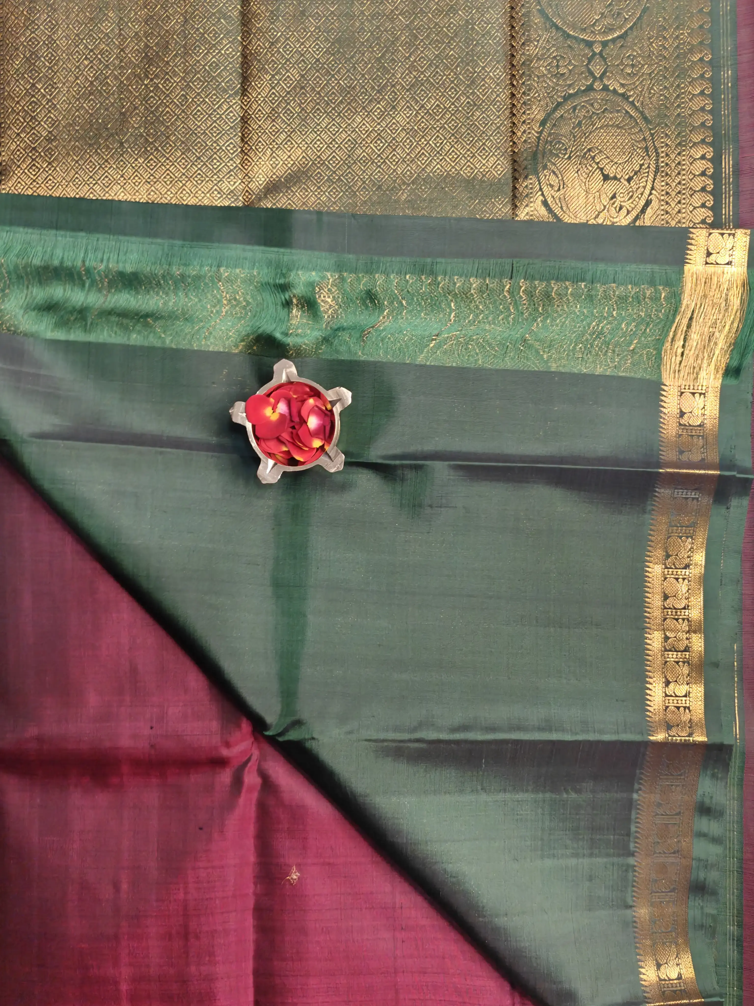 This maroon silk saree features delicate small motifs across the body, paired with a green peacock motif border that adds a touch of traditional charm. An elegant choice for festive days and timeless ethnic styling ❤️💚