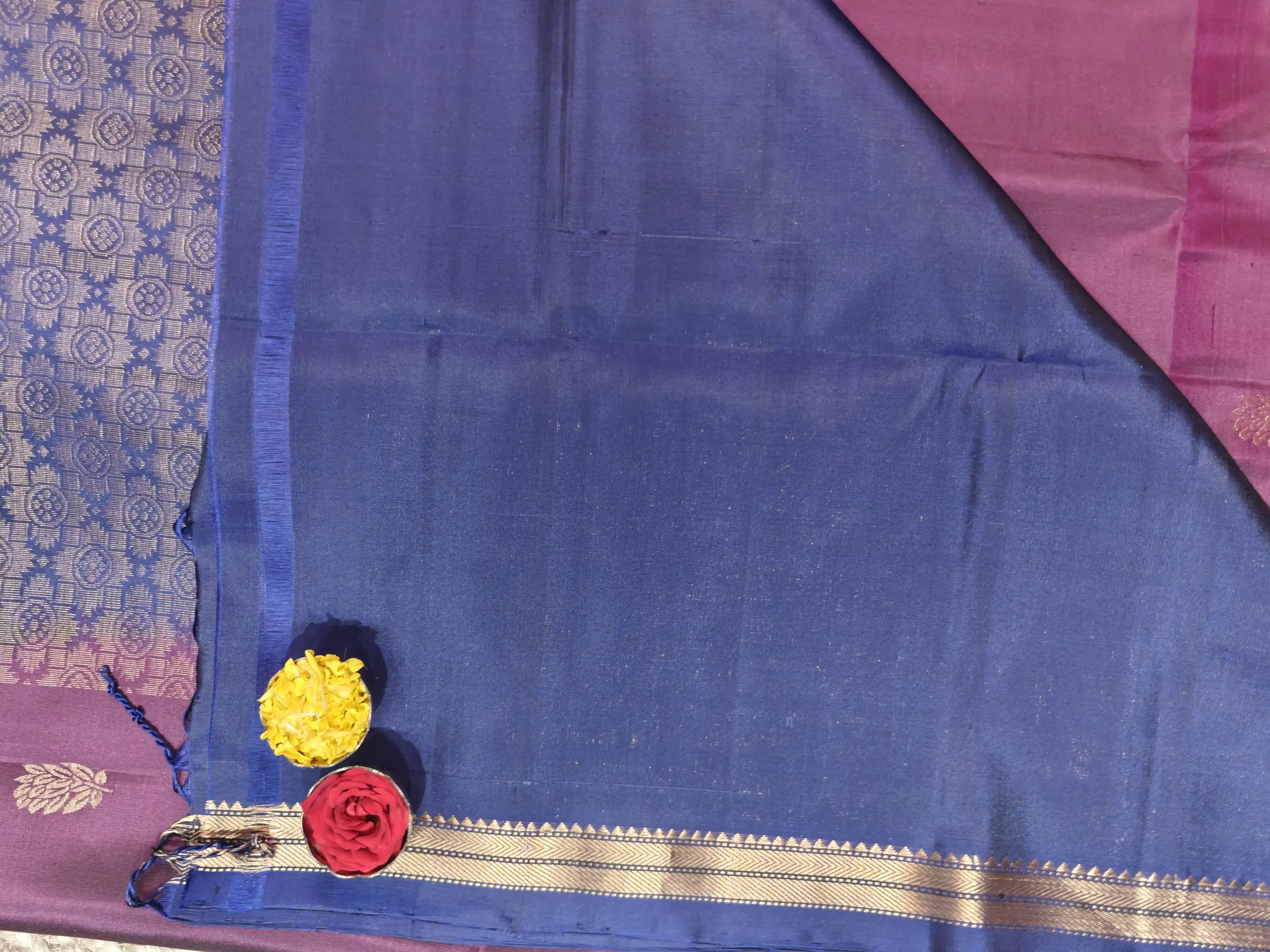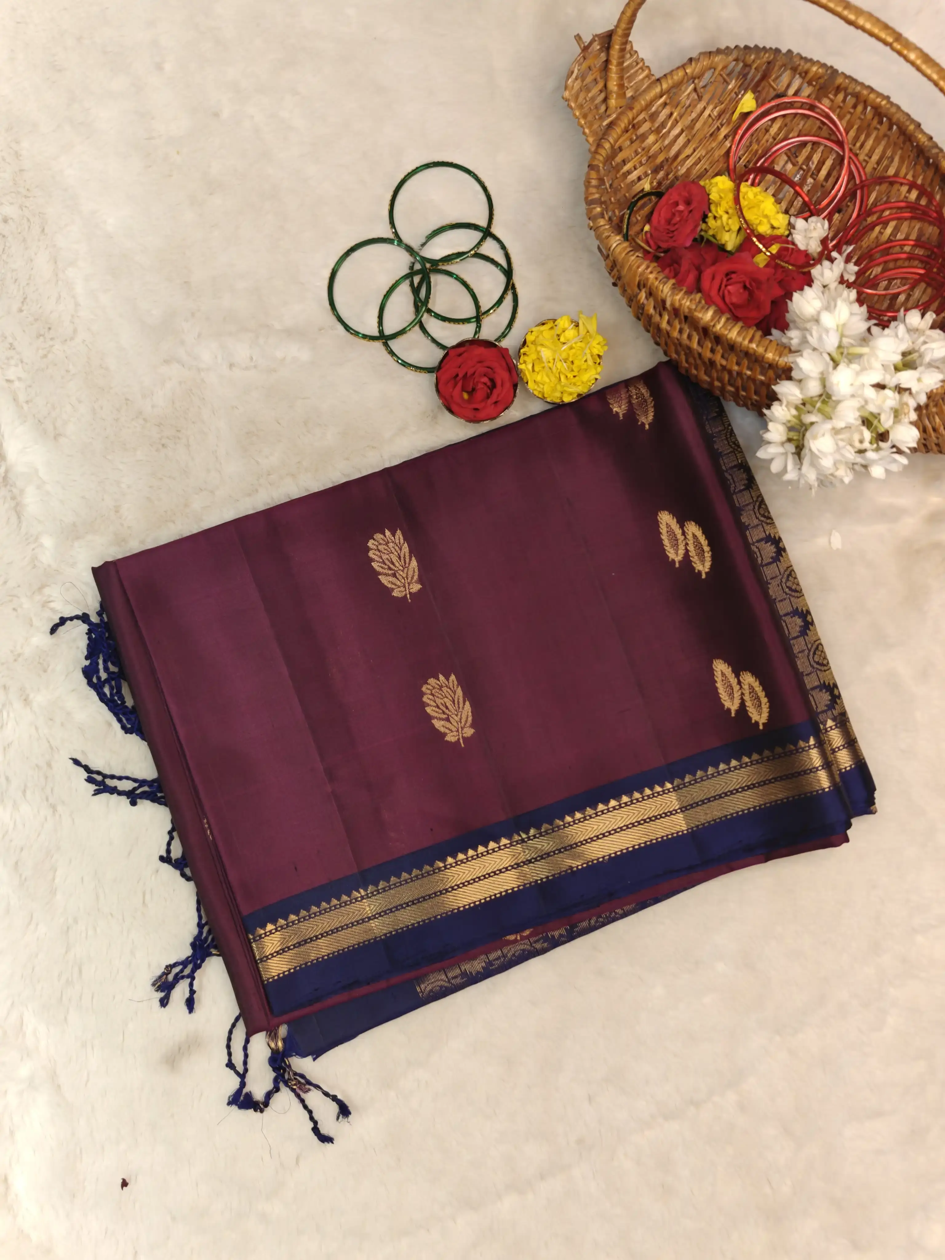This maroon and navy blue soft silk saree features elegant motifs woven all over the body, creating a graceful blend of depth and tradition. A perfect choice for festive moments and classic celebrations ❤️💙