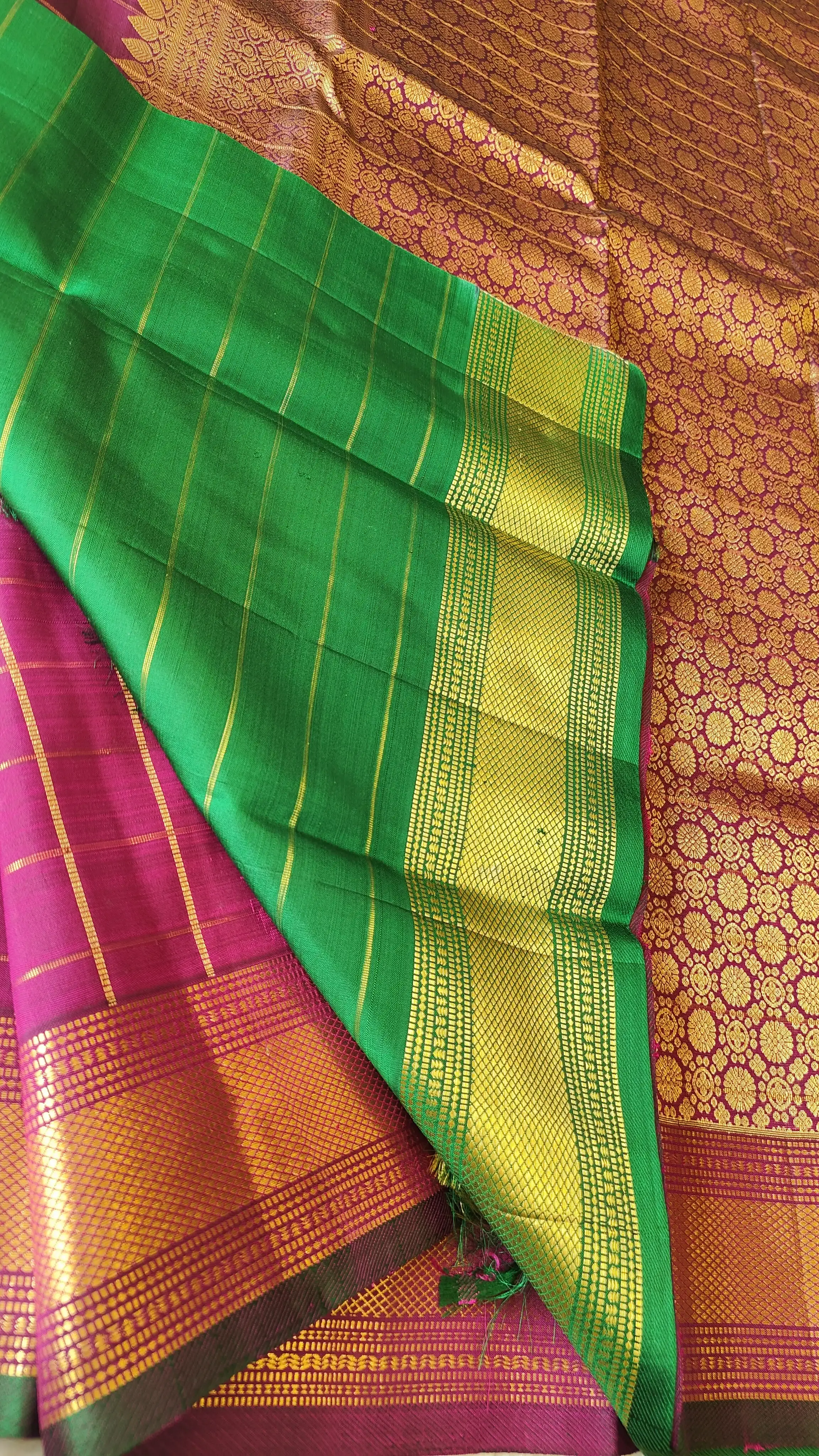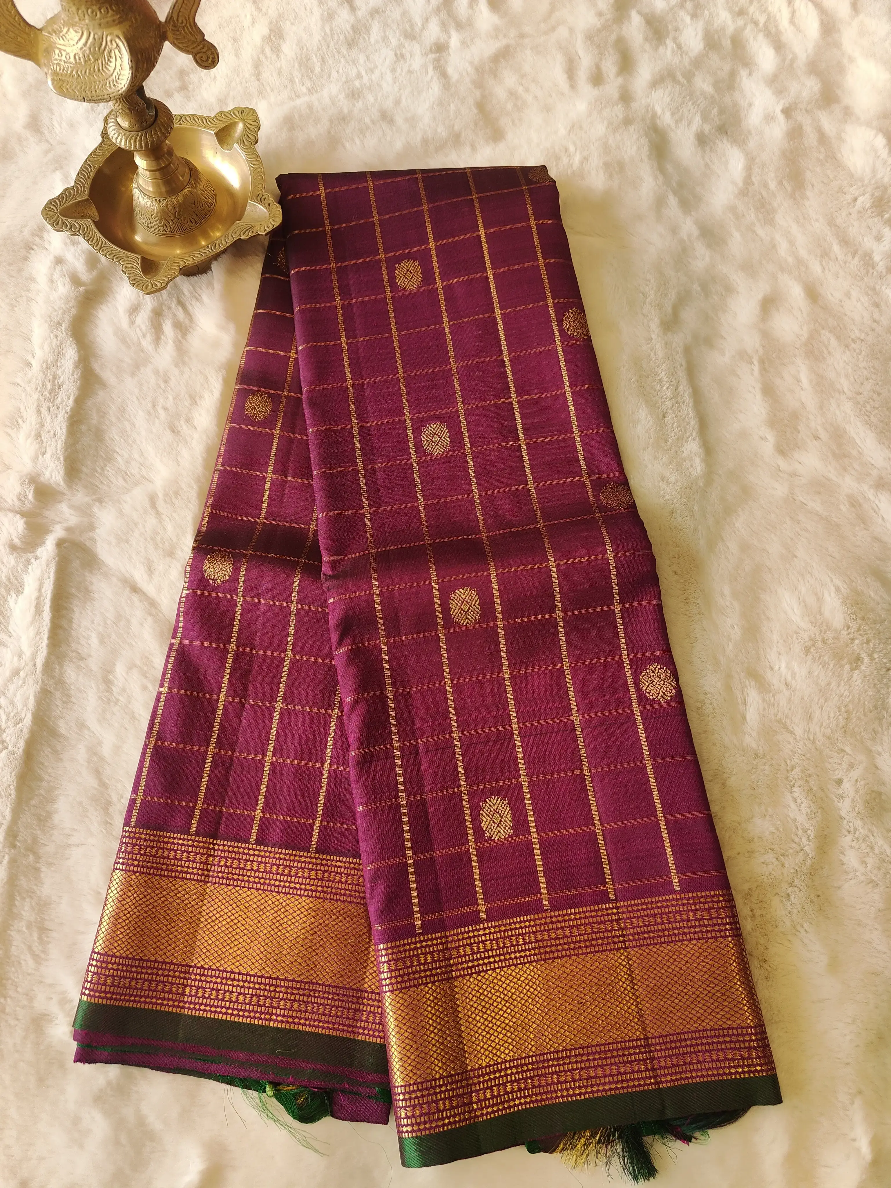The depth of maroon checks meets the finesse of subtle motif detailing, creating a beautifully balanced silk saree. Complemented by a green contrast blouse, this Kanchipuram weave exudes elegance, heritage, and refined grandeur.