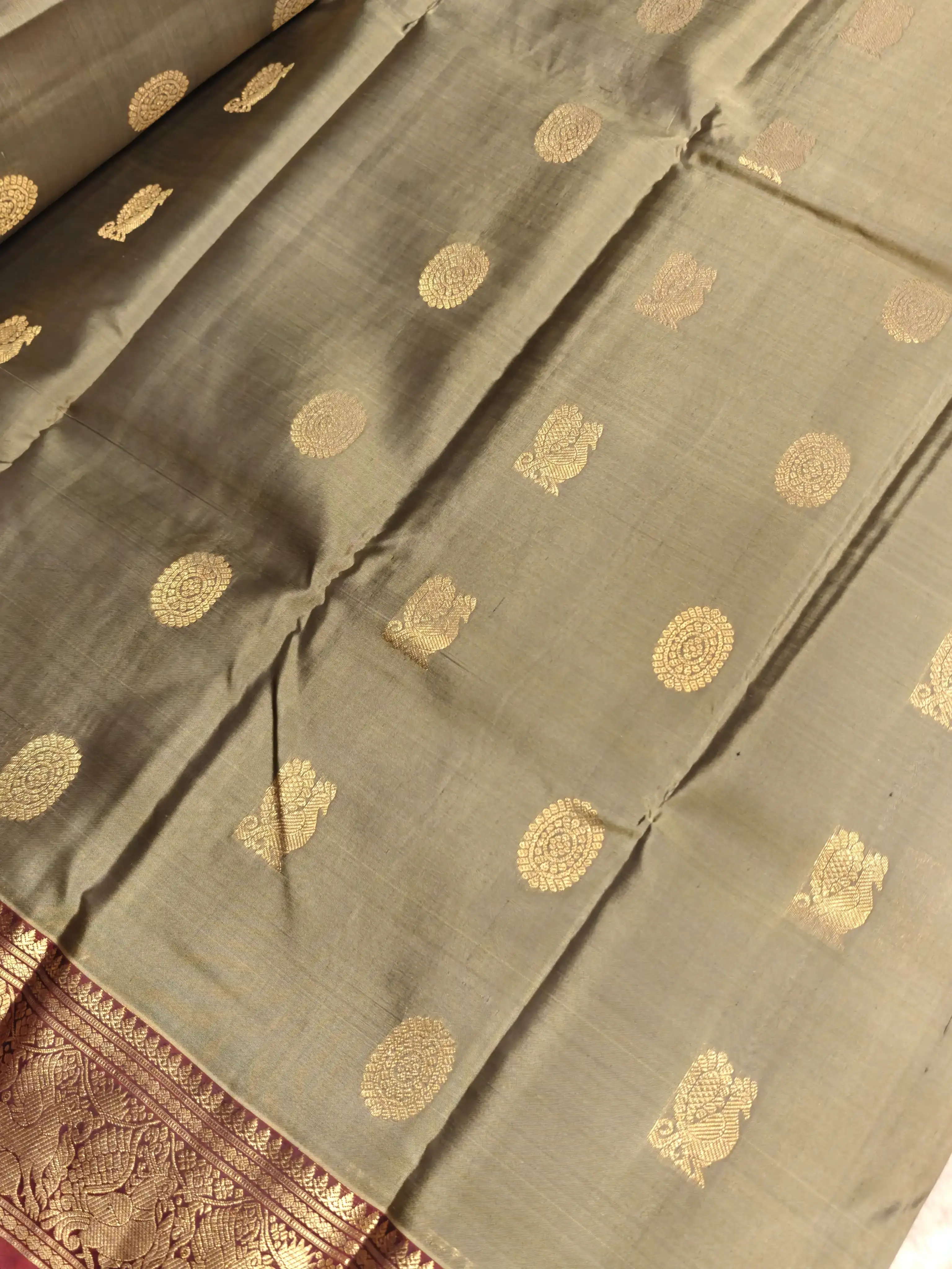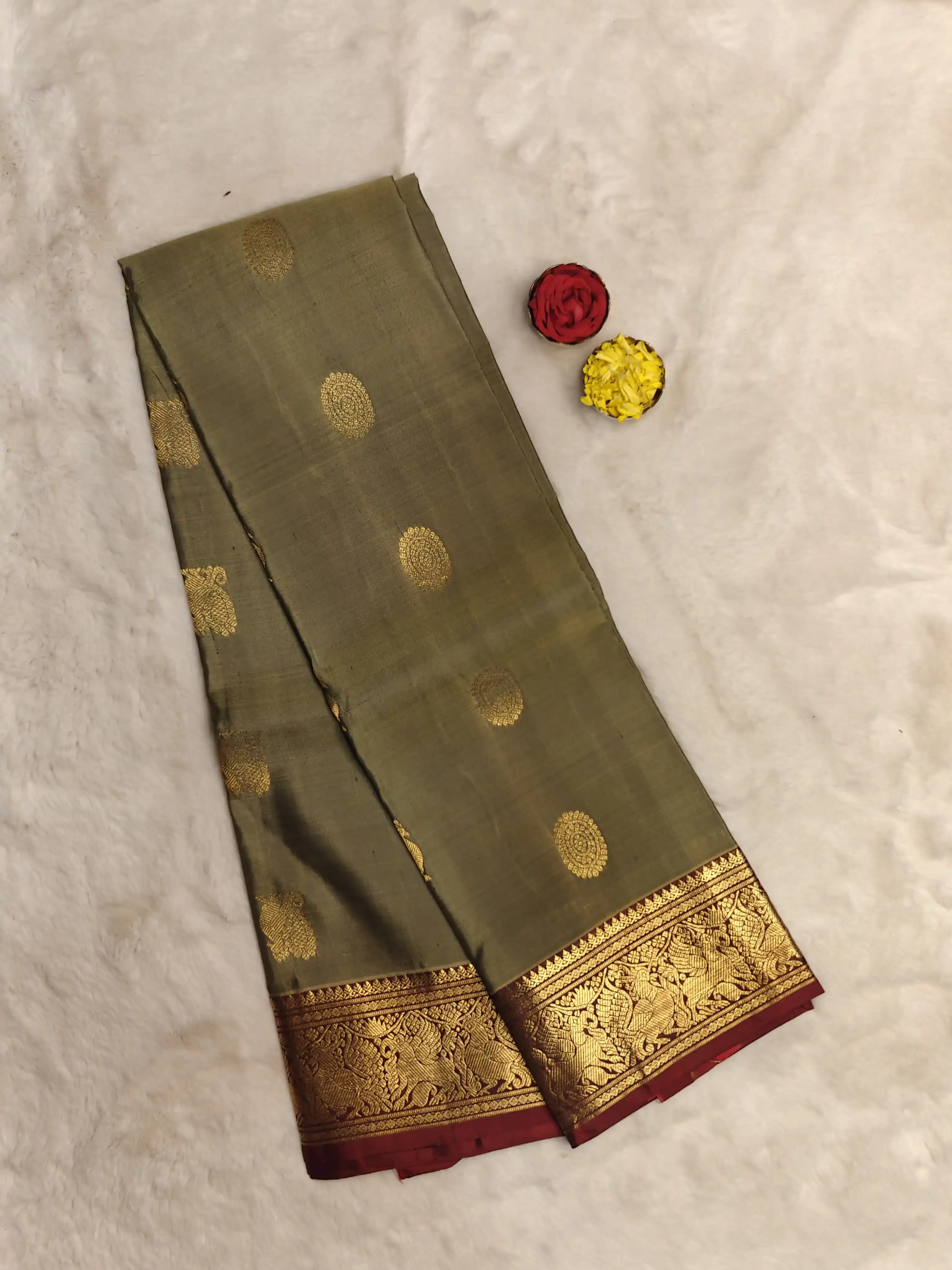 This exquisite mehendi green silk saree is beautifully framed with a deep maroon border, adding rich contrast and timeless appeal. The look is elevated by a luxurious maroon pallu that showcases intricate craftsmanship and festive grandeur. Perfect for weddings, special ceremonies, and cultural celebrations, this saree is a stunning expression of heritage woven in vibrant hues 💚❤️