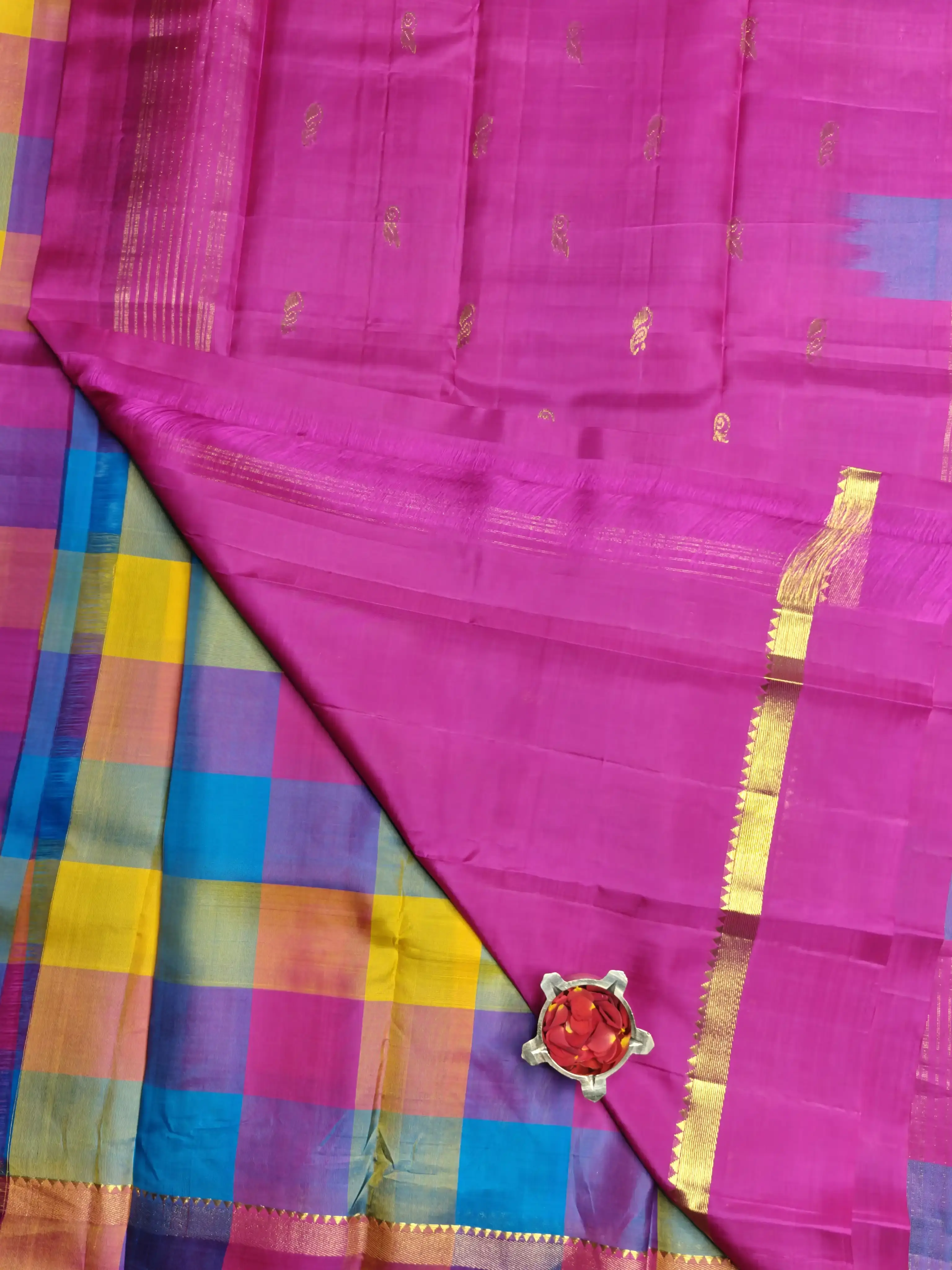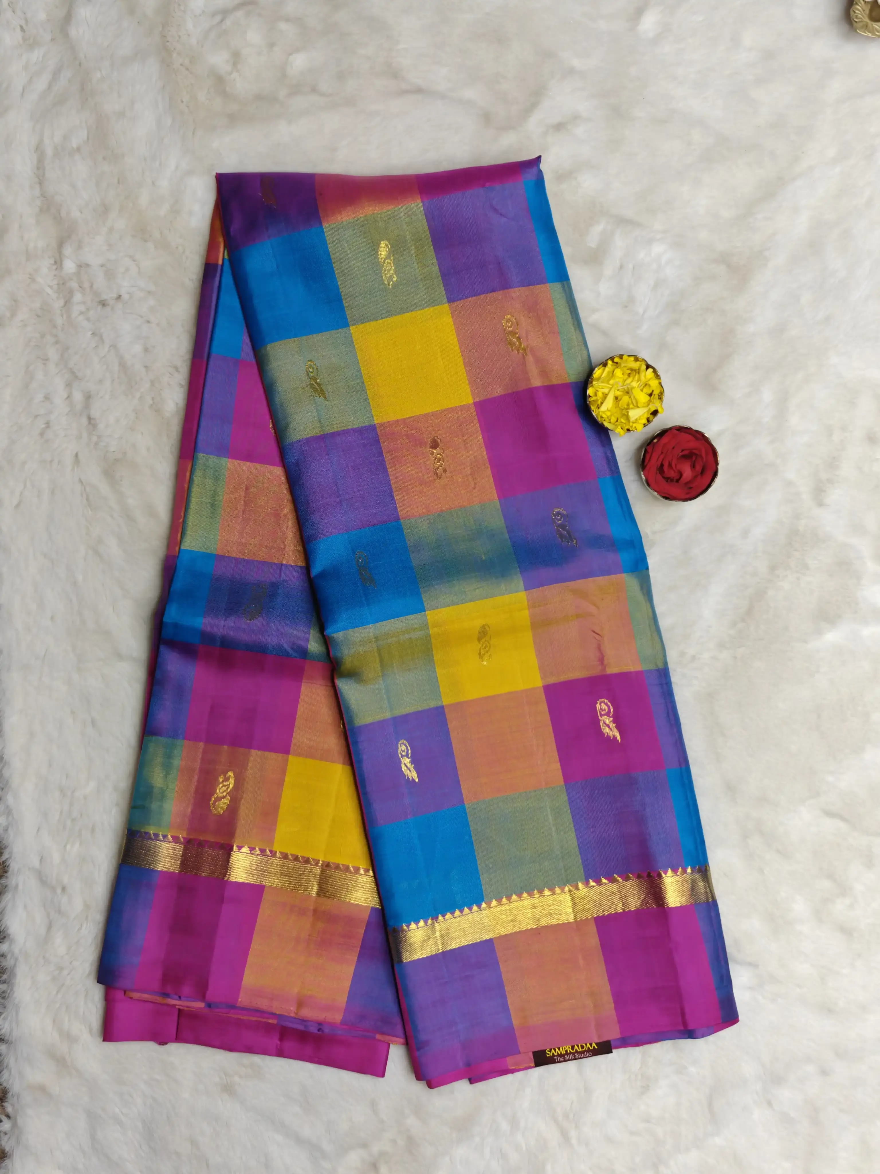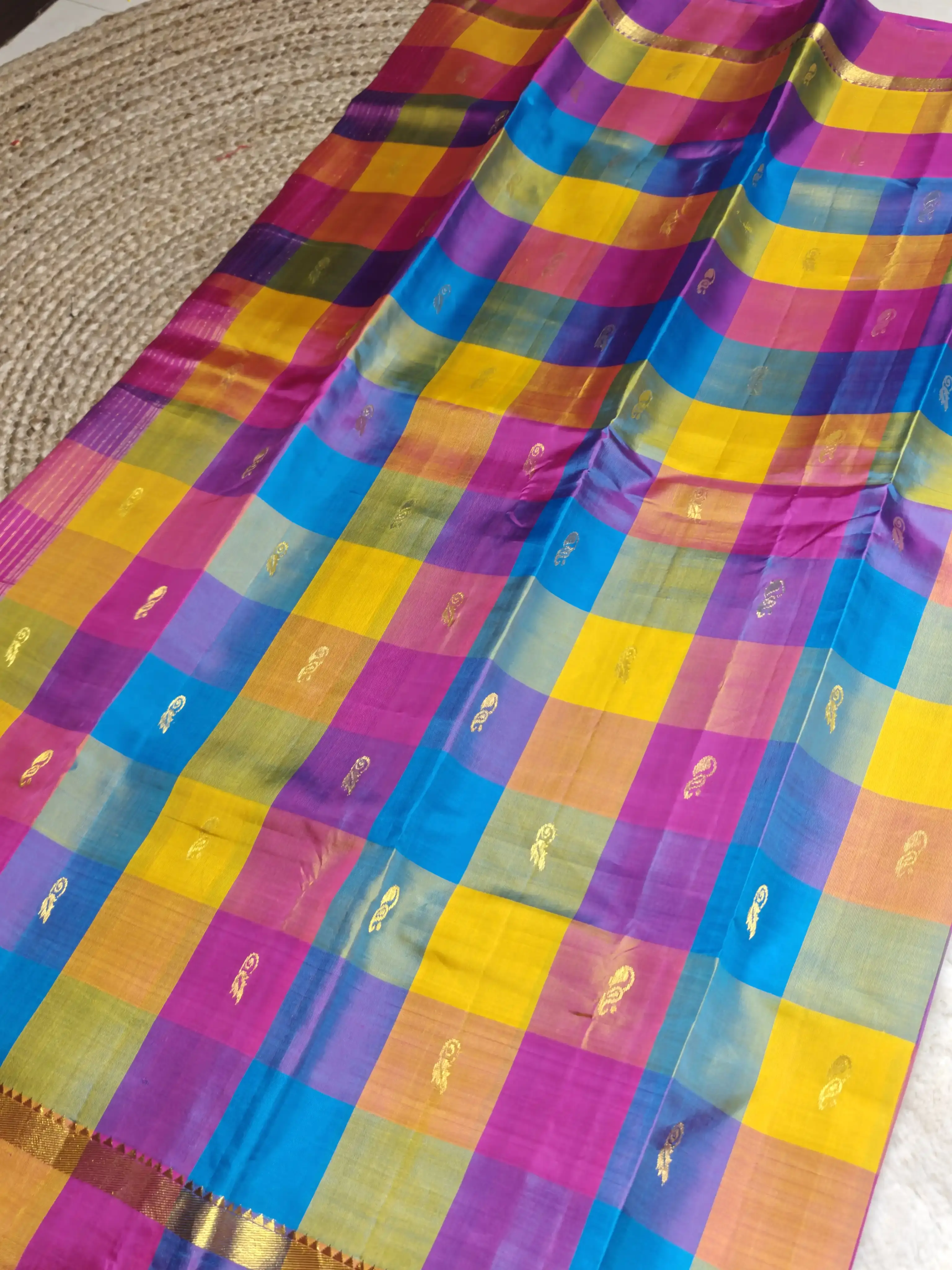 This elegant silk saree with multicoloured checks is beautifully enhanced with delicate small motifs, reflecting classic Indian craftsmanship. The harmonious blend of vibrant hues and subtle detailing creates a graceful, heritage-inspired look. Perfect for festive occasions, temple visits, and cultural celebrations, this saree embodies tradition, warmth, and enduring elegance ✨