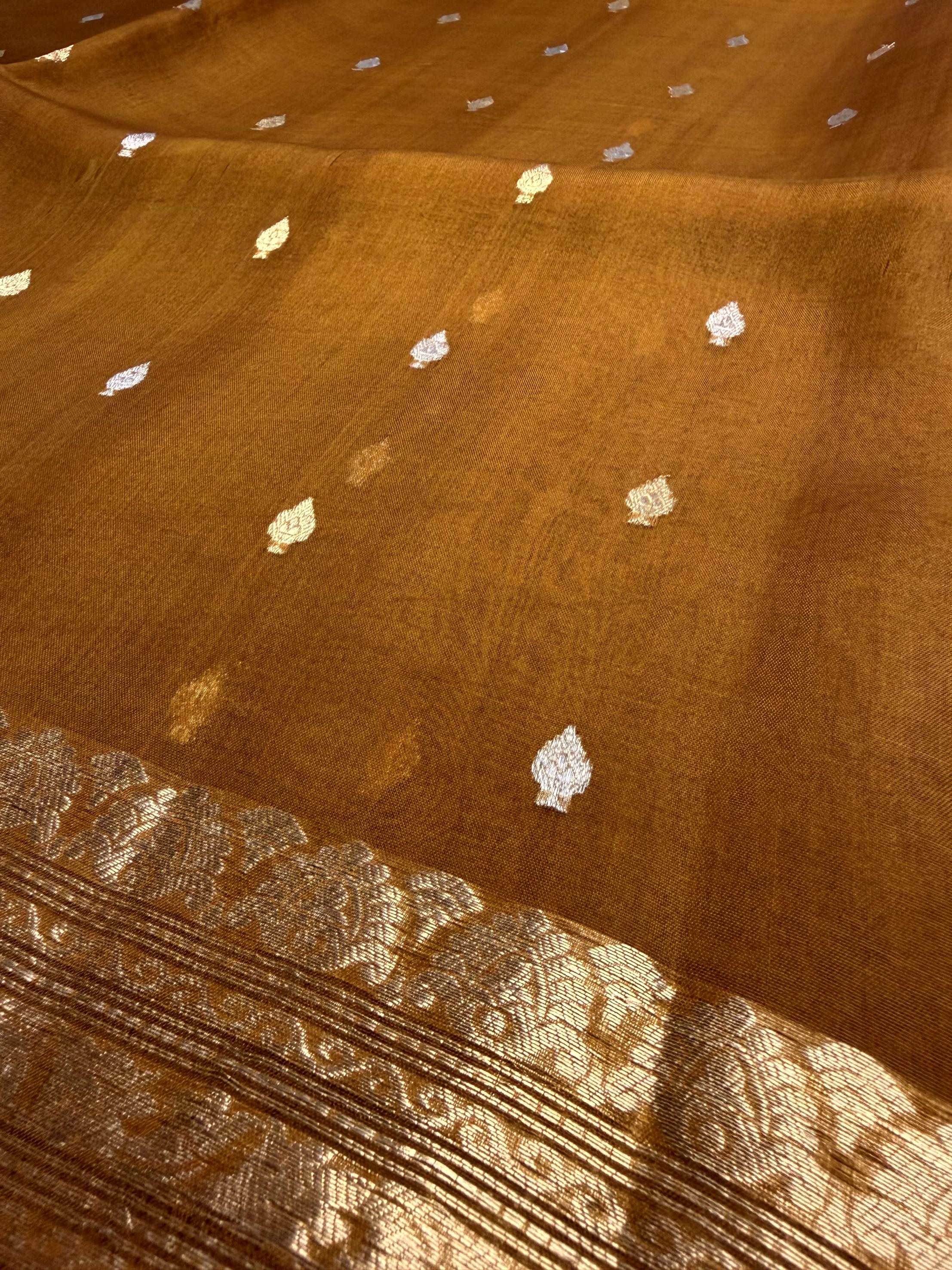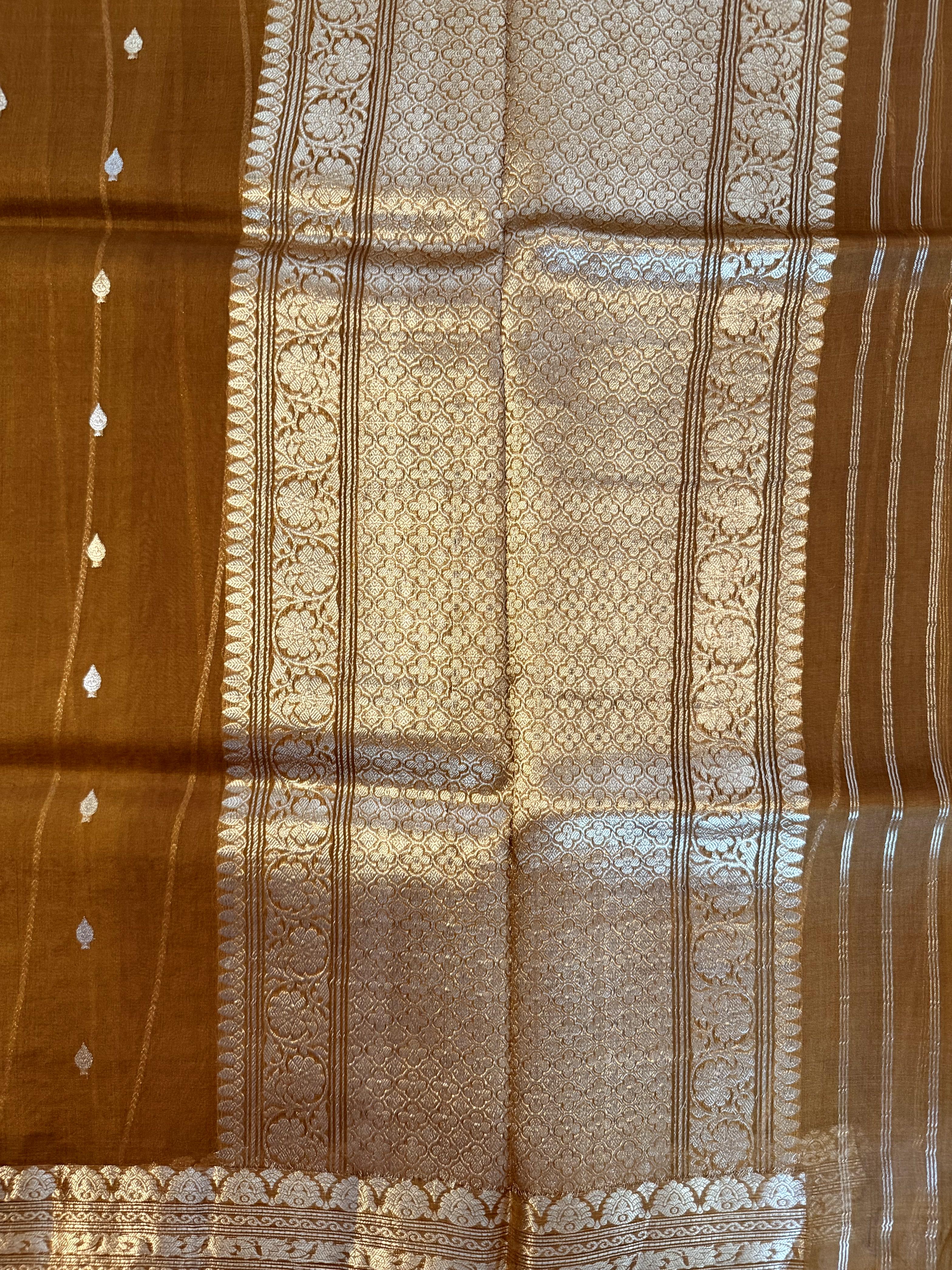 This mustard yellow pure kora organza saree is adorned with elegant antique zari work and delicate buttas scattered across the body, creating a refined and airy silhouette. The sheer organza texture paired with the muted zari sheen gives it an effortlessly luxurious look—perfect for weddings, festive occasions, and heritage celebrations where tradition meets graceful sophistication 💛