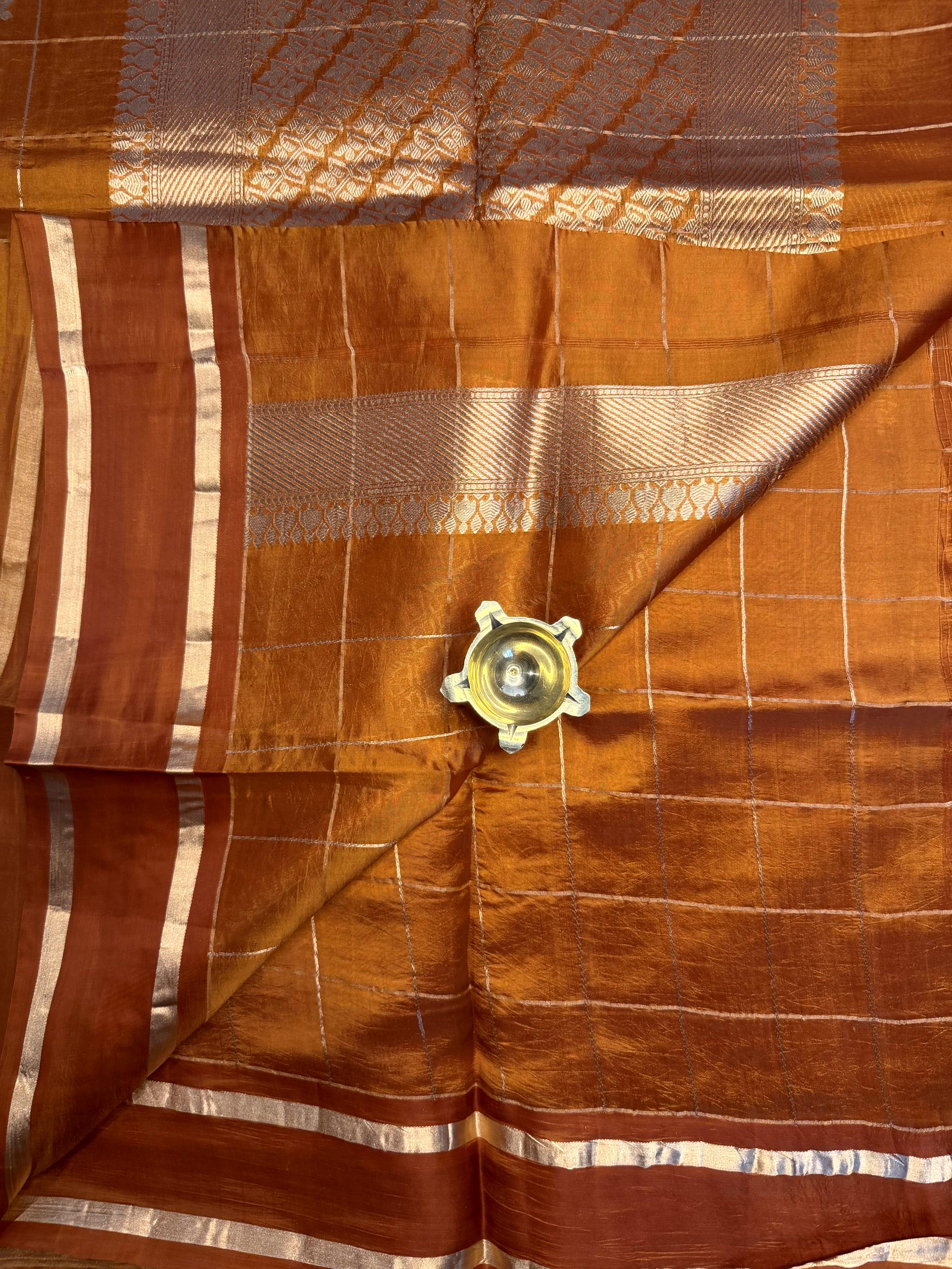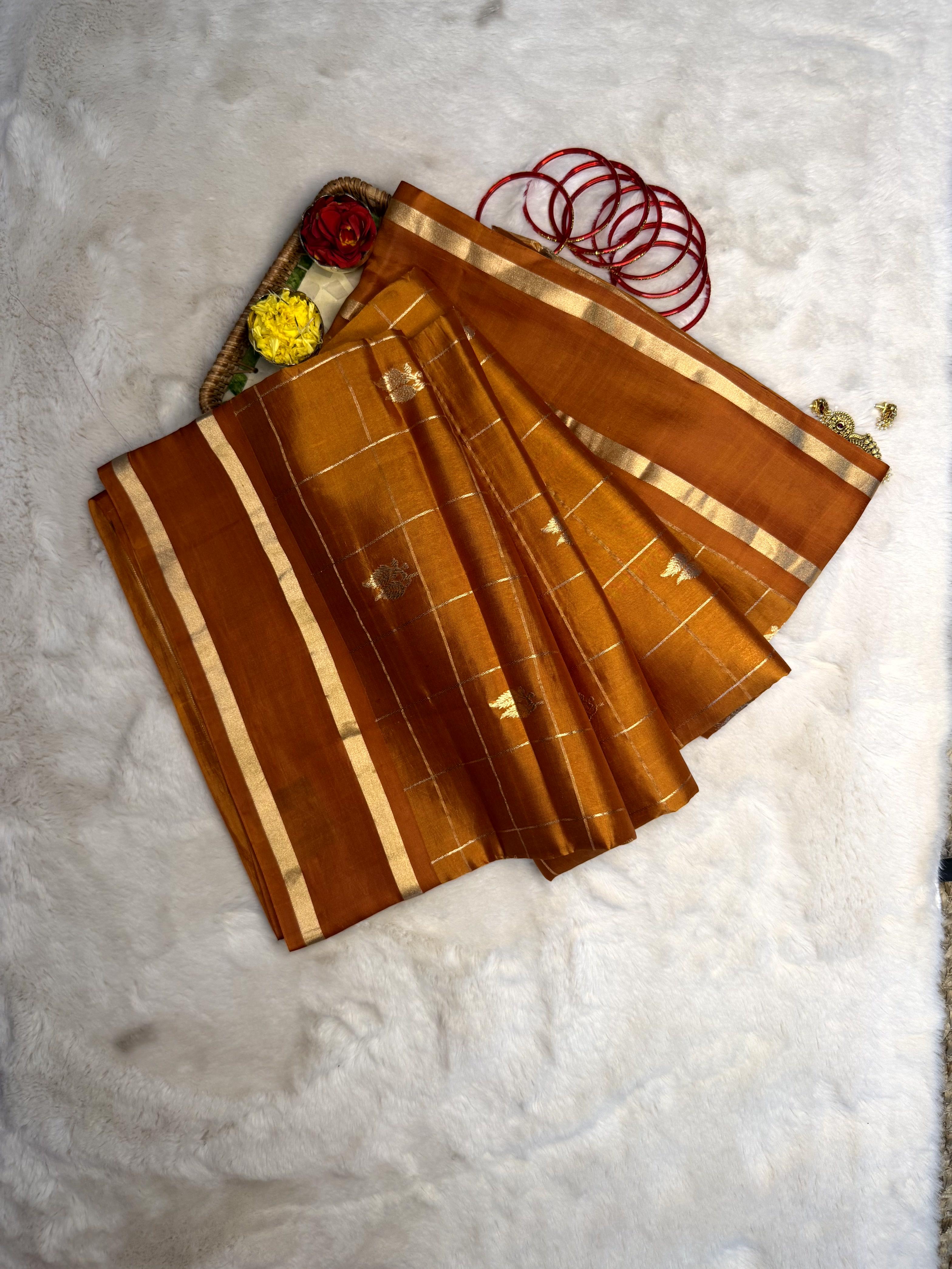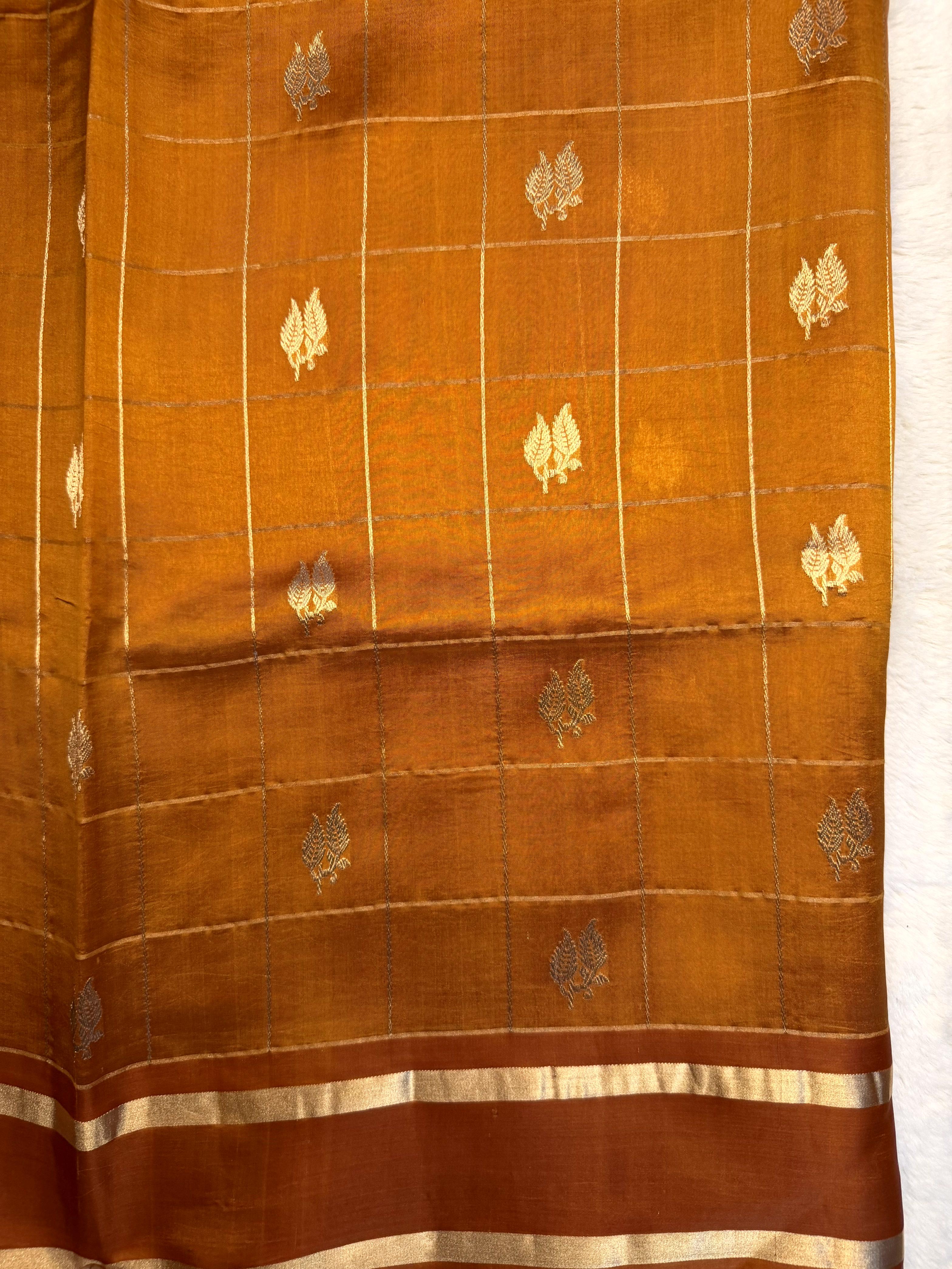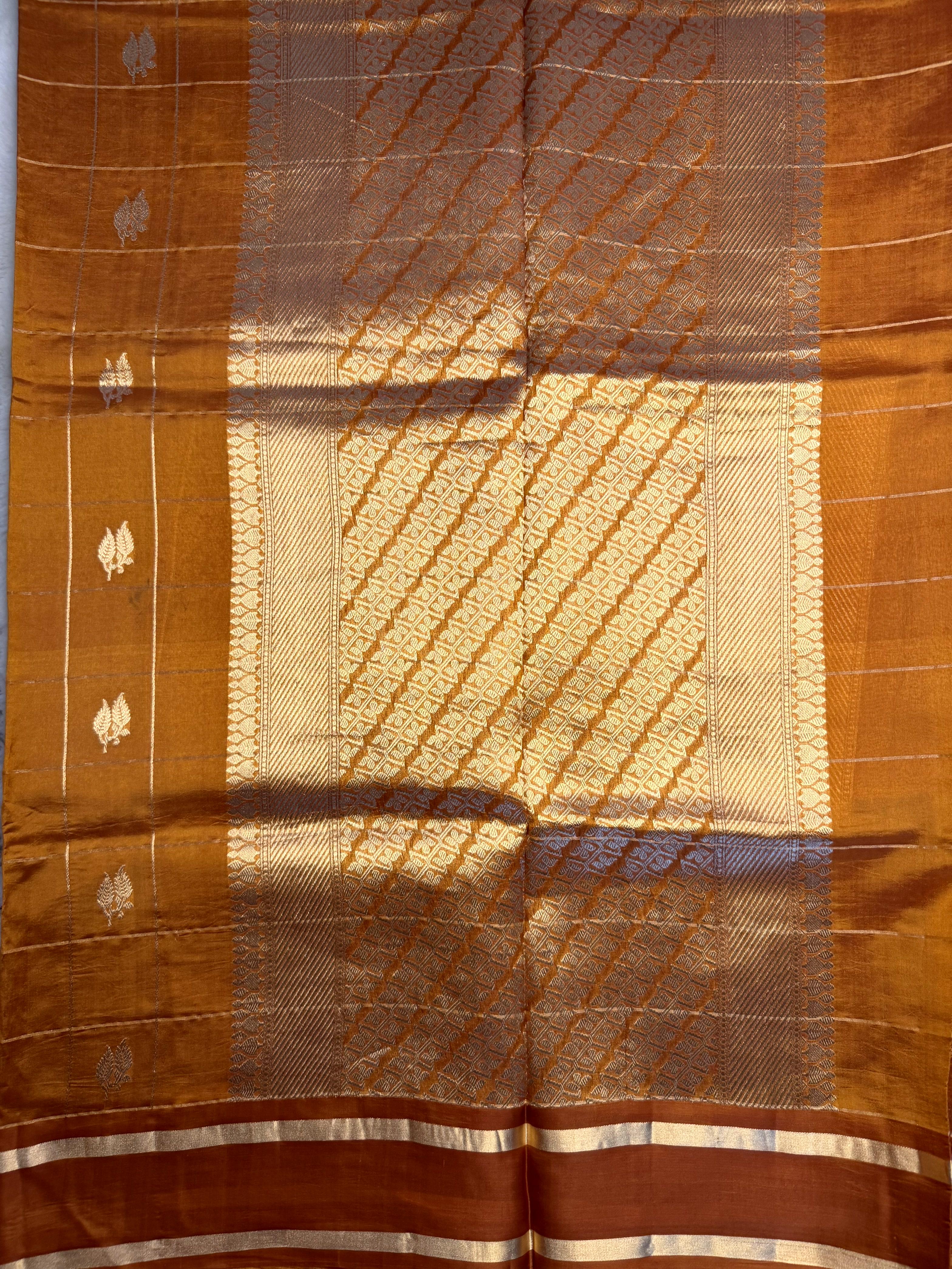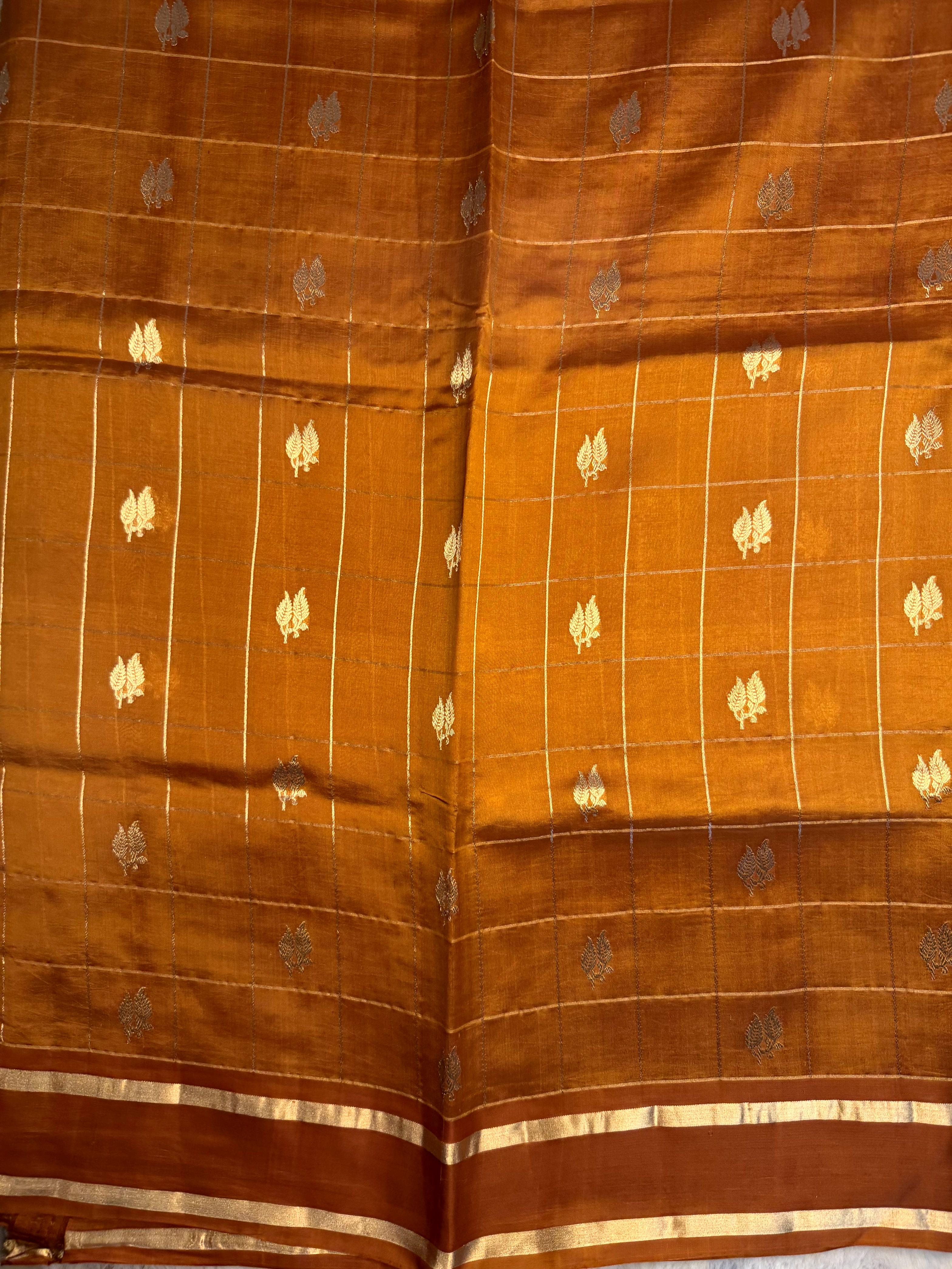 Bright, refined, and rooted in heritage, this pure Kora organza handloom saree features a warm mustard yellow body that radiates festive charm. The sheer, feather-light organza lends a crisp and graceful drape, allowing each pleat to hold its structure with effortless poise. The body is adorned with a subtle checks pattern, adding texture and traditional detailing without overwhelming the rich hue. A sleek bentex border frames the saree, bringing contrast and definition that enhances its overall beauty. A perfect blend of simplicity, craftsmanship, and heritage styling โ ideal for temple rituals, daytime festivities, and occasions where elegance speaks through detail rather than extravagance โจ๐
