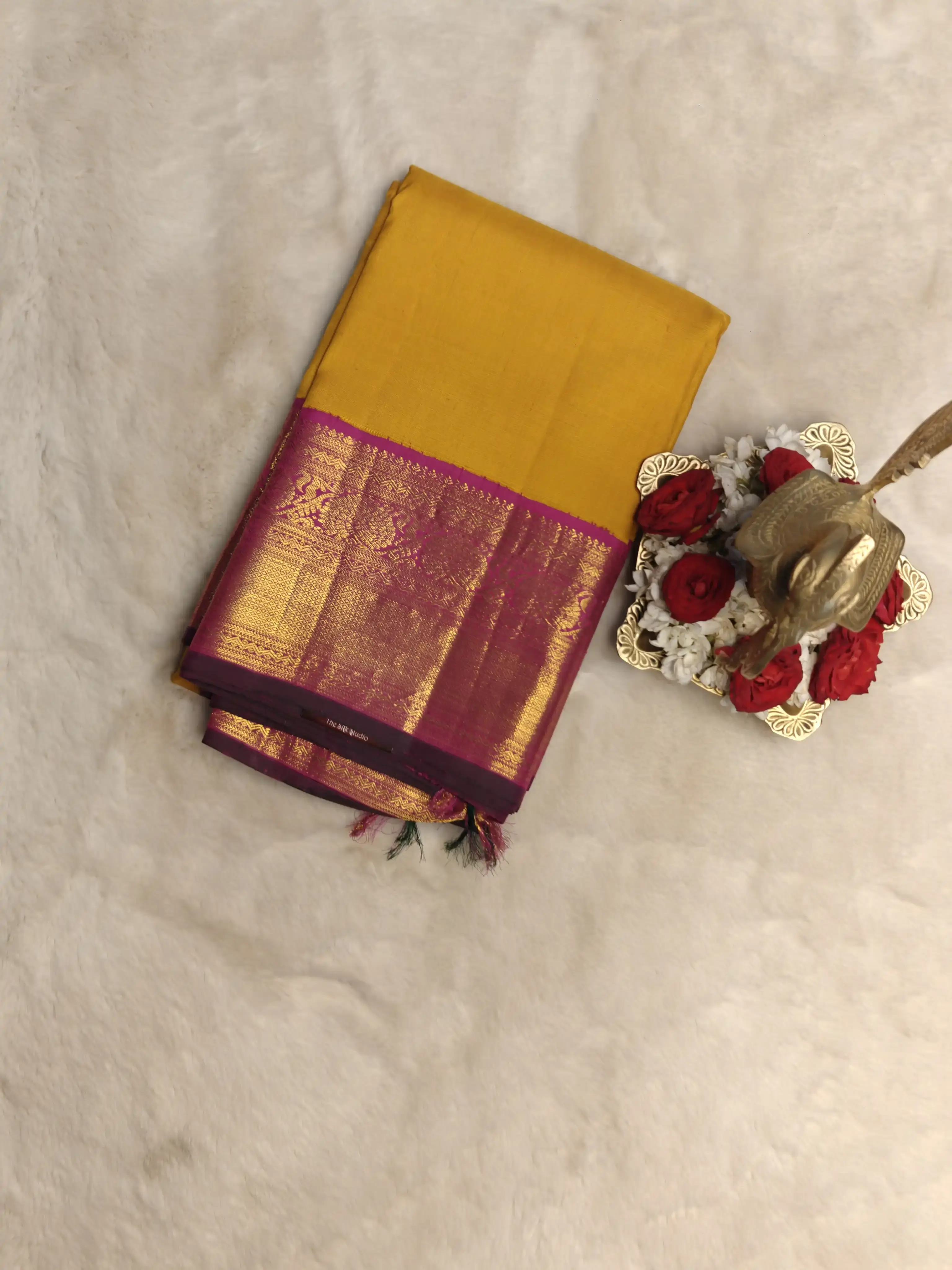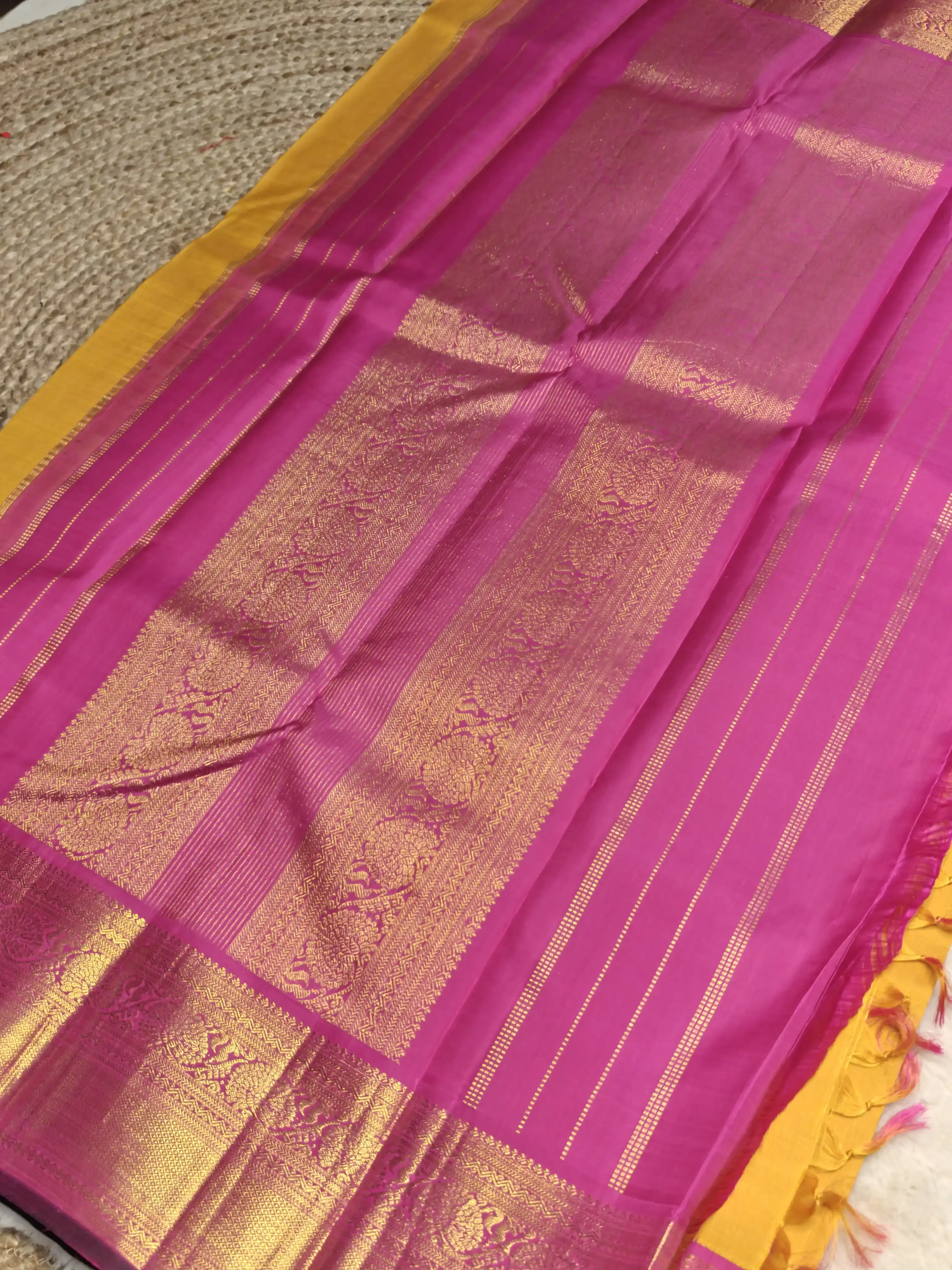 Mustard yellow with pink border silk saree