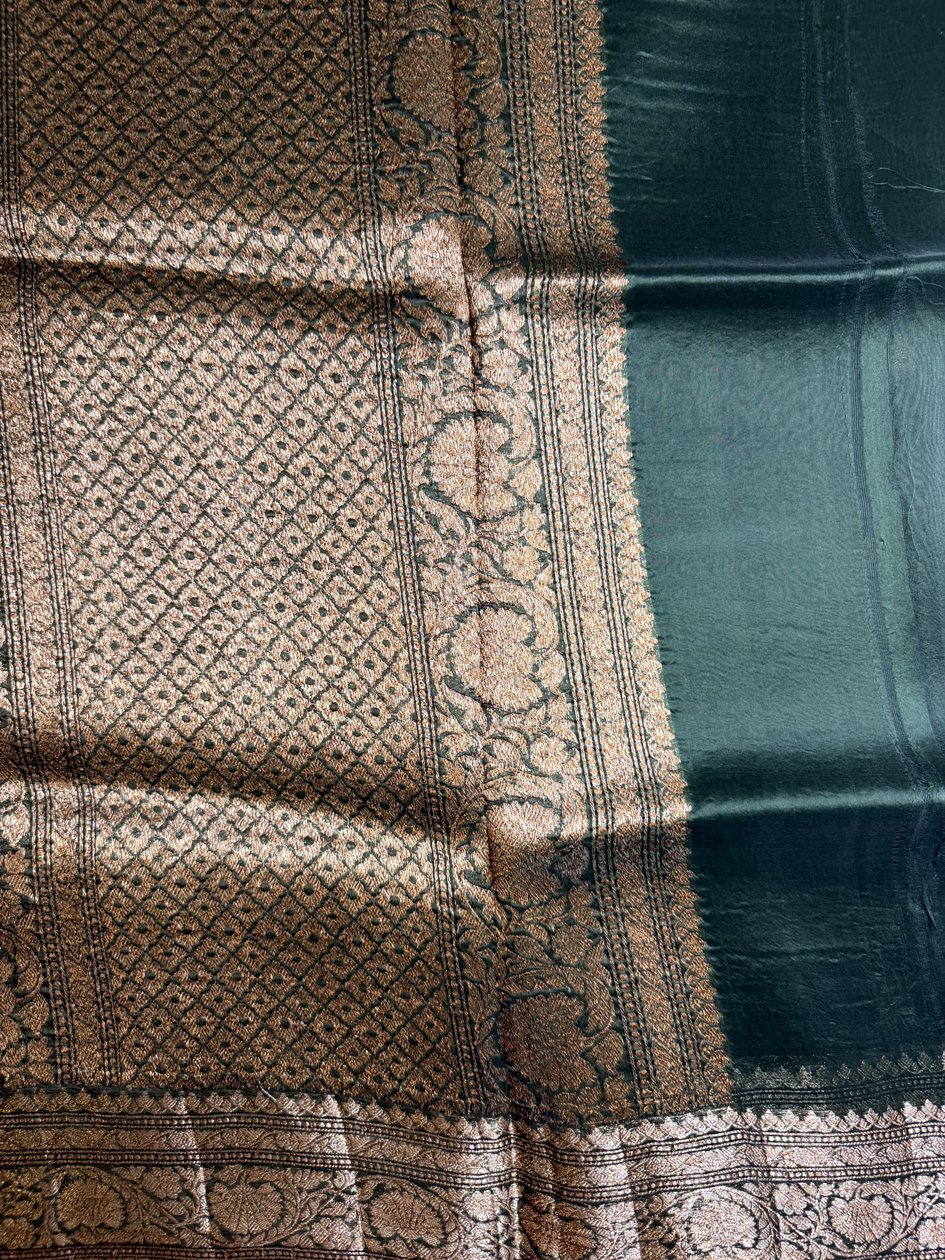 Olive Green antique zari pure kora organza saree