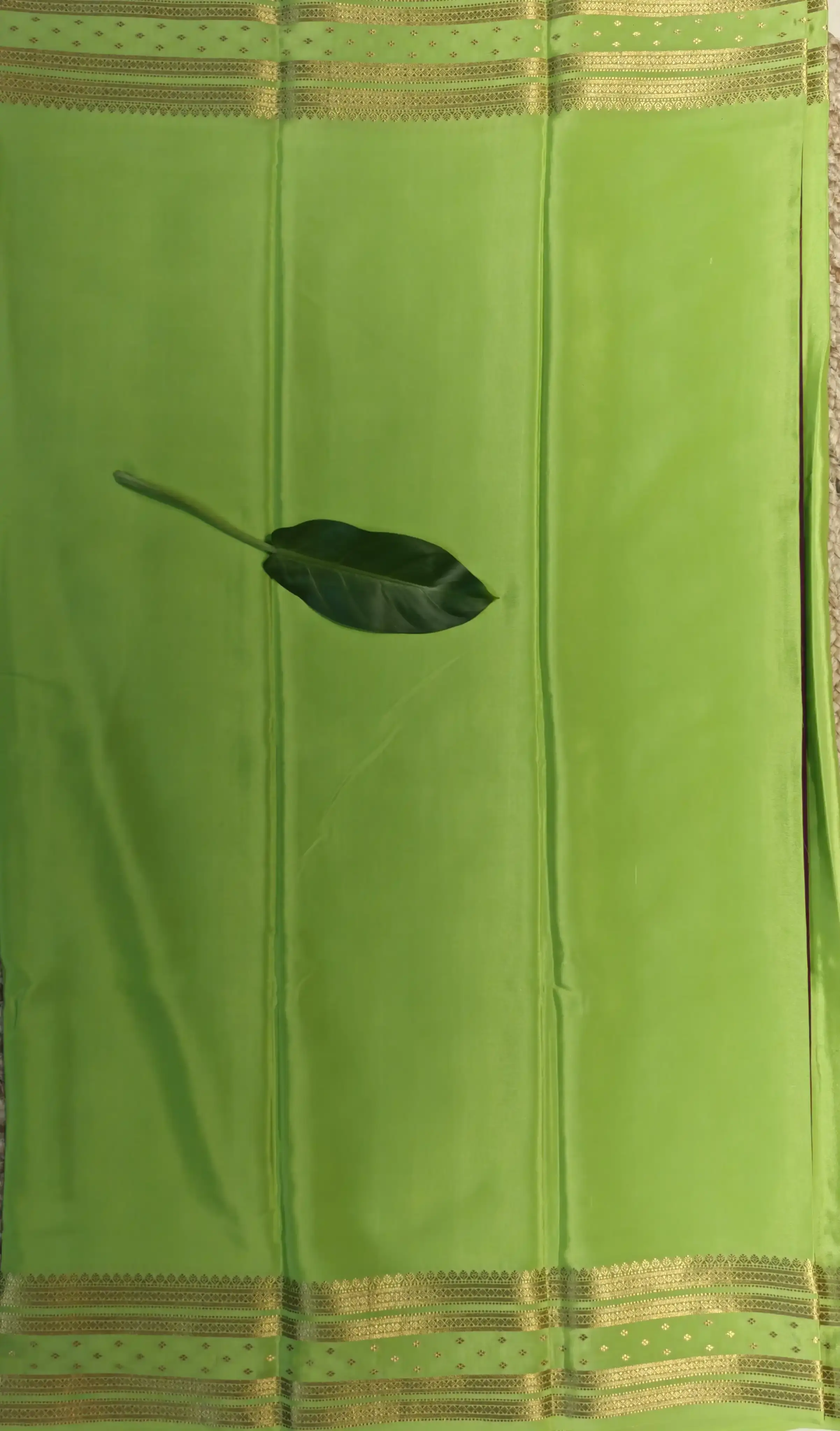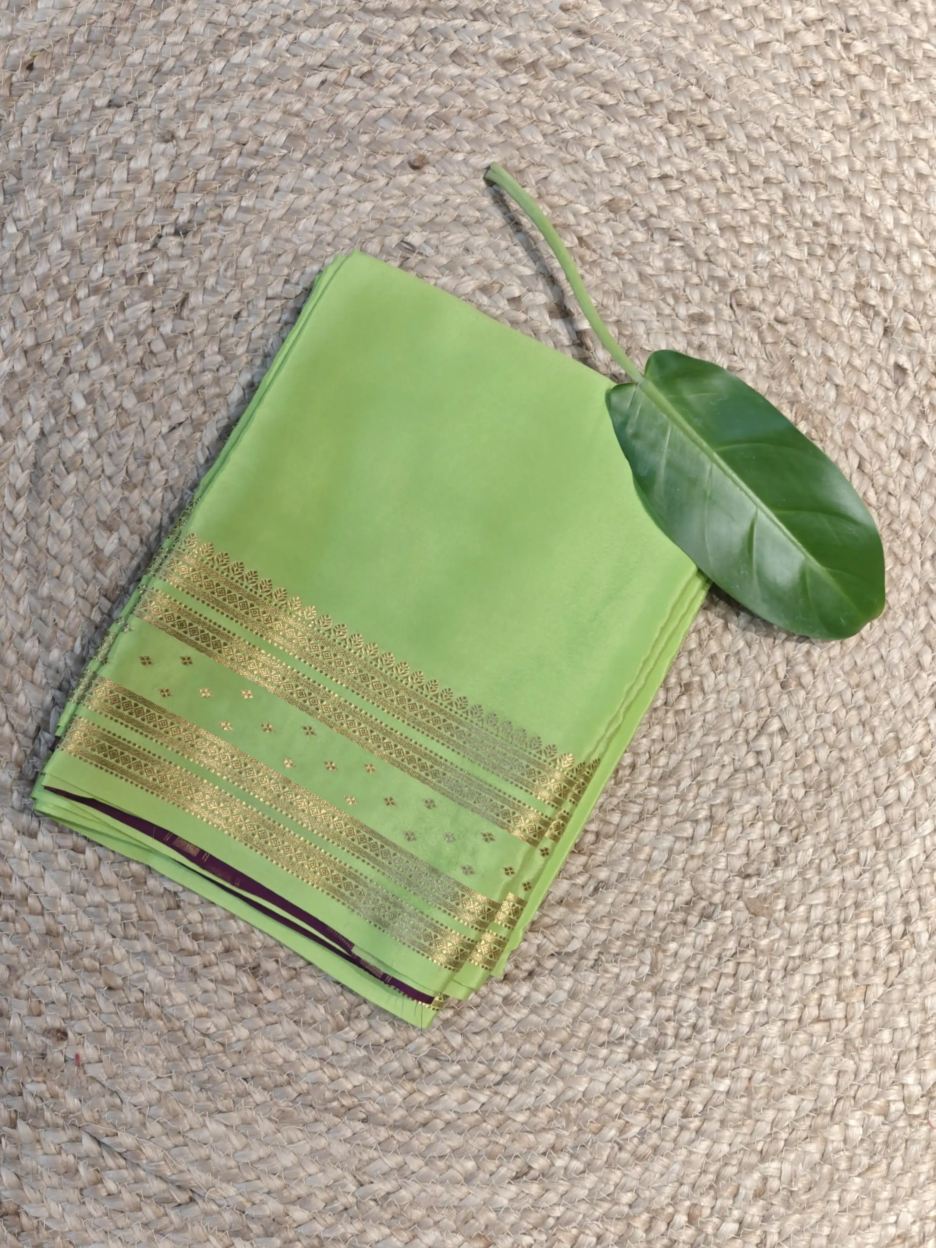 Timeless and gracefully understated, this pure Mysore crepe silk saree (120 GSM) in a parrot green body and magenta pallu and blouse is the epitome of classic elegance. The smooth, fluid drape and gentle natural sheen highlight the purity of the silk, while the plain body is beautifully complemented by a refined, elegant border.