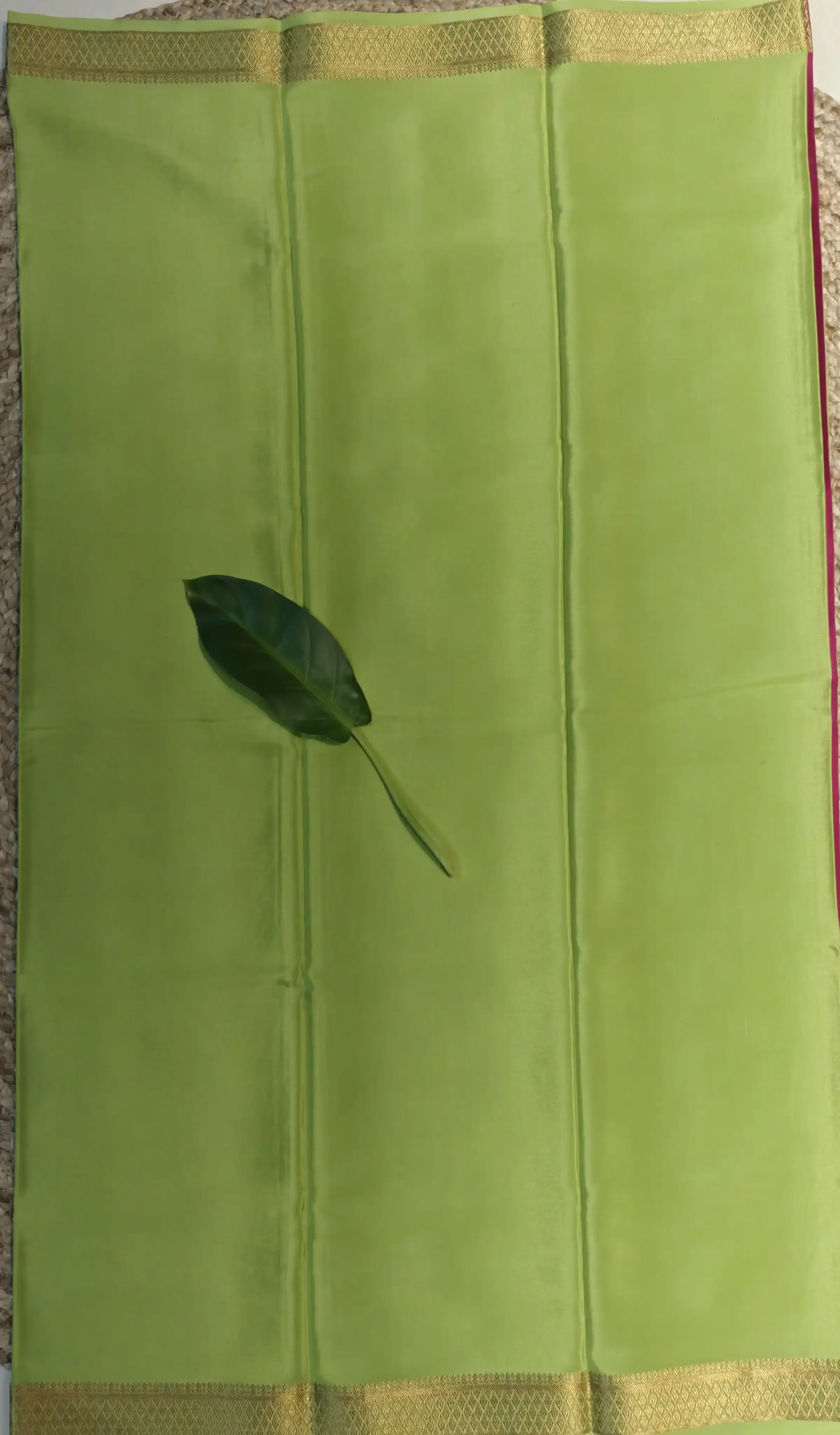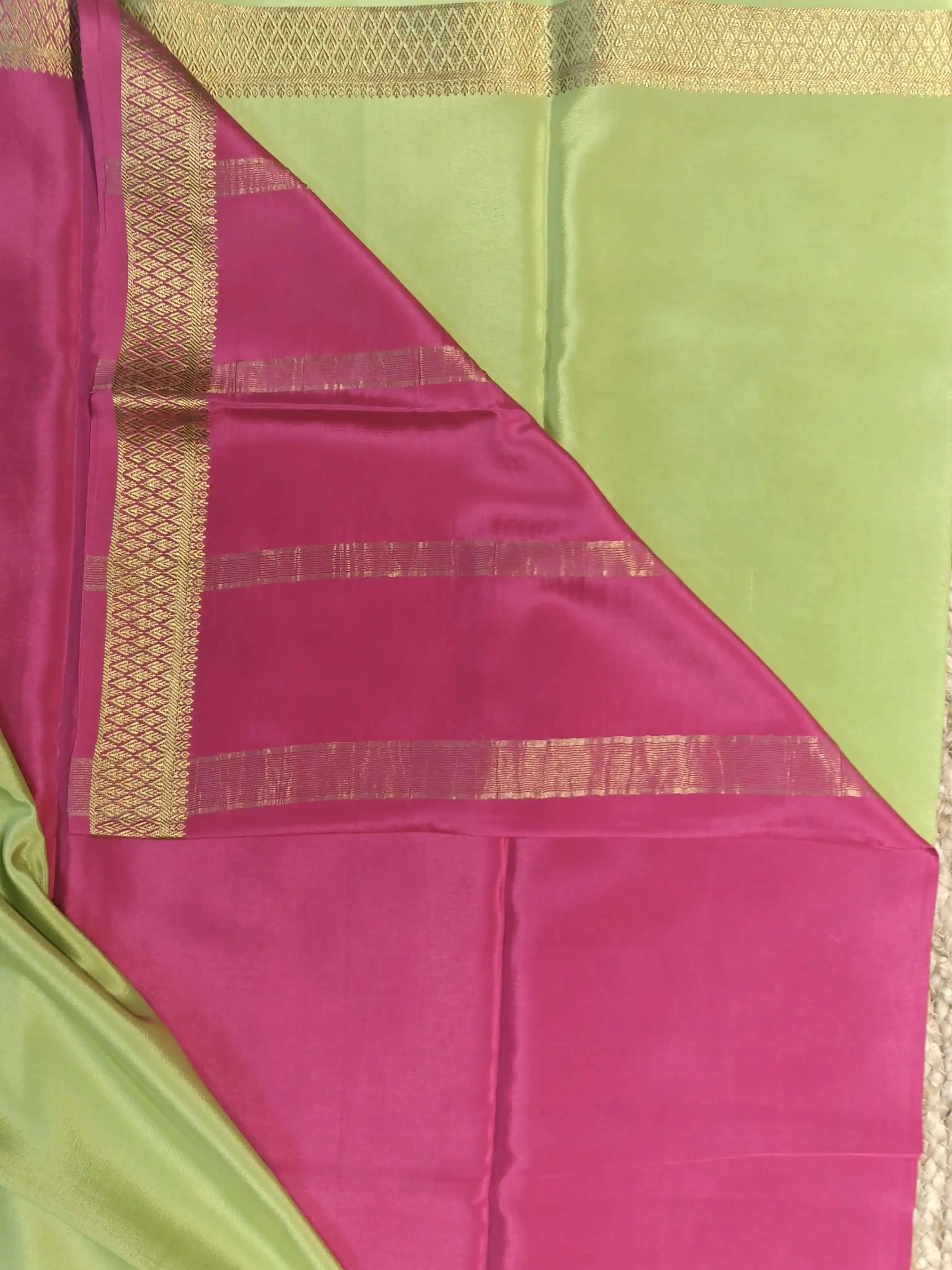Timeless and gracefully understated, this pure Mysore crepe silk saree (120 GSM) in a parrot green body and pink pallu and blouse is the epitome of classic elegance. The smooth, fluid drape and gentle natural sheen highlight the purity of the silk, while the plain body is beautifully complemented by a refined, elegant border.