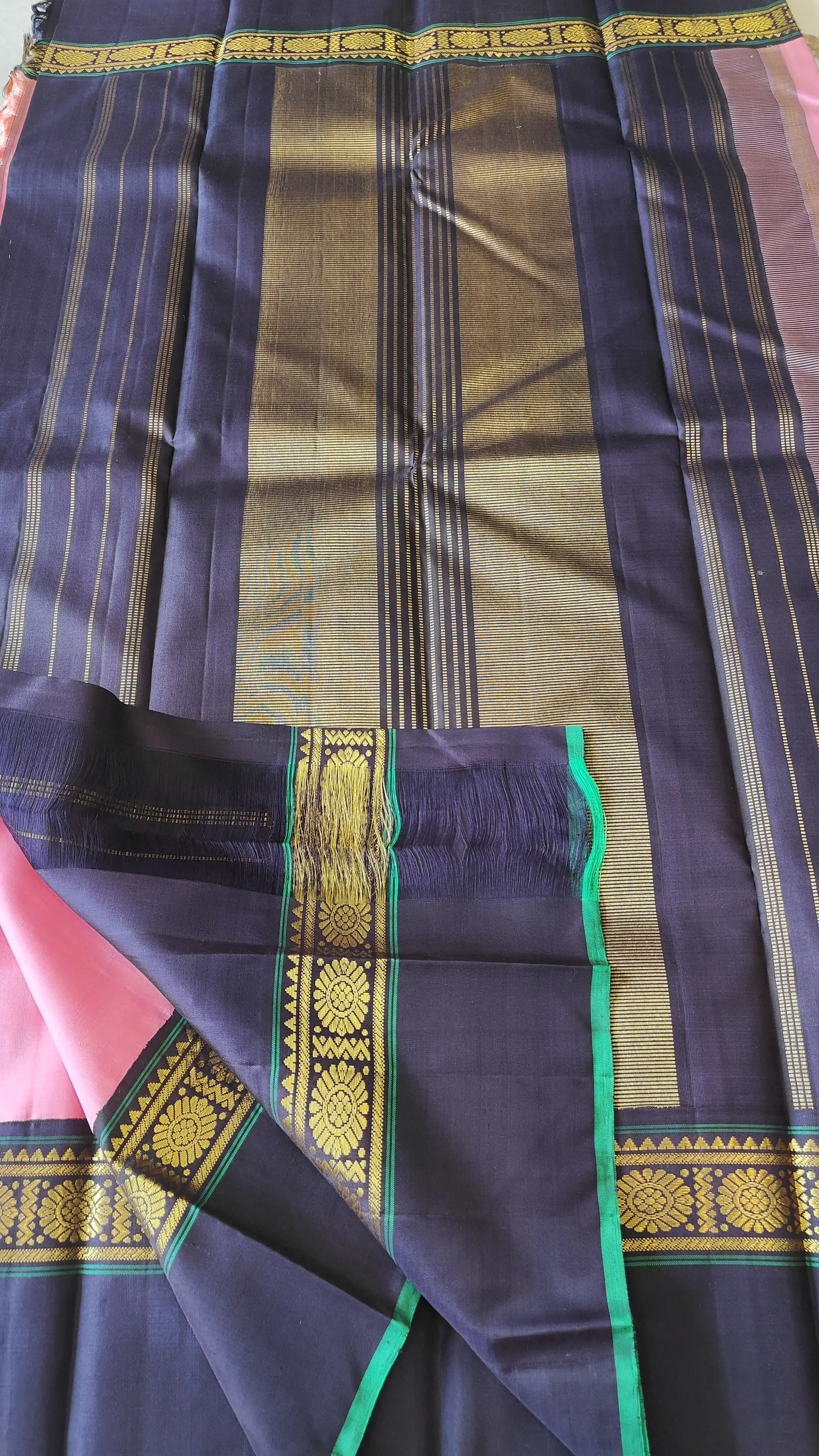A vision of understated elegance, this pure Kanchipuram silk saree in soft pink features a plain, luminous body that highlights the richness of authentic silk. Finished with a striking navy blue Bentex border, this drape blends minimal design with regal contrast—perfect for weddings, festive occasions, and timeless celebrations.