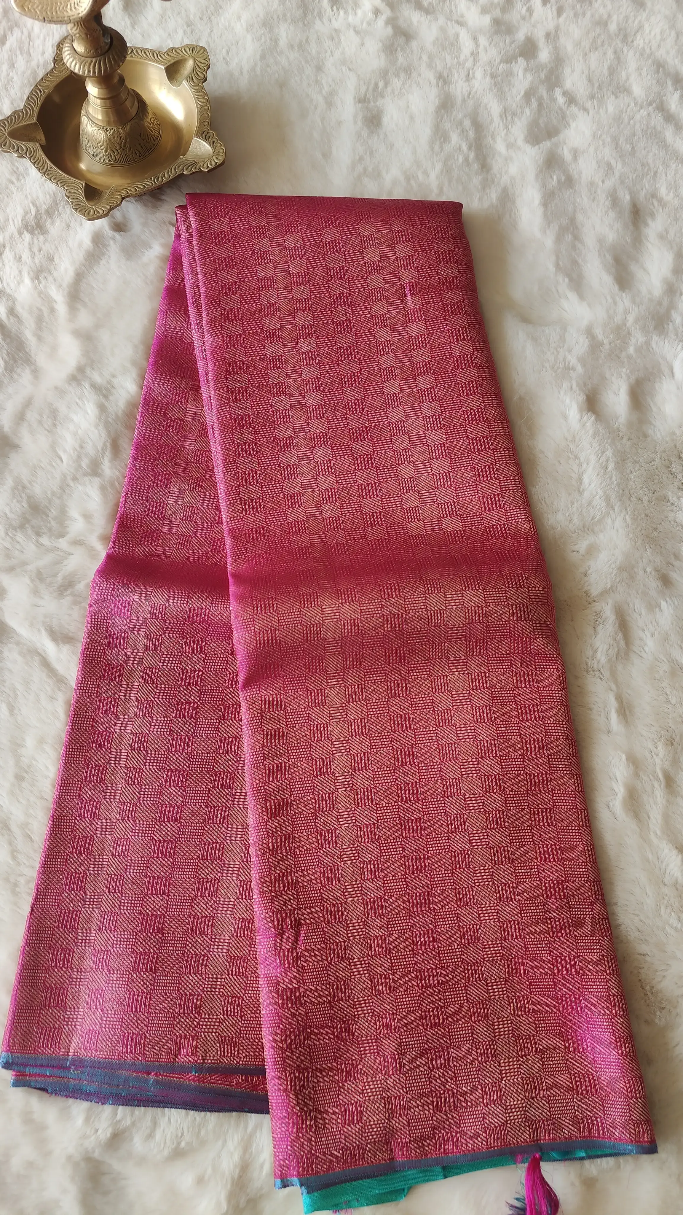 A striking blend of tradition and modern elegance, this pure Kanchipuram silk saree features a pink body richly woven in full zari, creating a luminous, borderless silhouette. The contrasting royal blue pallu adds depth and drama, making this drape a bold expression of timeless luxury.