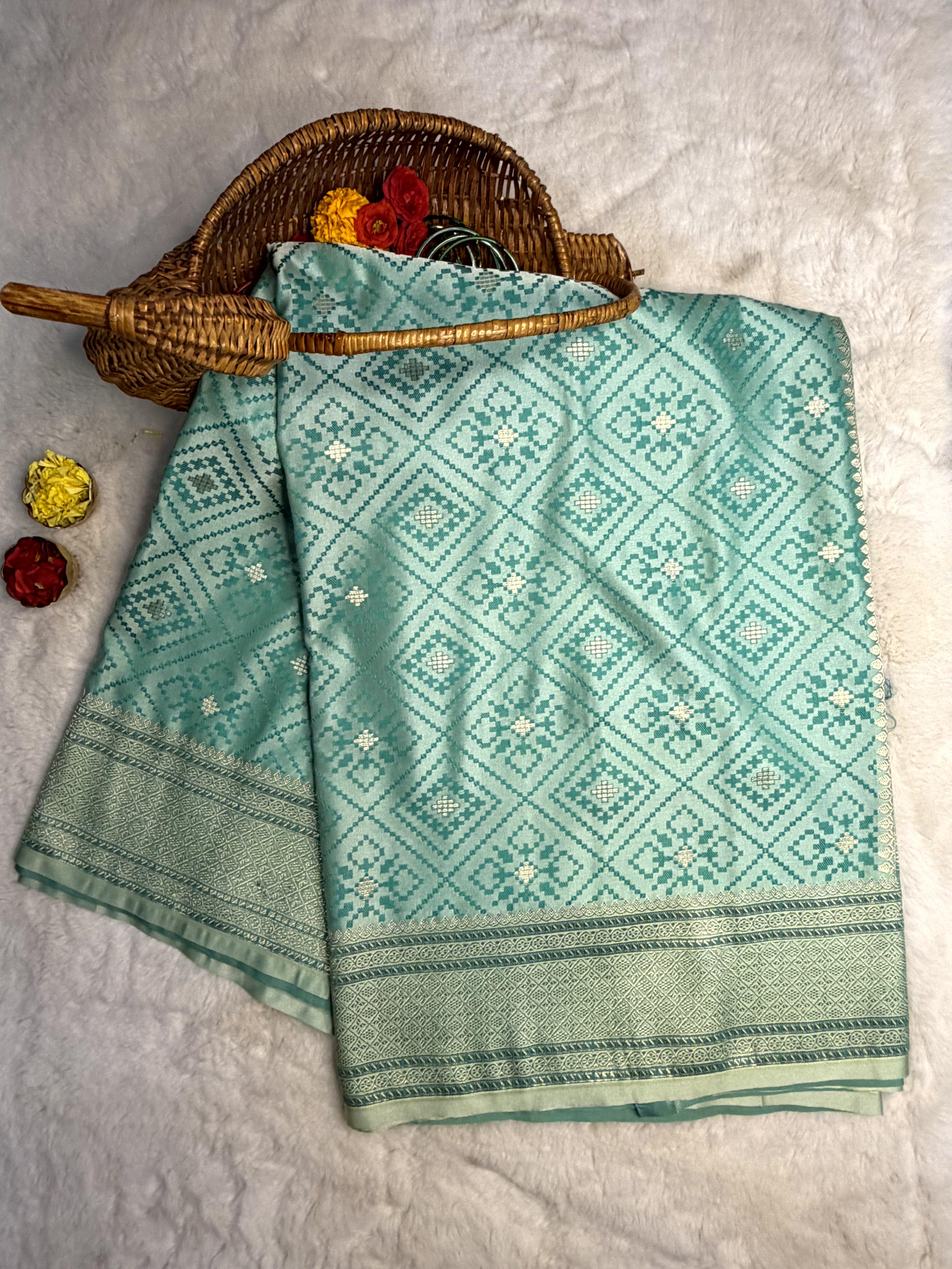 This pista green Benaras saree is beautifully highlighted with silver woven designs along the border and pallu, adding a touch of refined shimmer and traditional craftsmanship. The soothing pastel tone paired with intricate metallic detailing creates a graceful festive look. Perfect for weddings, receptions, and cultural celebrations, this saree exudes timeless charm with a modern, luxurious appeal 💚✨
