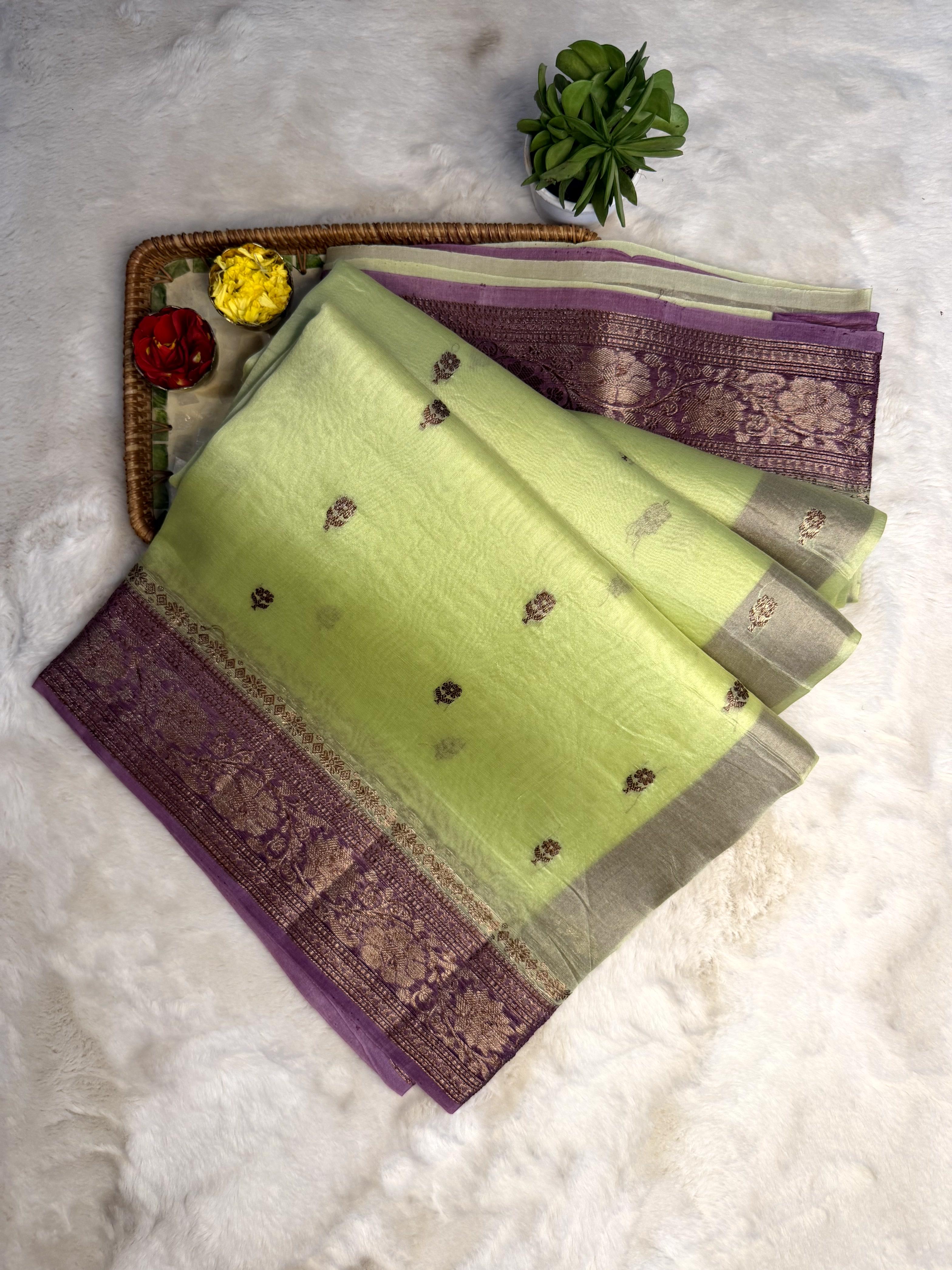 A vision of regal finesse, this pure Kora organza saree shines in serene pista green, paired with a striking pink border that adds a noble contrast. The sheer, feather-light texture allows the drape to glide with aristocratic grace, while the intricately woven antique zari brings a vintage golden luster reminiscent of royal heirlooms. Elegant, poised, and richly detailed โ this masterpiece bridges heritage weaving with contemporary color play, making it the perfect choice for celebrations that call for refined grandeur and timeless sophistication โจ๐๐