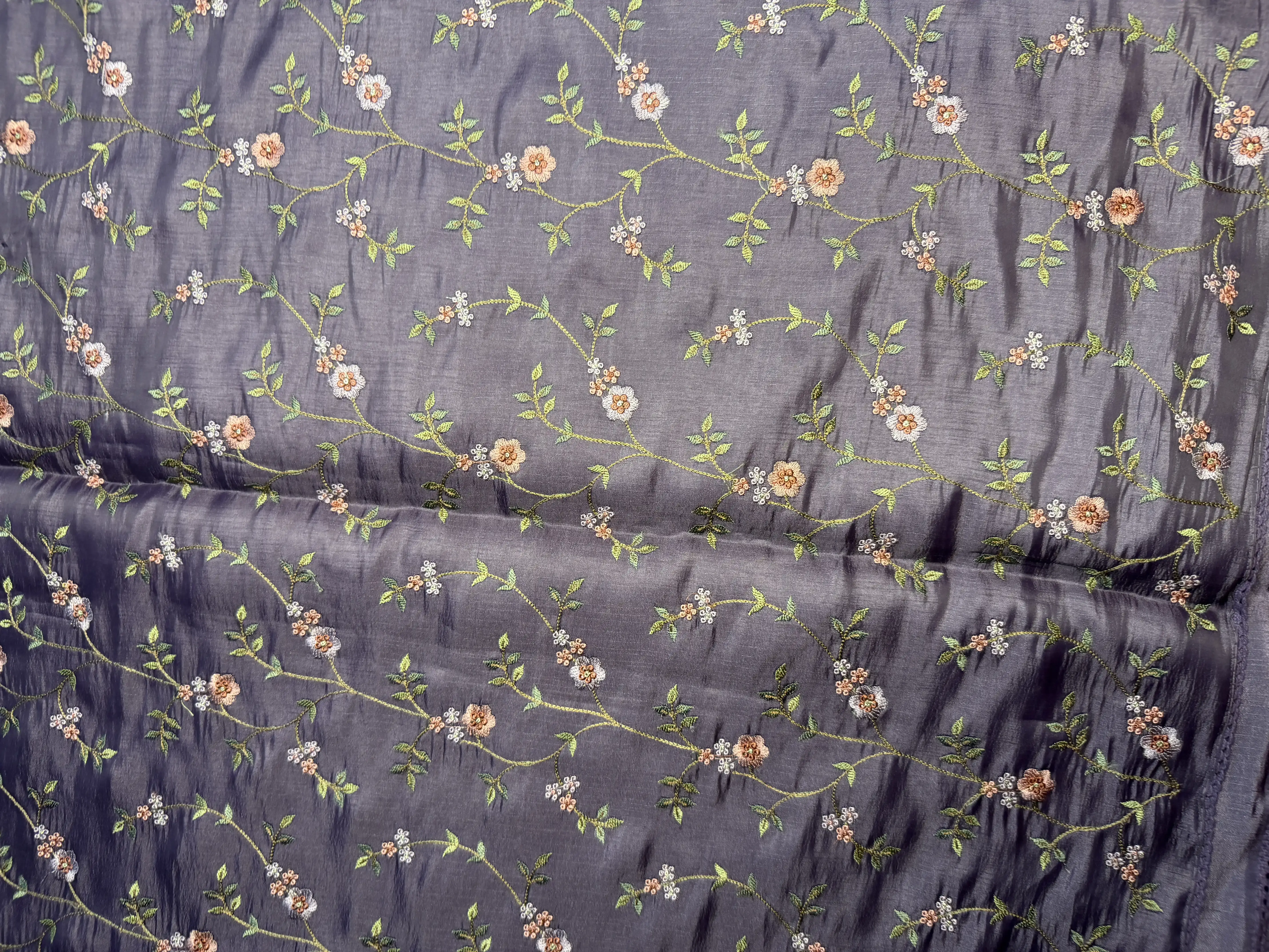 This purple saree is adorned with all-over floral thread work, celebrating fine craftsmanship and timeless elegance. The delicate floral patterns spread across the body add depth and texture, while the rich purple hue lends a regal and sophisticated charm.