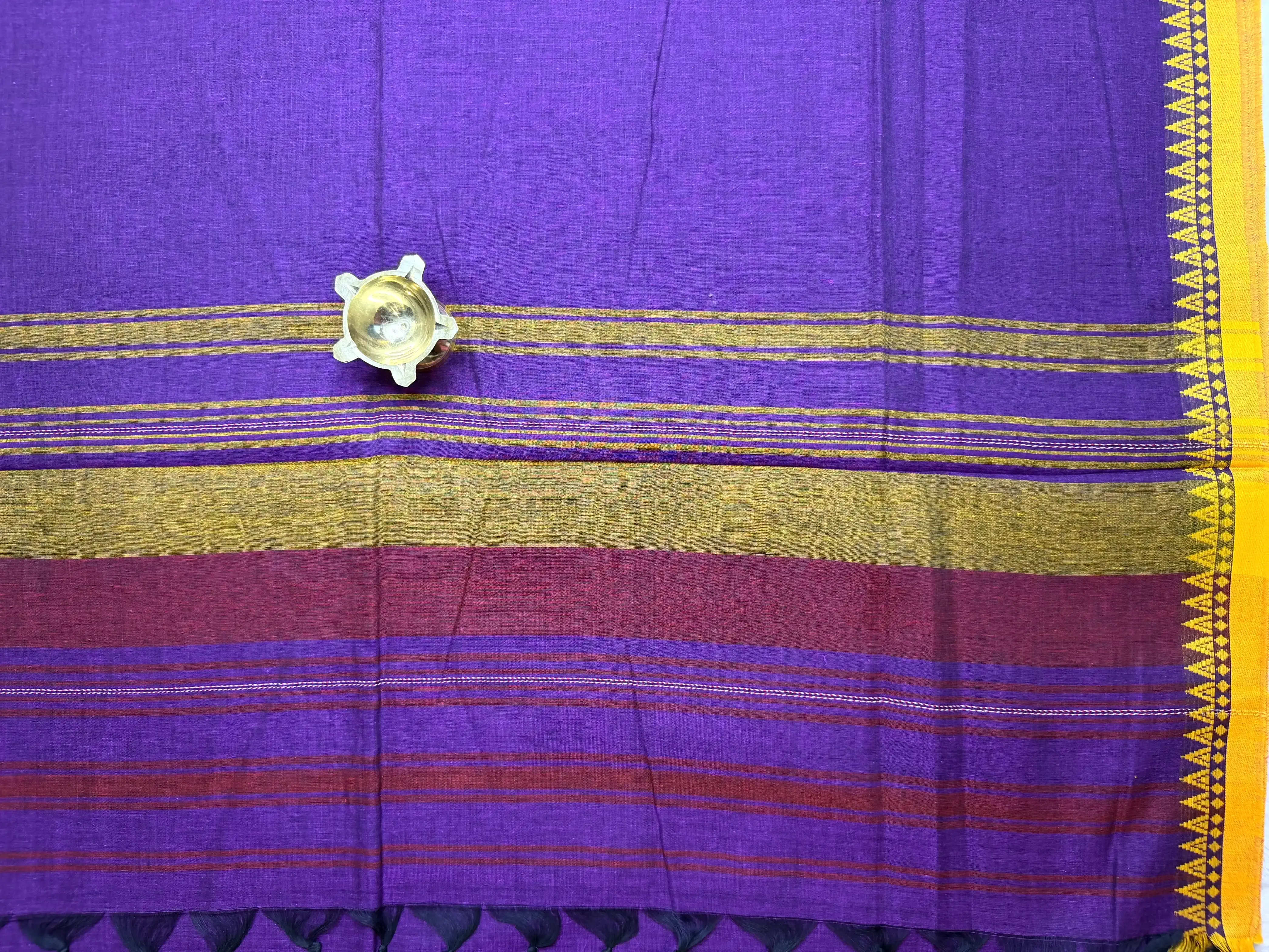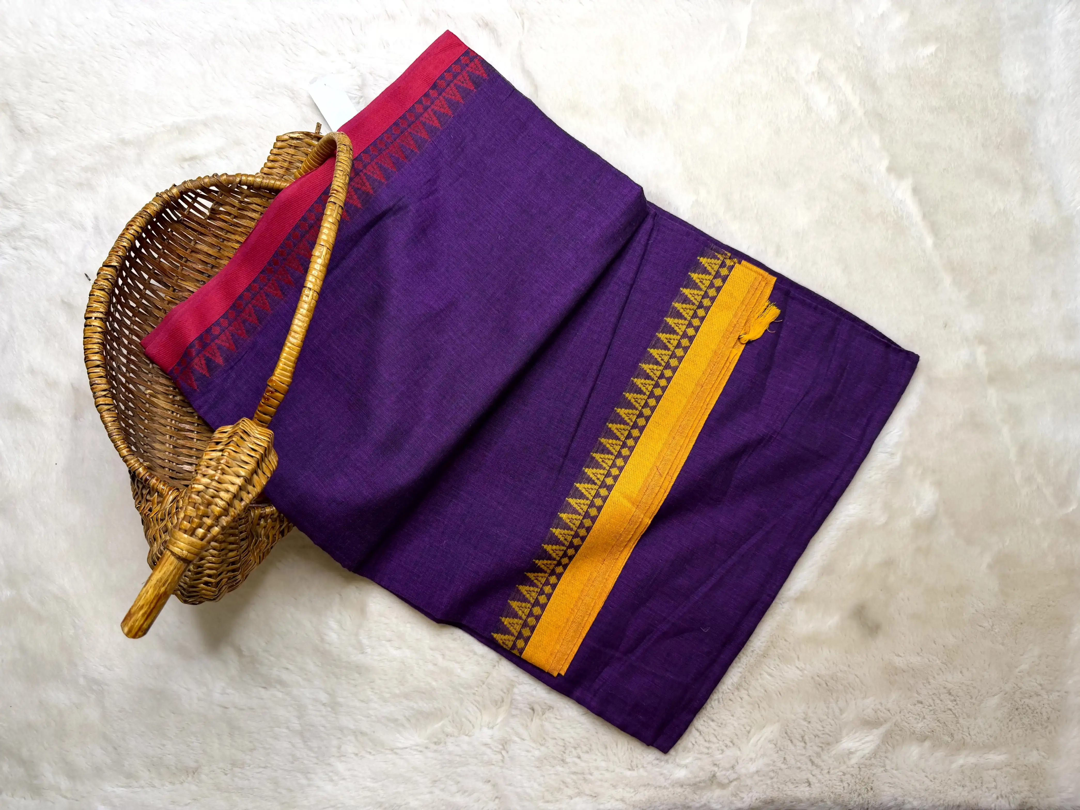This purple Dhaniakhali cotton saree features the striking Ganga-Jamuna border, creating a beautiful dual-tone contrast that elevates its heritage charm. Crafted from soft, breathable cotton, it drapes with ease and suits both daily wear and cultural occasions.