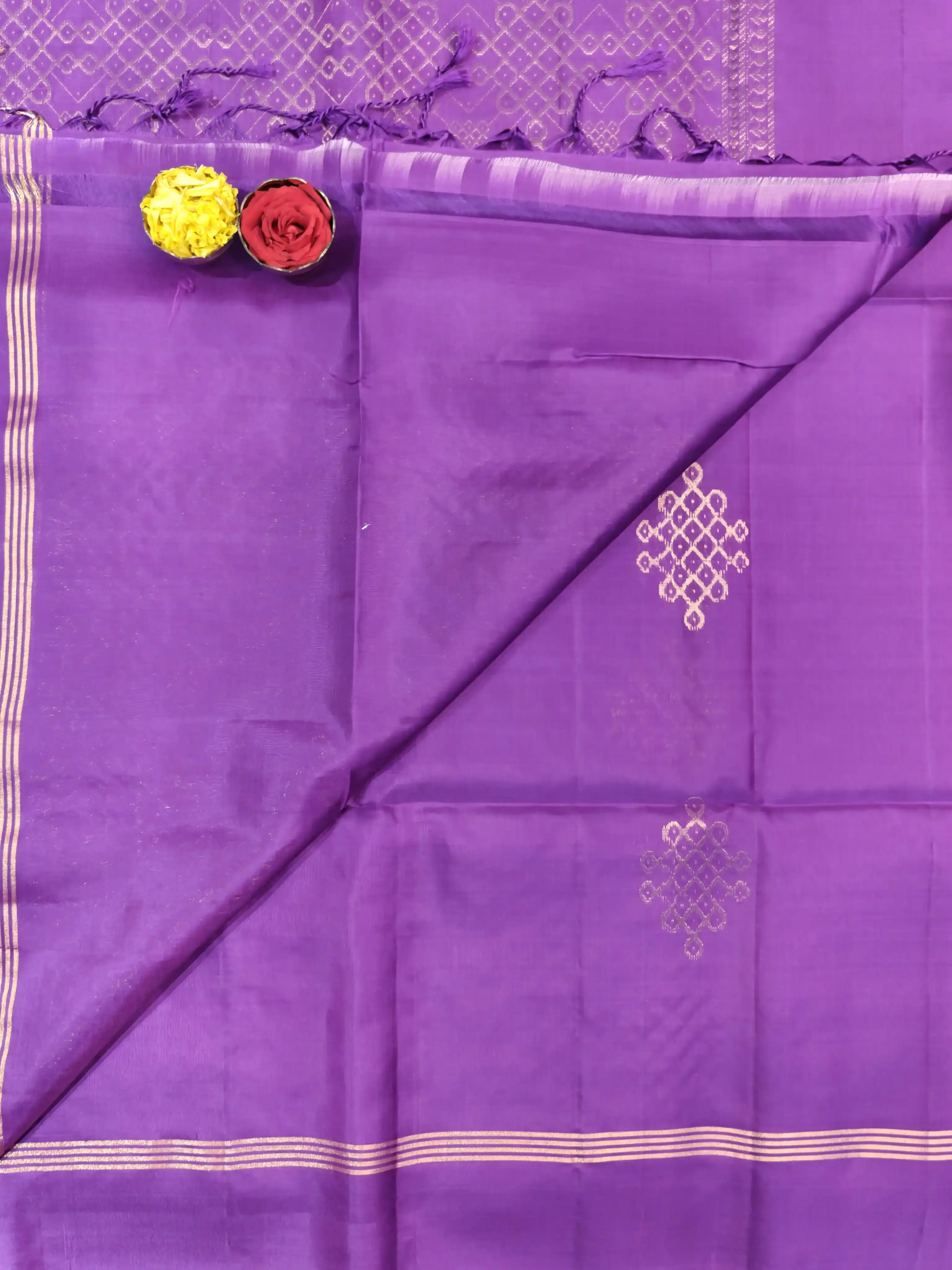 This purple soft silk saree features intricate kolam designs woven throughout, symbolizing cultural artistry and auspiciousness. Accented with a classic kaddi border, the saree balances detailed craftsmanship with structured elegance. Ideal for festive occasions and traditional celebrations, this saree brings timeless charm with a contemporary edge 💜